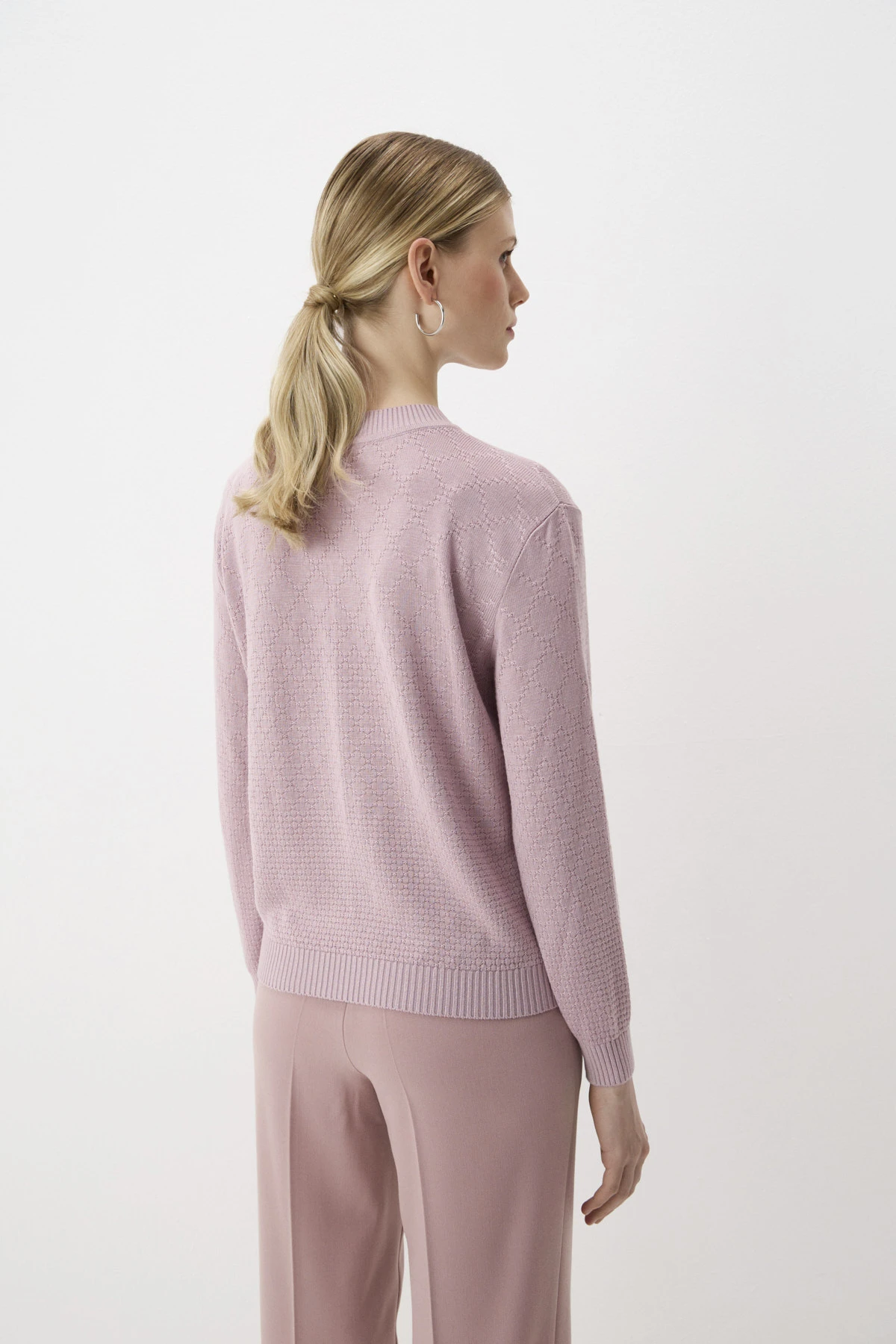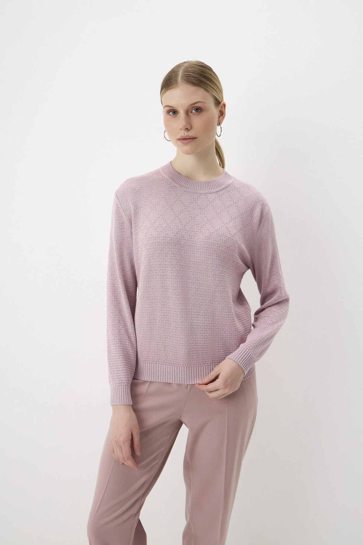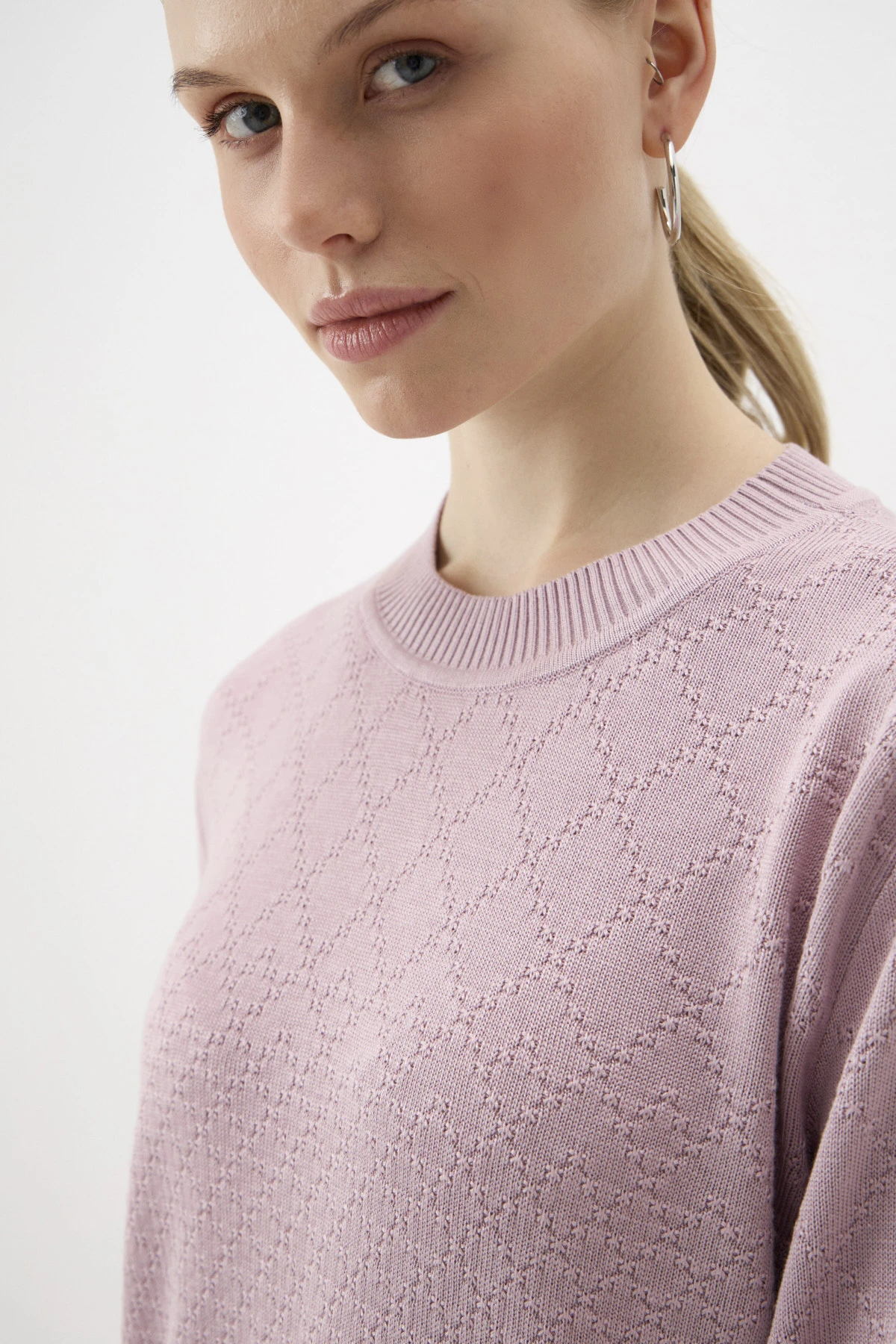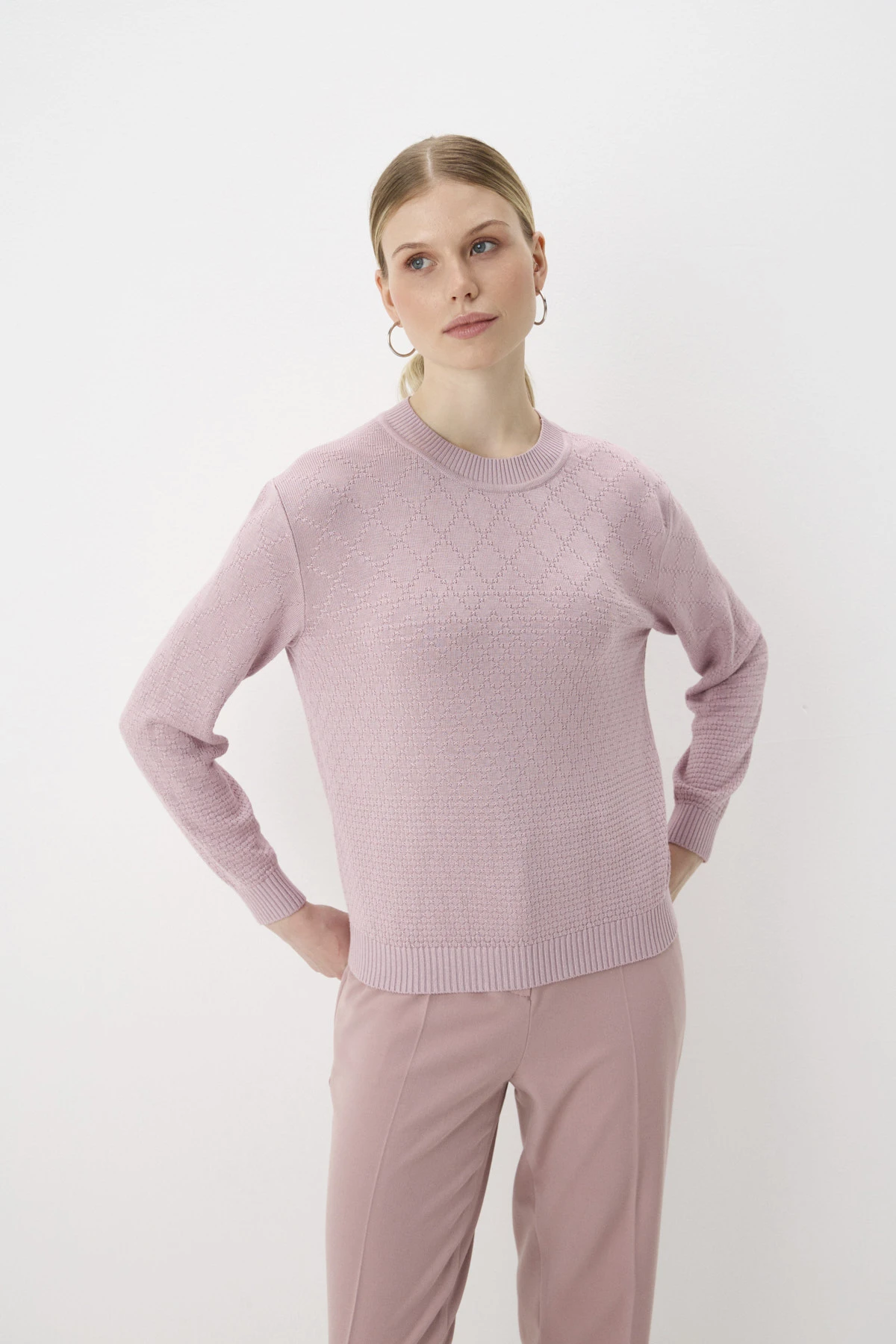 Монохромный джемпер прямого силуэта из 100% вискозы в пудровом оттенке. Трикотажное полотно сплетено узором «ромб», который уменьшает свой масштаб к низу изделия, создавая акцент на талии. Спущенная линия плеча создаёт расслабленный образ. Круглый вырез горловины, манжеты и низ джемпера оформлены вязкой в «рубчик». По спинке – брендированное сердечко из шлифованного металла.