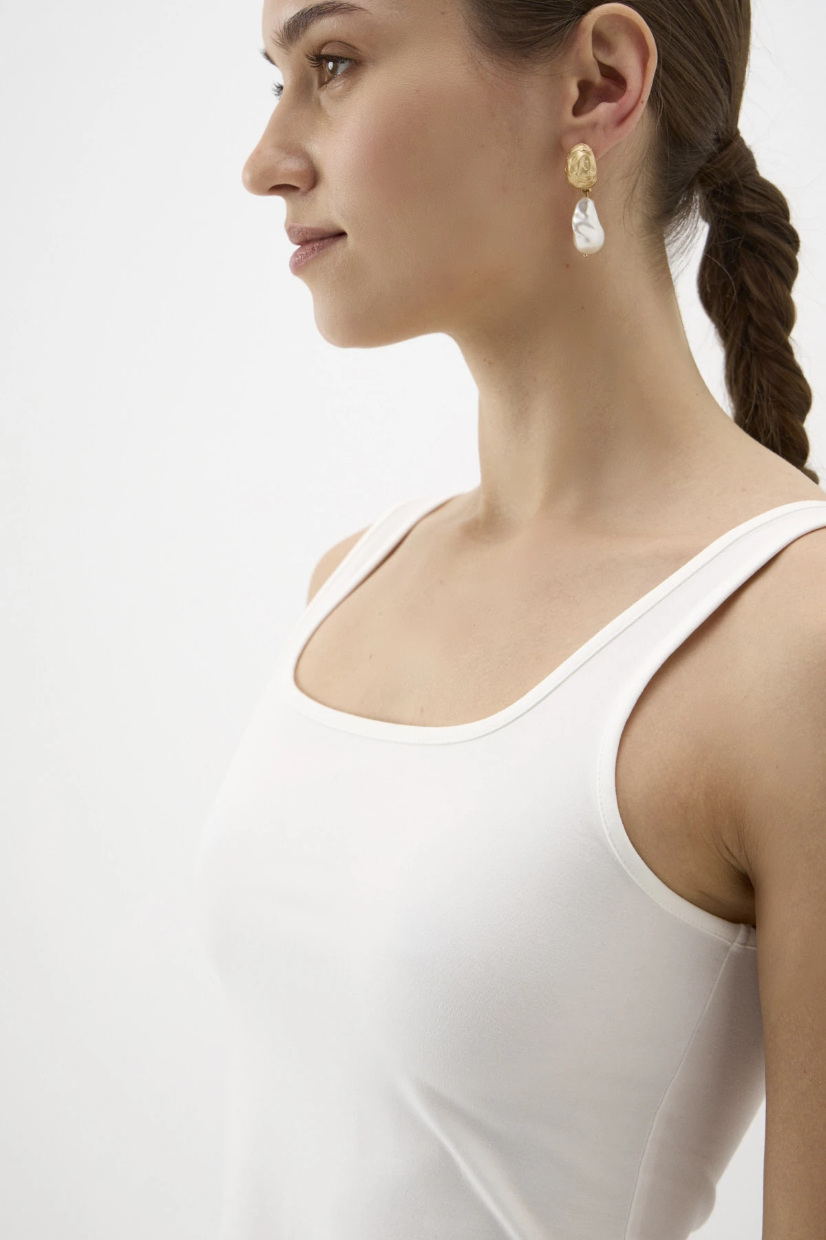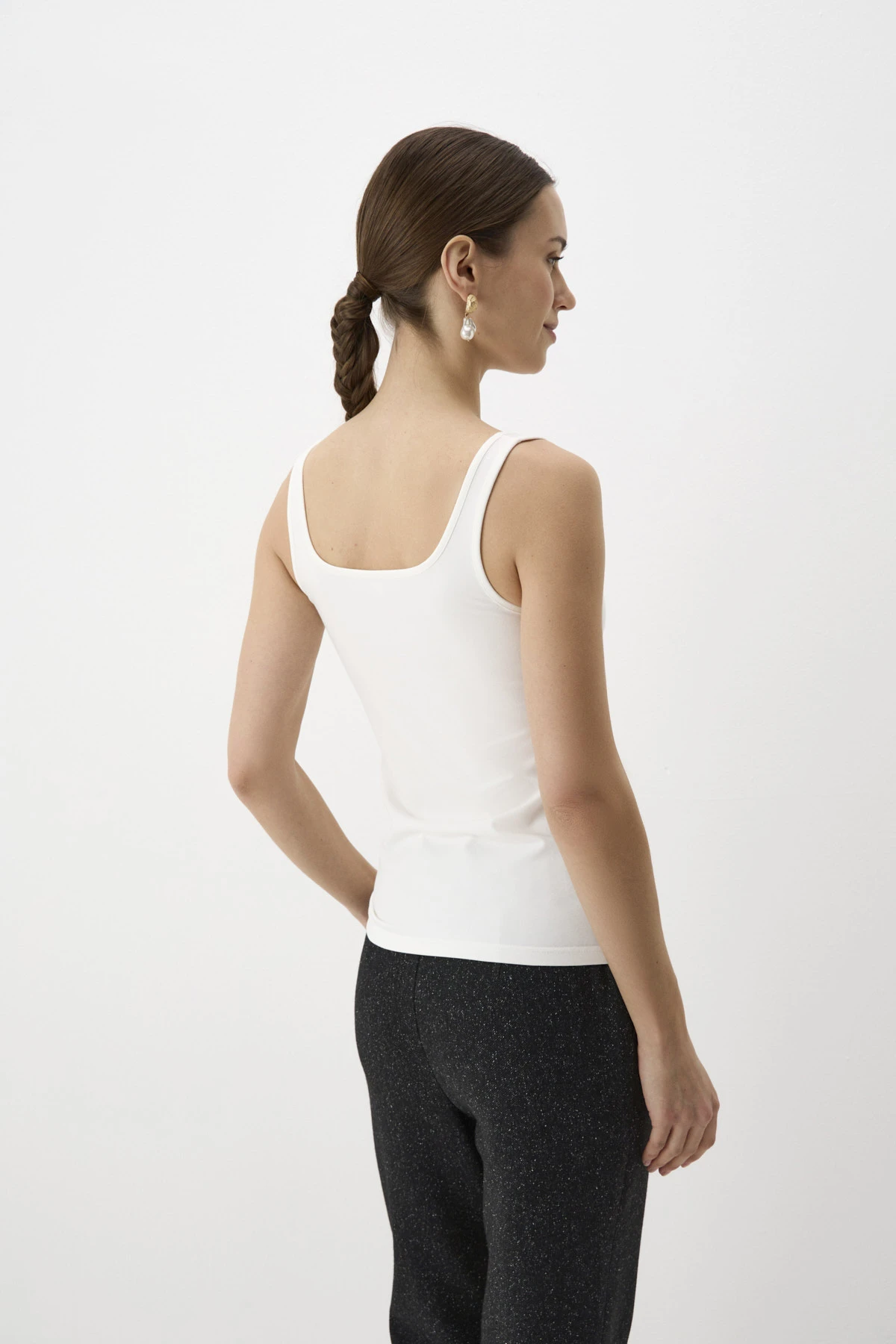 Топ широких бретелях с глубокими вырезами-«каре» по переду и спинке. Модель выполнена из тактильно приятной эластичной ткани на основе гигроскопичных хлопка и модала в молочном оттенке.