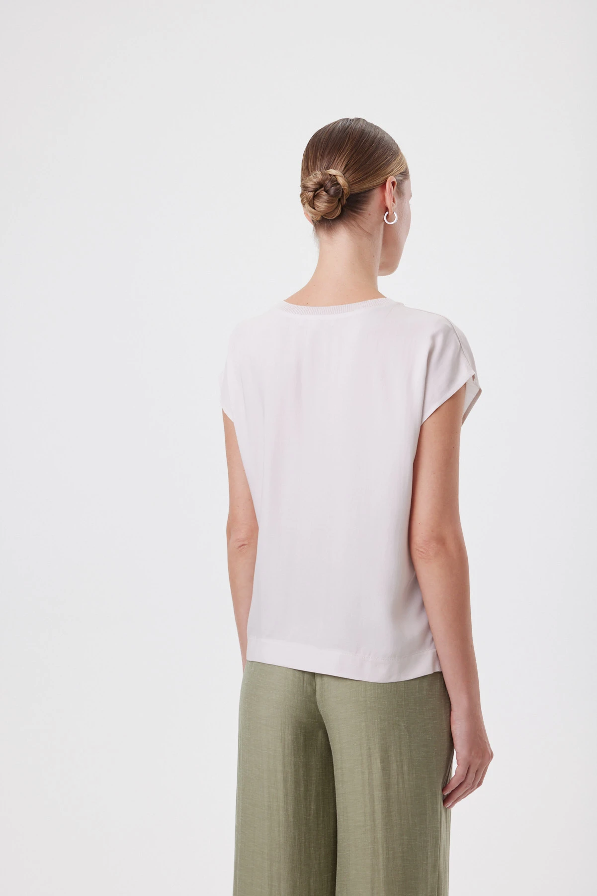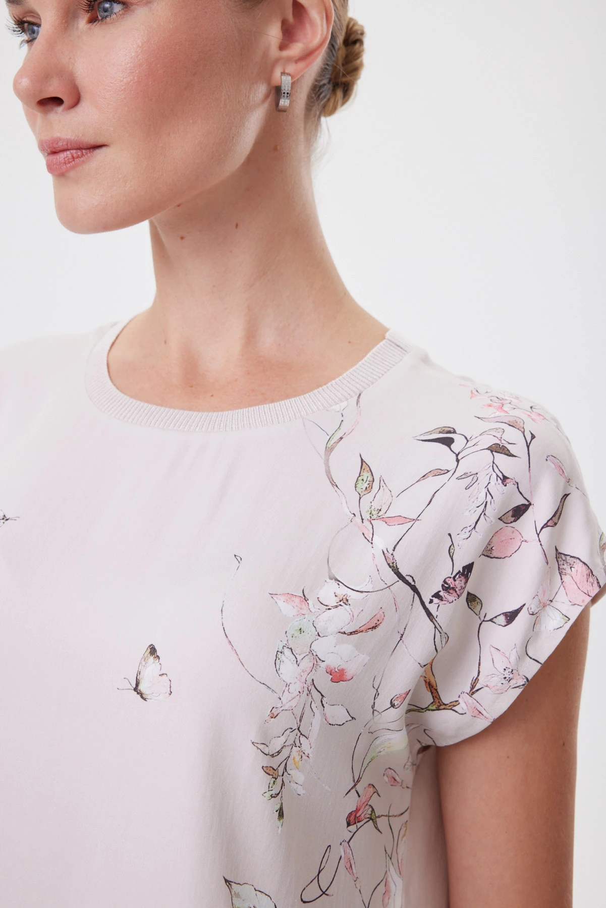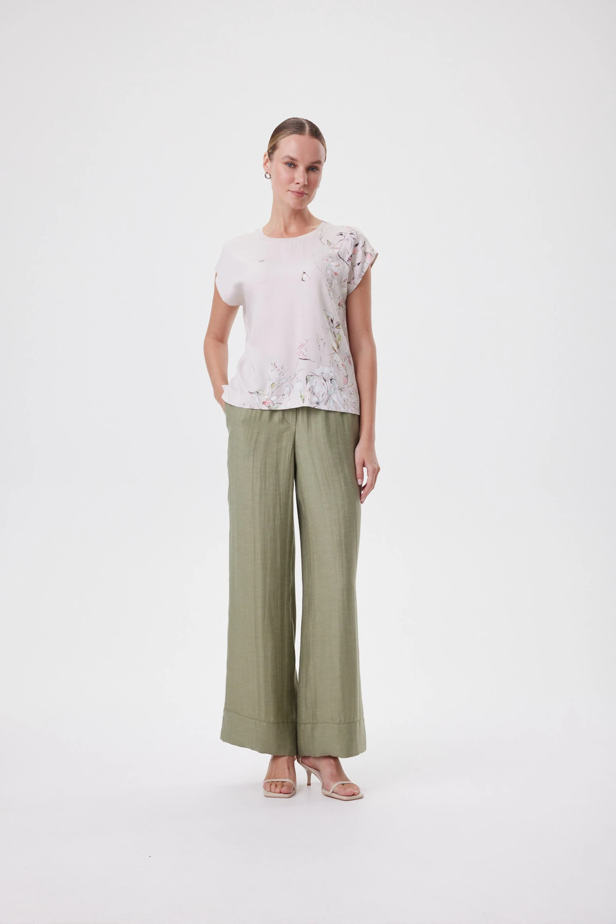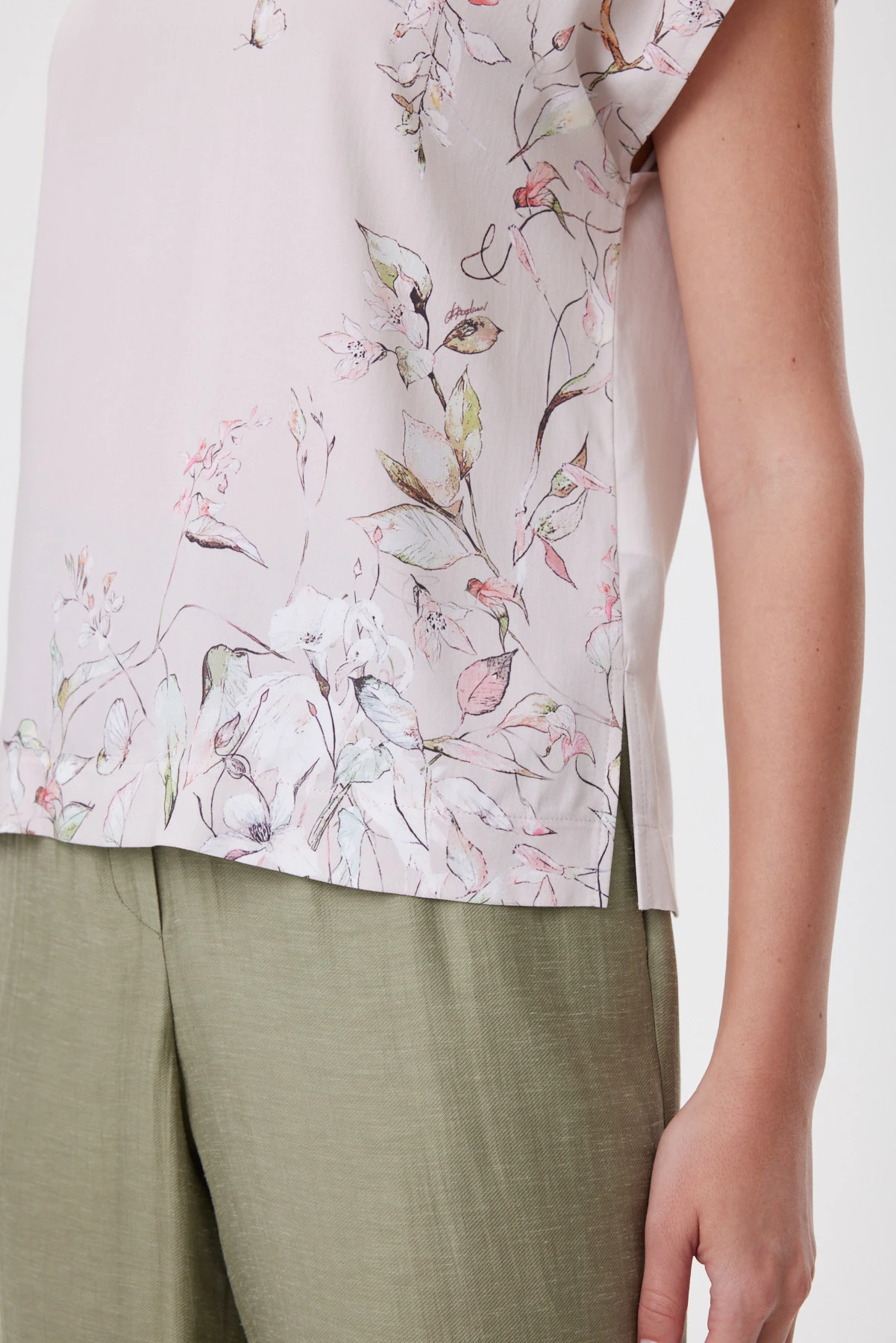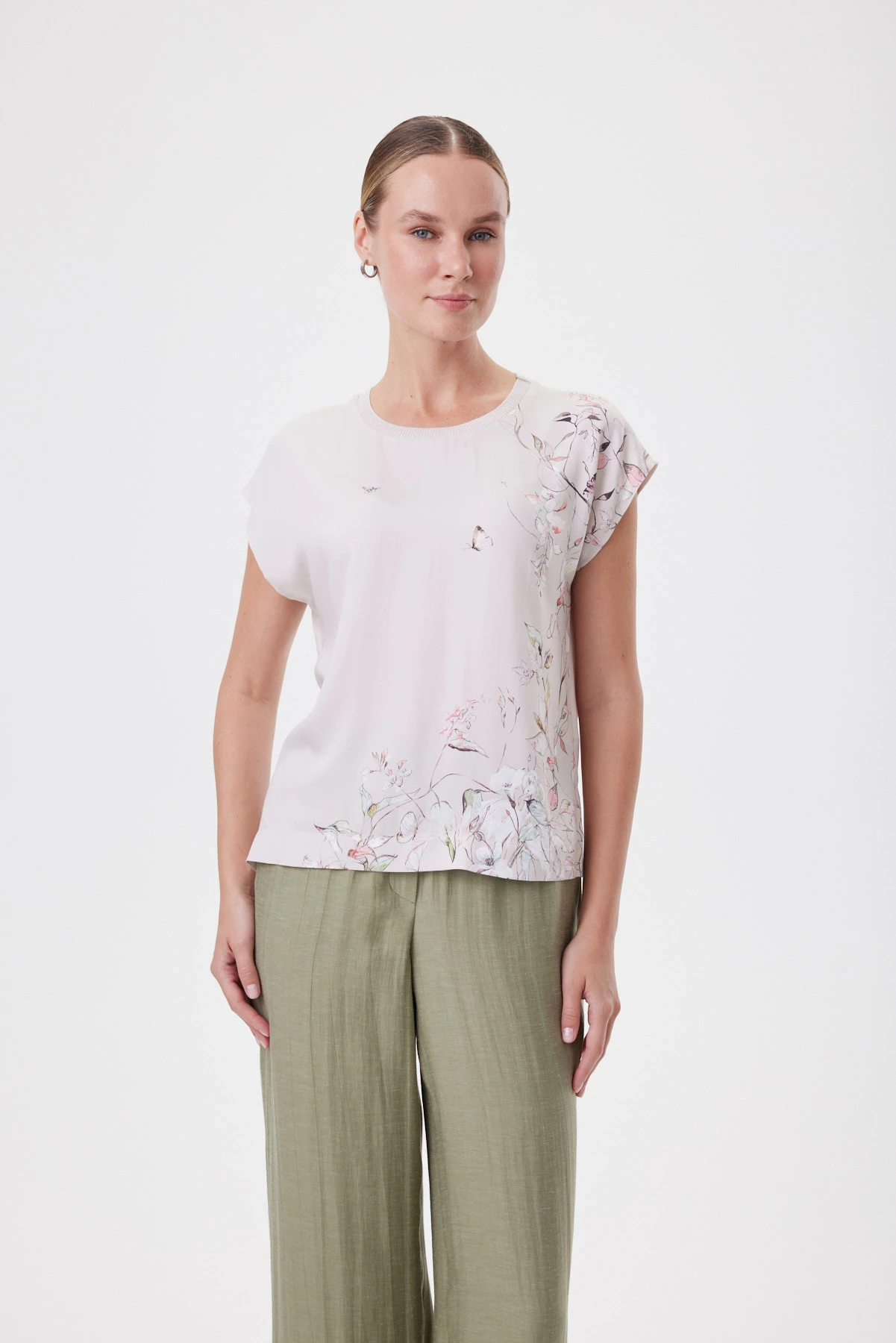Блузка работает как изящная альтернатива футболке. Свободная посадка и мягко расширенный рукав, аккуратно прикрывающий плечо, создают силуэт, который не подчёркивает лишнего. Расслабленная форма, купонный ботанический рисунок и премиальная вискоза гармонично работают вместе, придавая модели нарядный характер. Горловина окантована фирменной бейкой в тон. Подходит и для офиса, и для выходного дня: с белыми брюками и денимом, с оливковыми палаццо и юбкой миди из капсулы — когда хочется мягкой женственности, но в современном, собранном ключе.