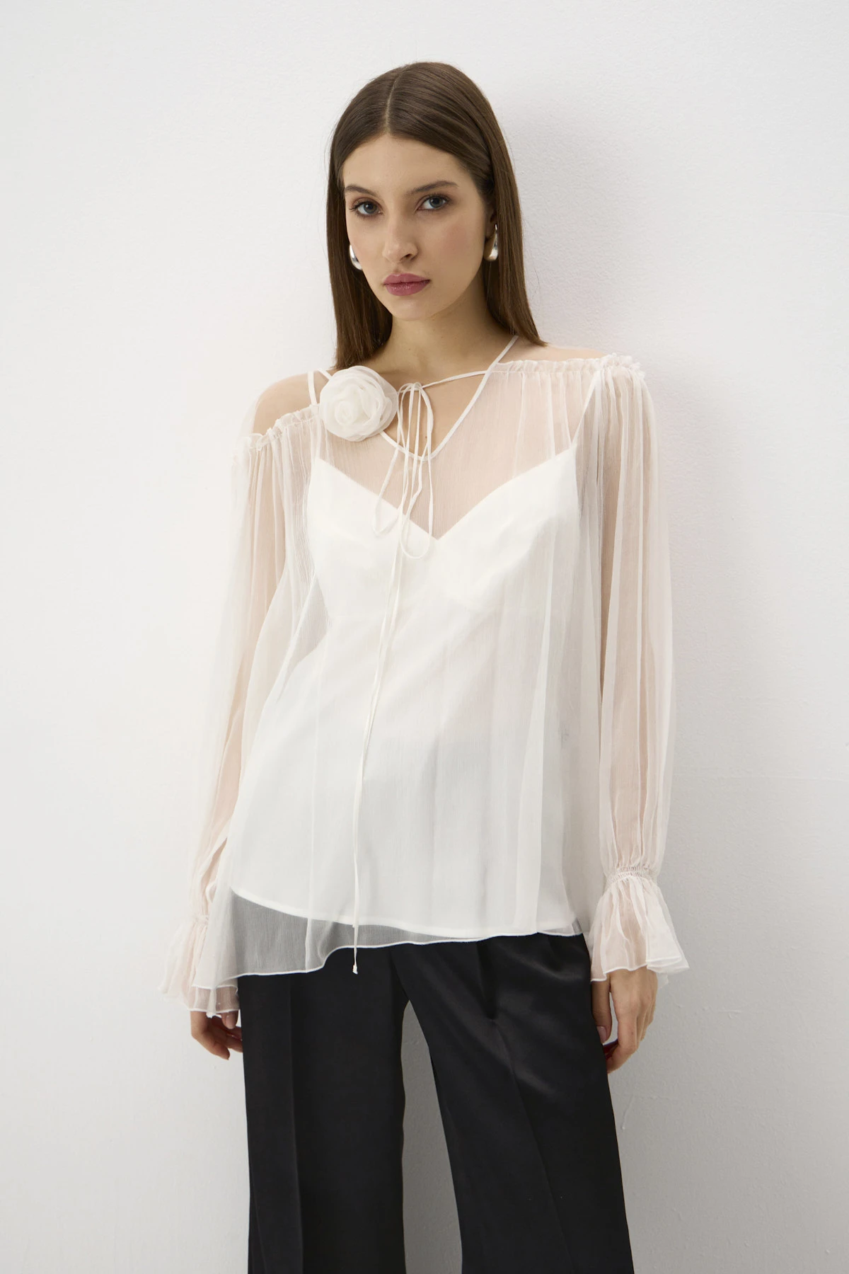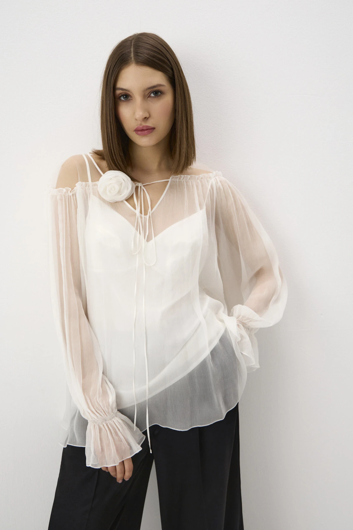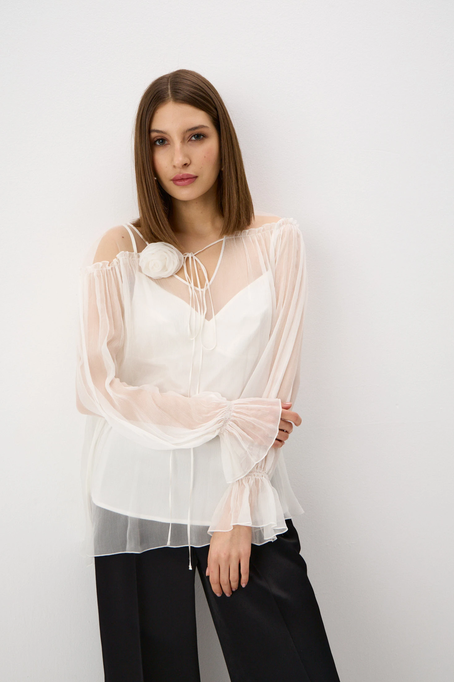 Женственная блузка свободного силуэта в романтичном чувственном стиле. Использование двух типов материалов – невесомого шифона и воздушной сетки – в области плеч создаёт трендовый «обнажённый» эффект. По переду горловины втачаны тонкие ленты с украшением-розой, которое можно повязать на шею. Длинные рукава собраны на эластичную ленту у запястья, что придаёт им элегантный «клёш»-эффект. Блузка дополнена монохромным топом из ткани на основе вискозы с деликатным сатиновым блеском.