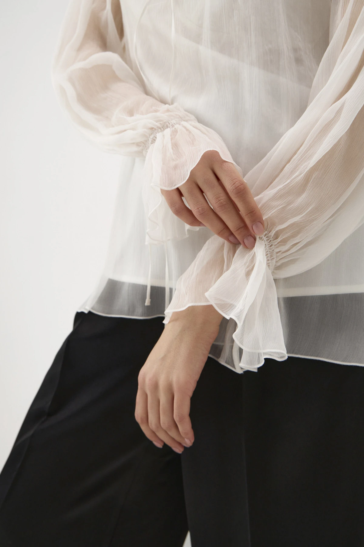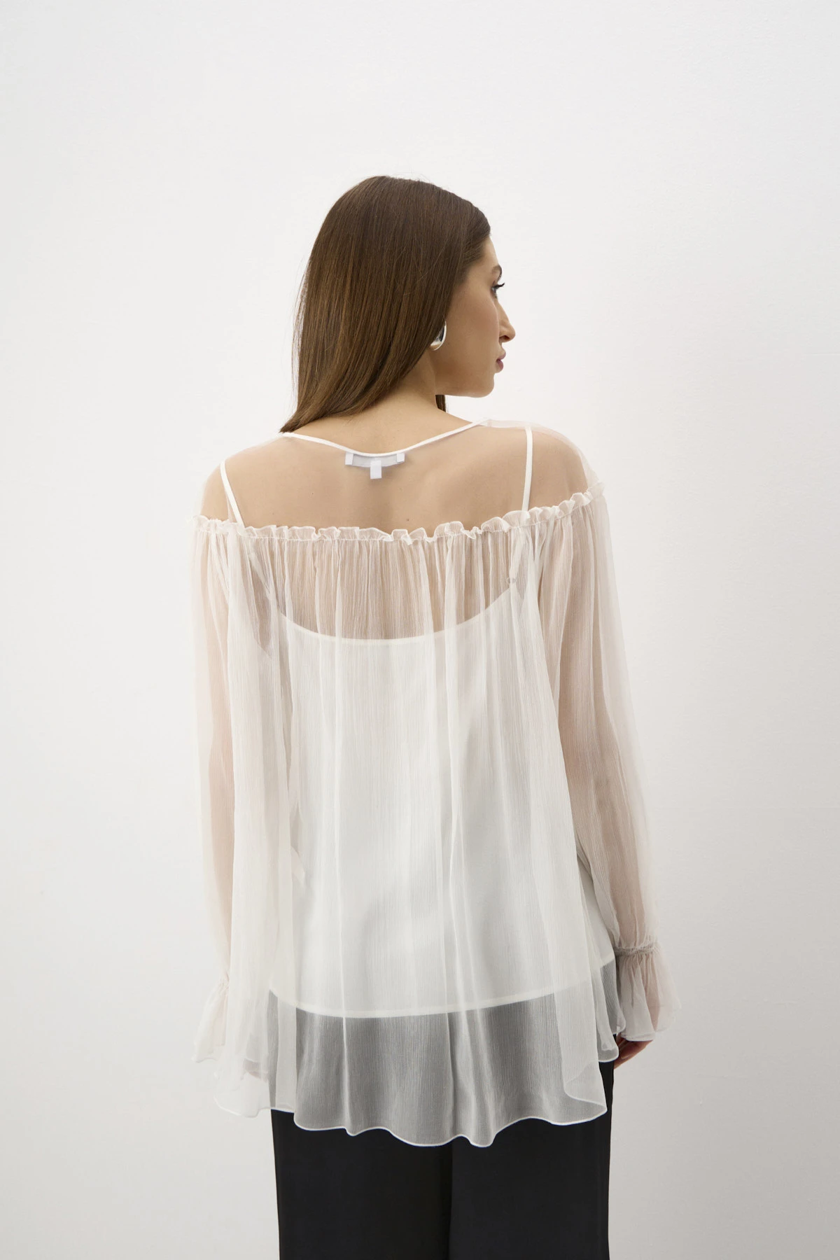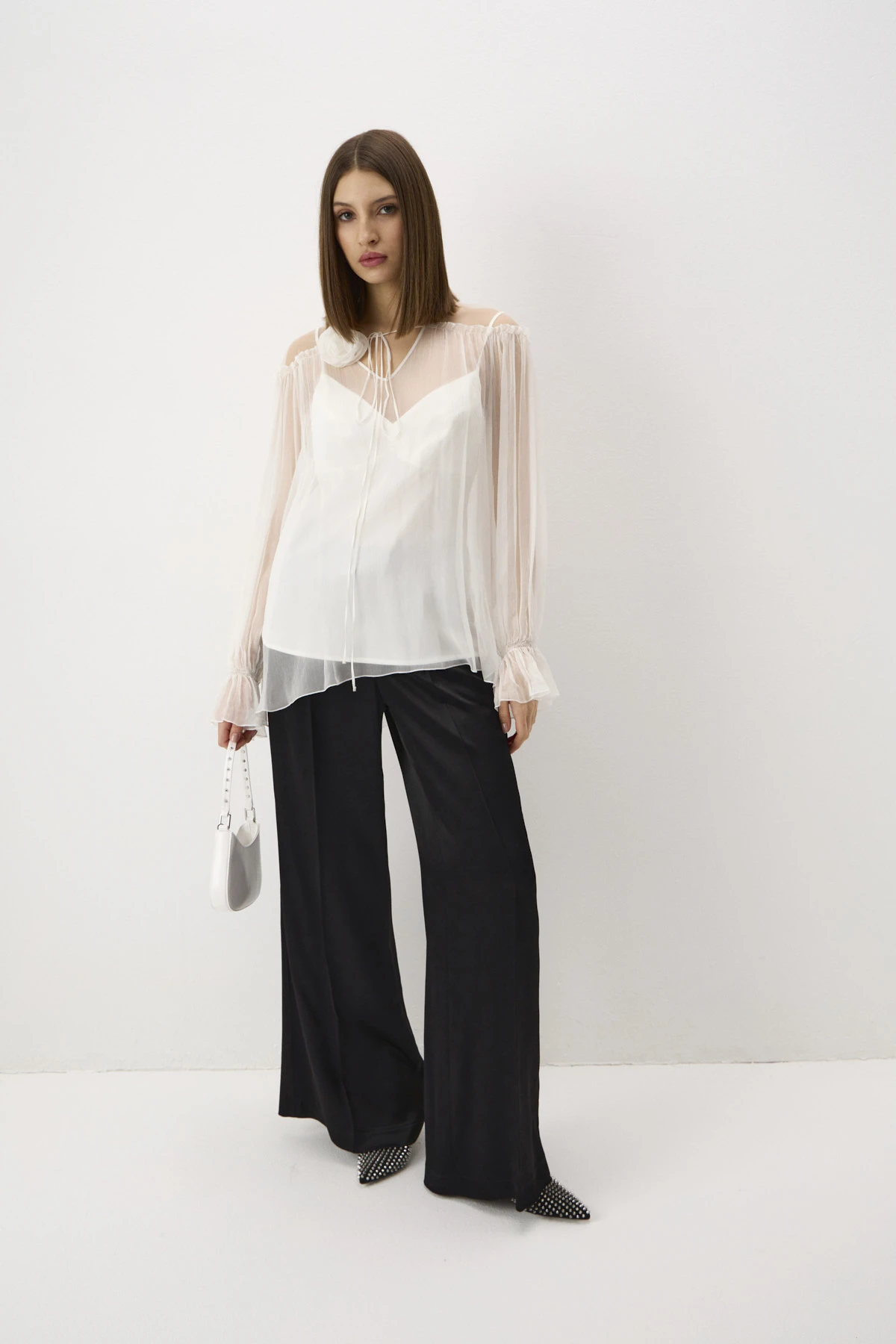 Женственная блузка свободного силуэта в романтичном чувственном стиле. Использование двух типов материалов – невесомого шифона и воздушной сетки – в области плеч создаёт трендовый «обнажённый» эффект. По переду горловины втачаны тонкие ленты с украшением-розой, которое можно повязать на шею. Длинные рукава собраны на эластичную ленту у запястья, что придаёт им элегантный «клёш»-эффект. Блузка дополнена монохромным топом из ткани на основе вискозы с деликатным сатиновым блеском.