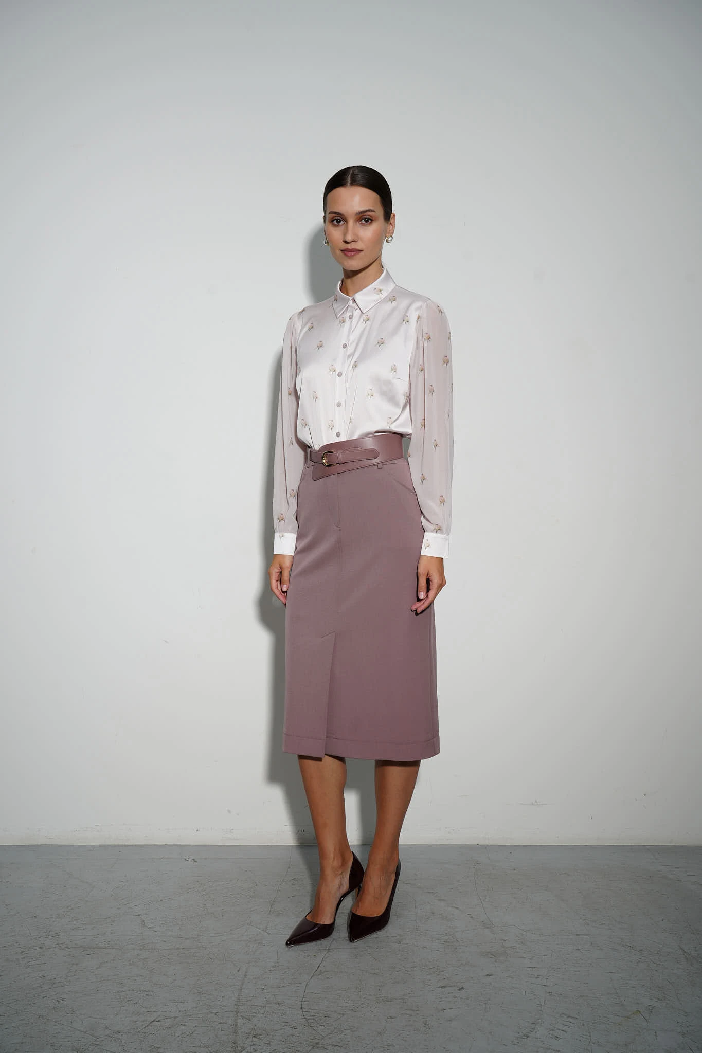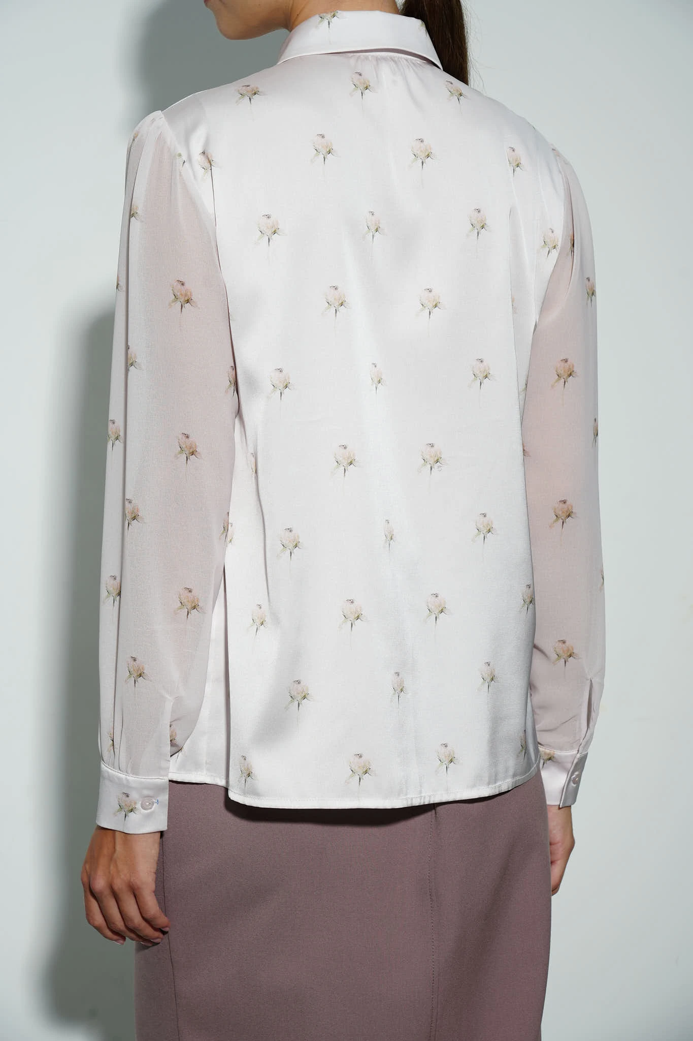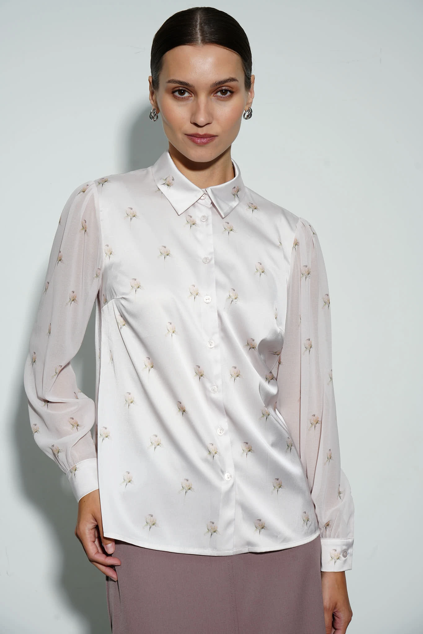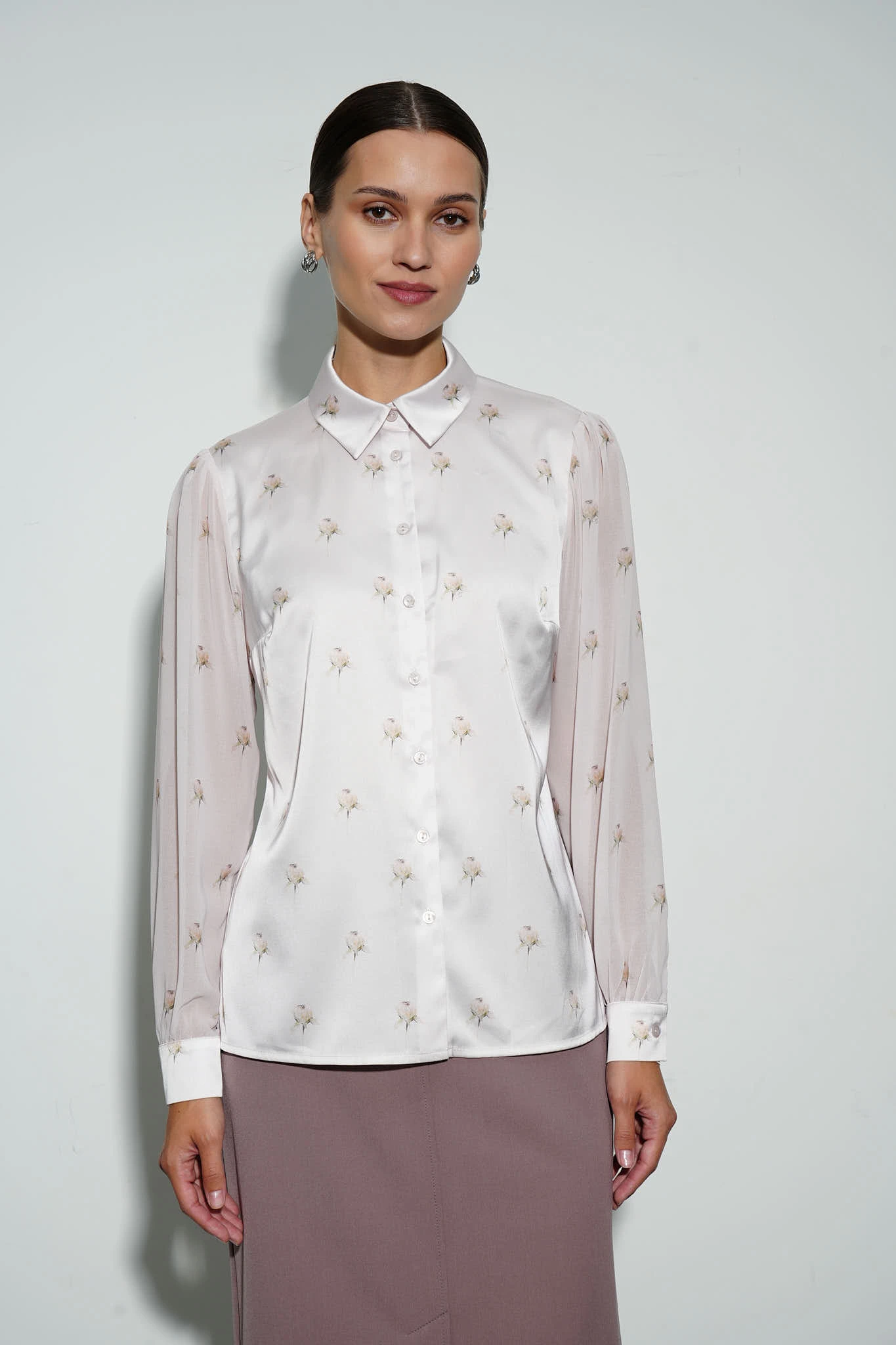 Элегантная блузка из комбинации тканей сочетает в себе нежность воздушного шифона и гладкость тактильно приятного атласа. Авторский раппорт с изображением бутонов пиона в кремовых оттенках придаёт модели нежность и романтичное настроение. Прямой силуэт и рубашечный воротник создают актуальный классический образ. Рукава собраны складками по окату плеча, добавляя романтичности. Деликатная сборка по спинке и перламутровые пуговицы подчёркивают внимание к деталям.