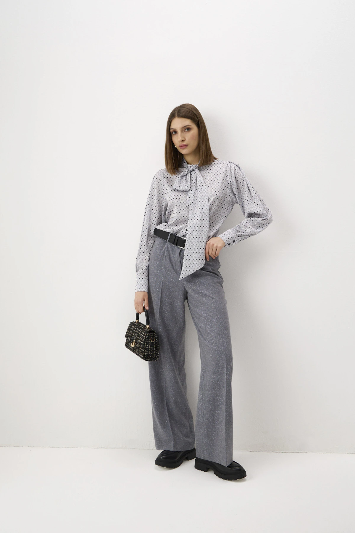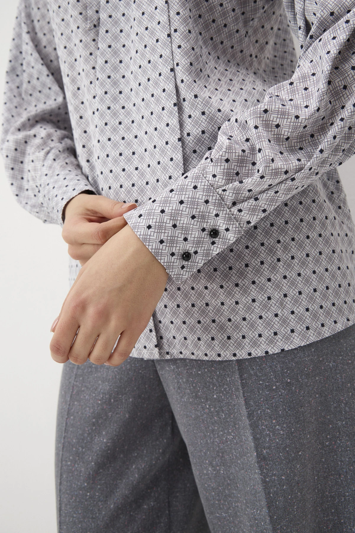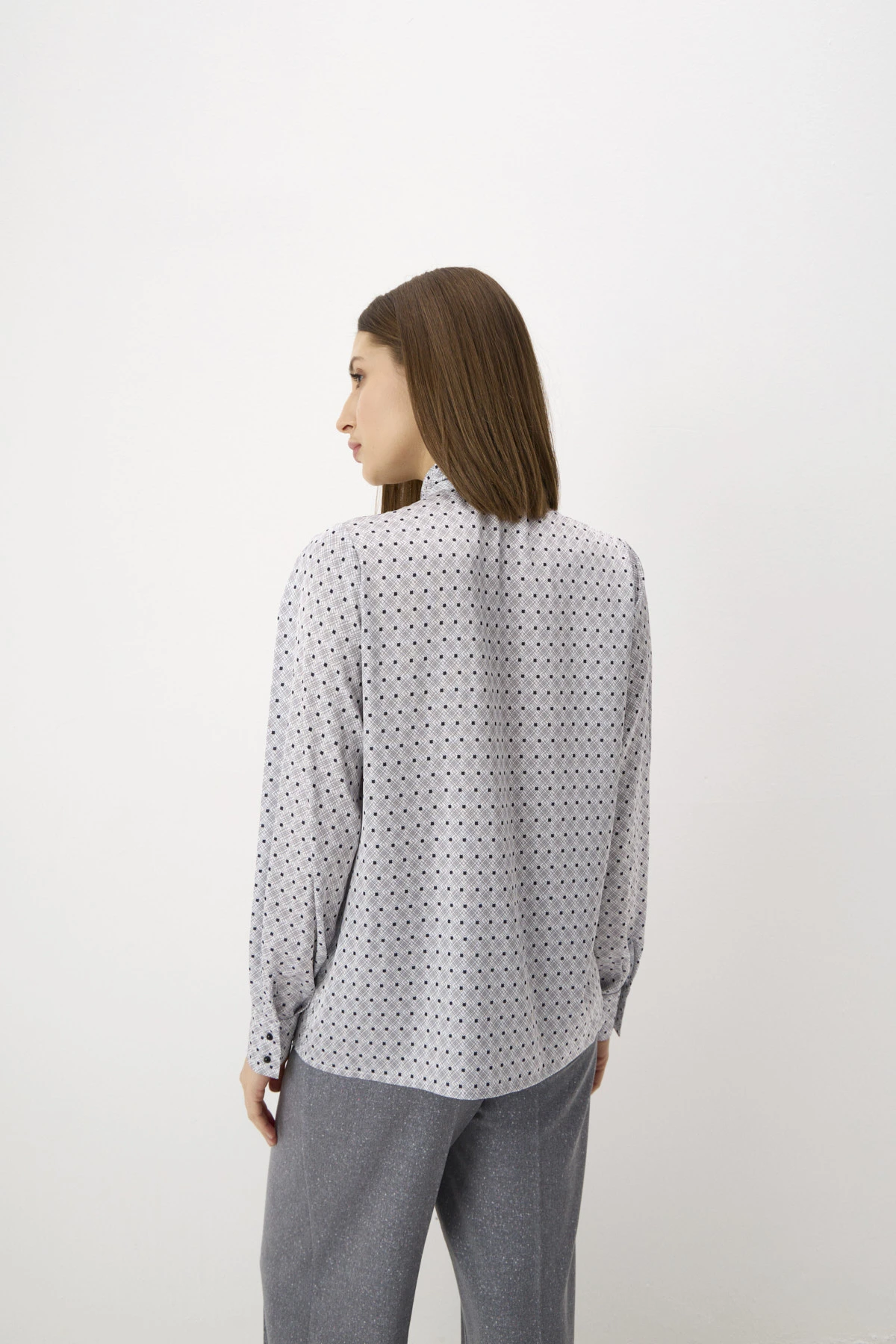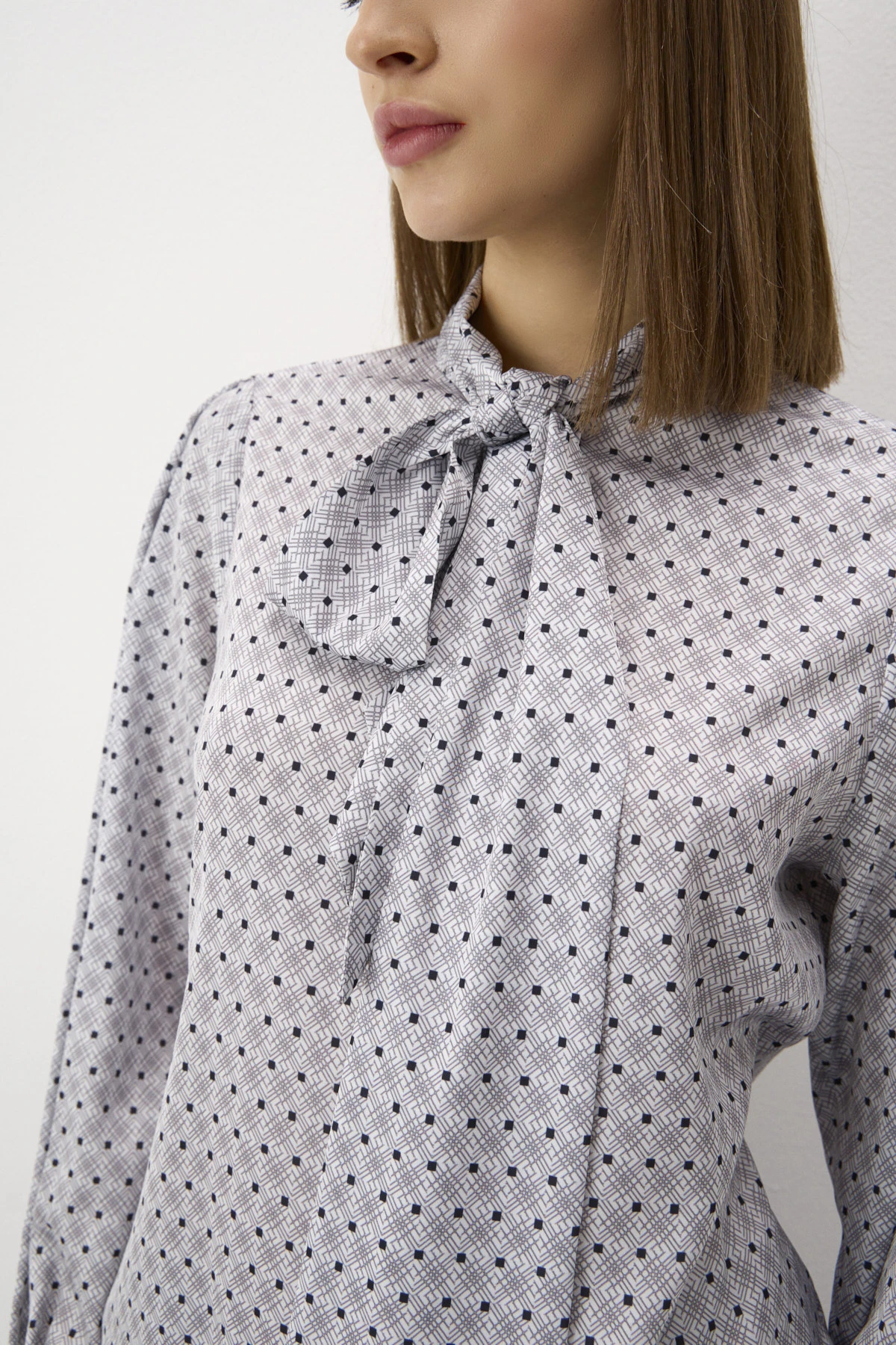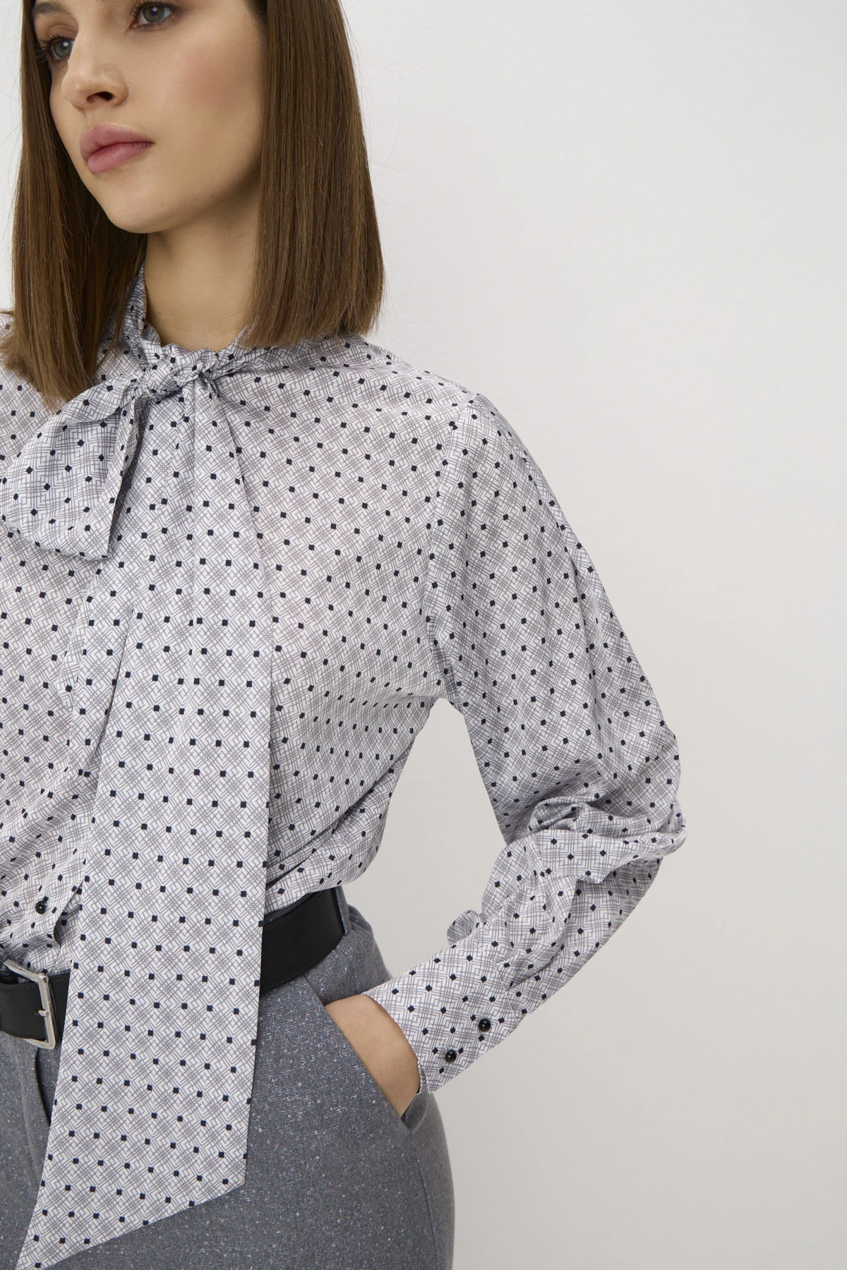 Блузка свободного кроя из тактильно приятной ткани на основе вискозы с абстрактным паттерном. Женственная деталь – воротник-аскот с длинными лентами, которые можно повязать как галстук или бант. Длинные рукава на манжетах с элегантными складками, придающими небольшой женственный объём. Застёжка-планка и манжеты рукавов застёгиваются на чёрные пуговицы-жемчужины.