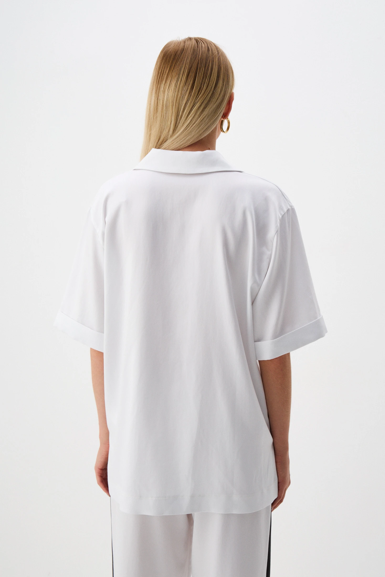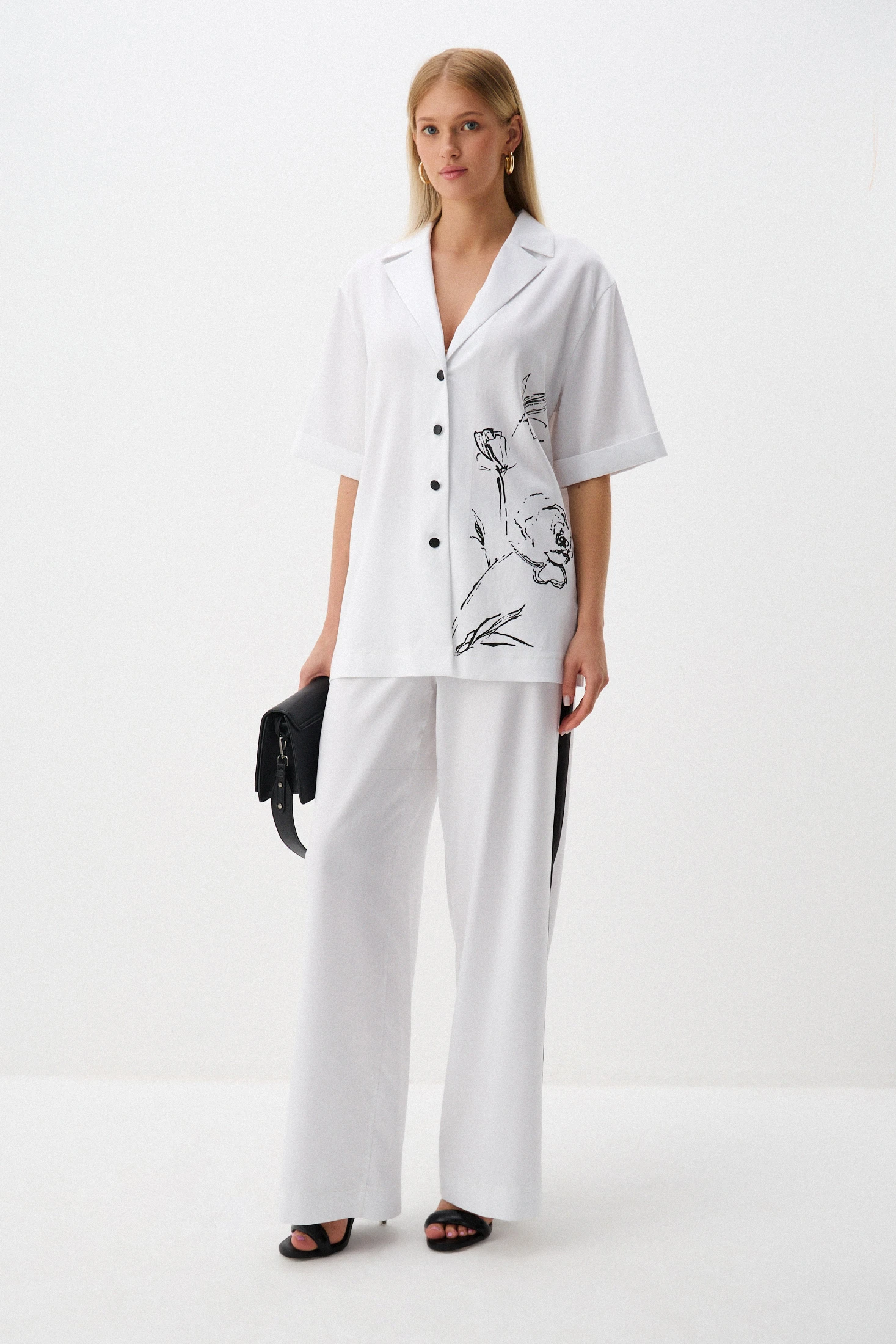 Блузка сочетает в себе элегантность и утонченность, придавая вашему образу неповторимый шарм. Ткань на основе тенсела гигроскопична и тактильно приятна. Использование приёма print placement – нанесение графичного цветка в оттенке «затмение» только с левой стороны переда блузки – придаёт ей дизайнерский характер и выглядит оригинально и статусно.