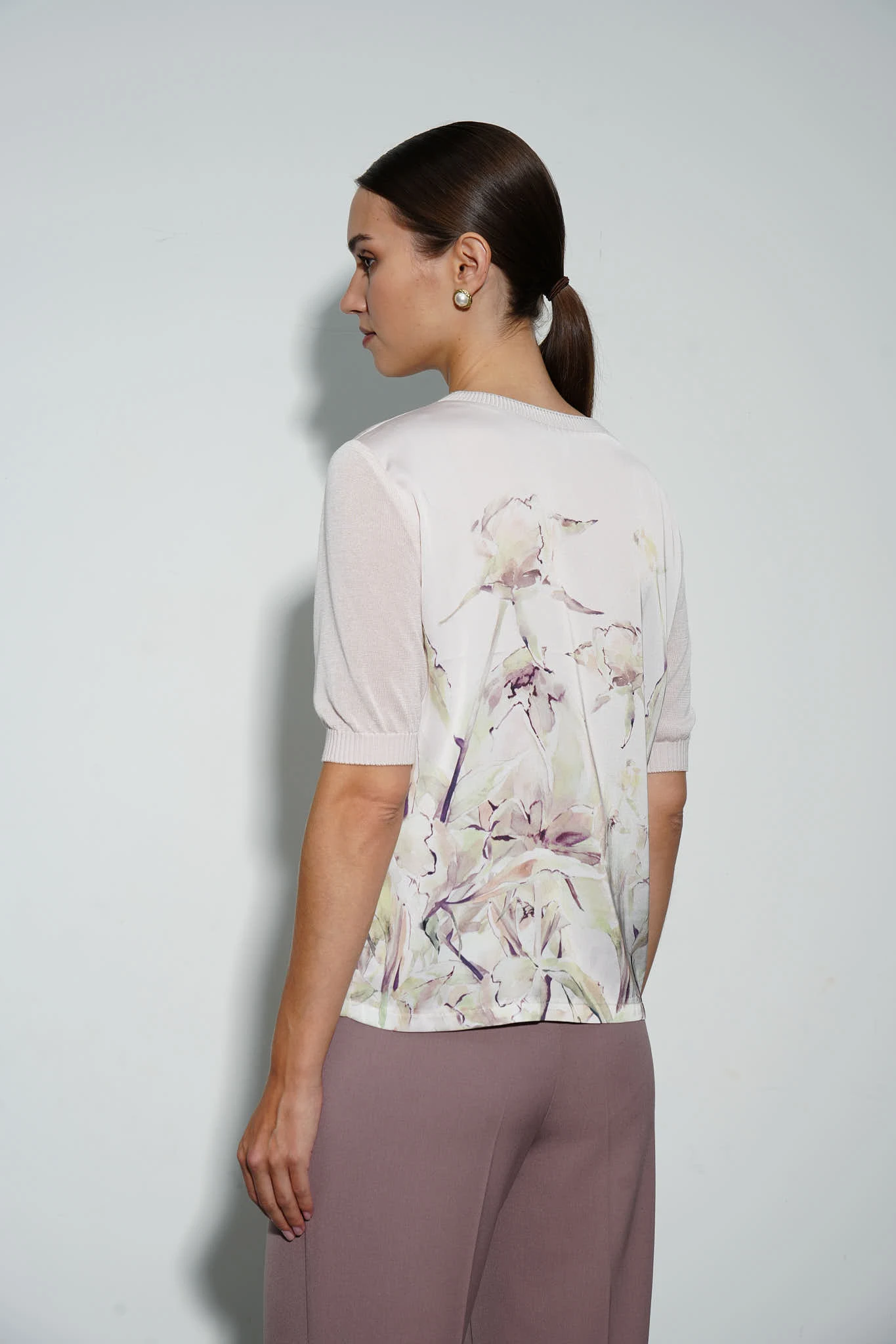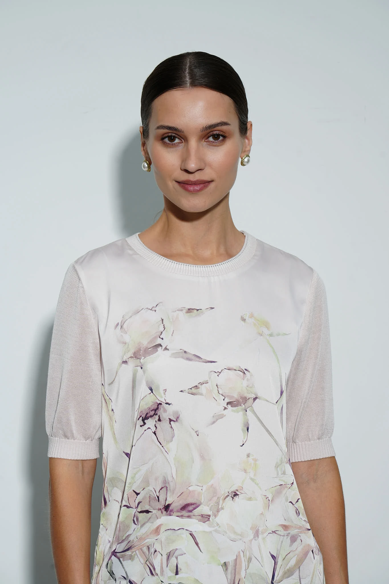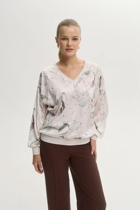 Блузка сочетает в себе нежный атлас с авторским купонным принтом и мягкий трикотаж на рукавах. Свободный прямой крой создает непринужденный и элегантный образ. Короткие рукава с манжетами в рубчик подчёркивают изящность рук, а круглый вырез горловины с авторской бейкой композиционно завершает модель. Кремовый оттенок и акварельный принт дарят романтическое настроение, наполняя образы с блузкой легкостью и гармонией.