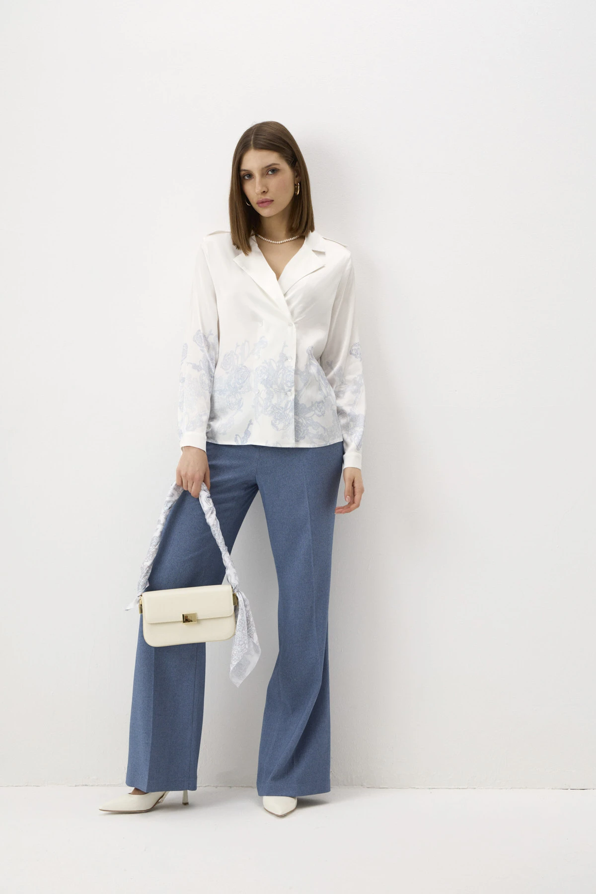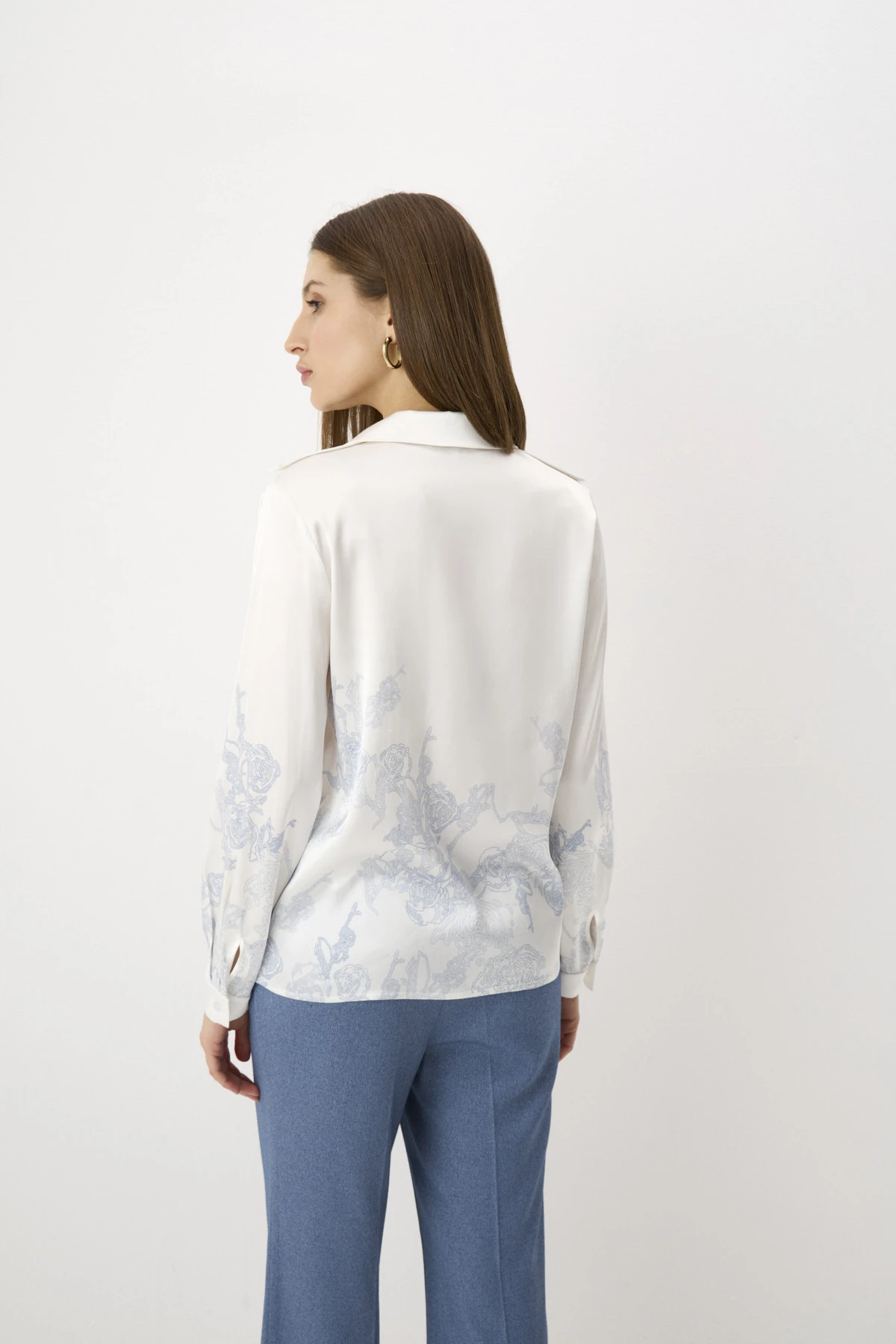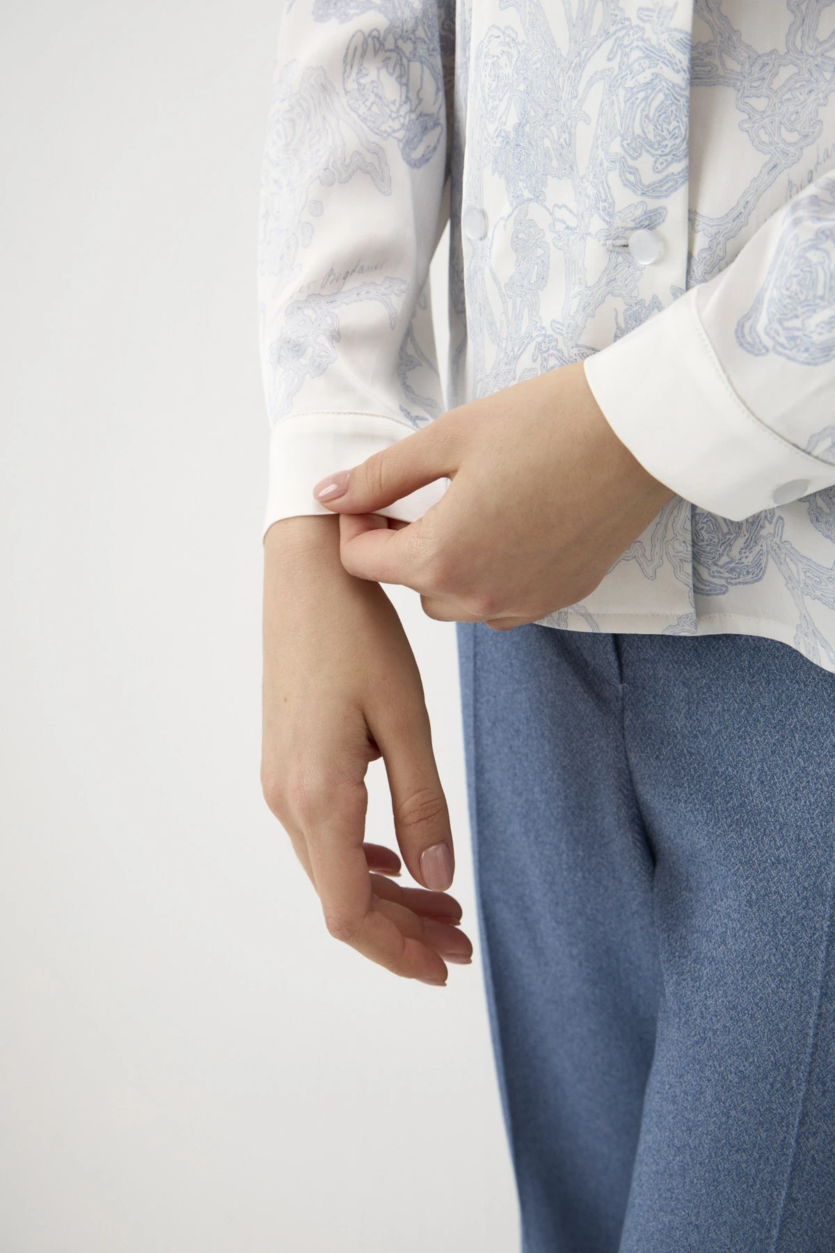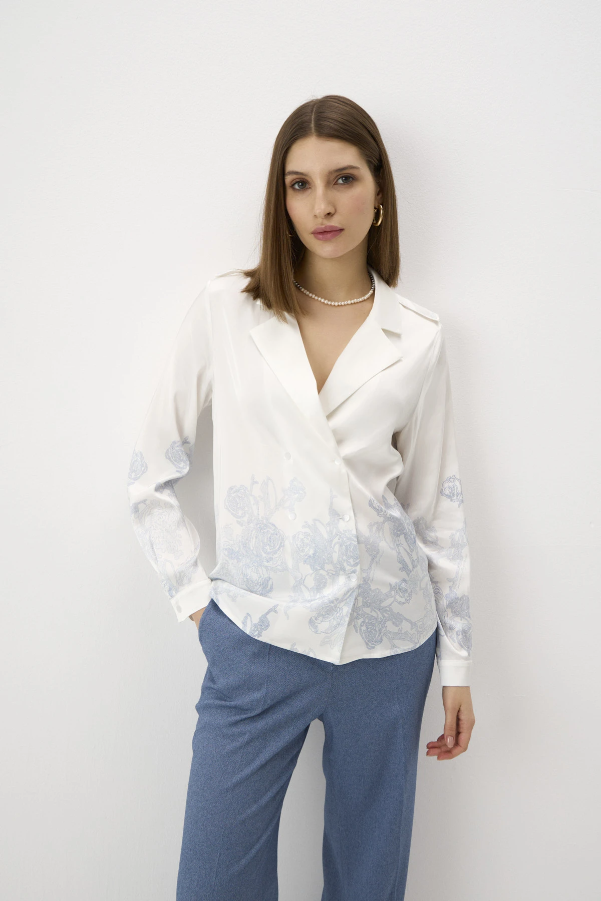 Двубортная блузка прямого силуэта с английским воротником, стилизованная под жакет. Модель выполнена из эластичной ткани на основе вискозы с сатиновым блеском. Купонное расположение принта подчёркнёт талию. Погоны на плечах добавляют блузке строгости и структурности. Застёжка на перламутровые пуговицы.
