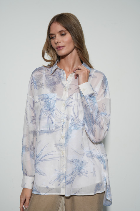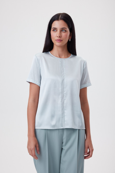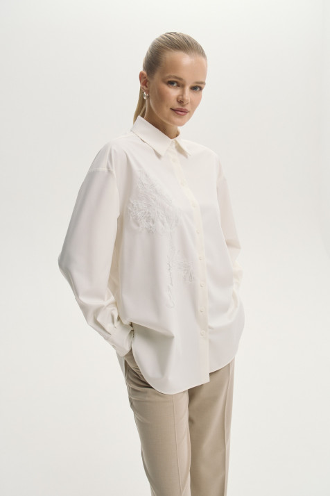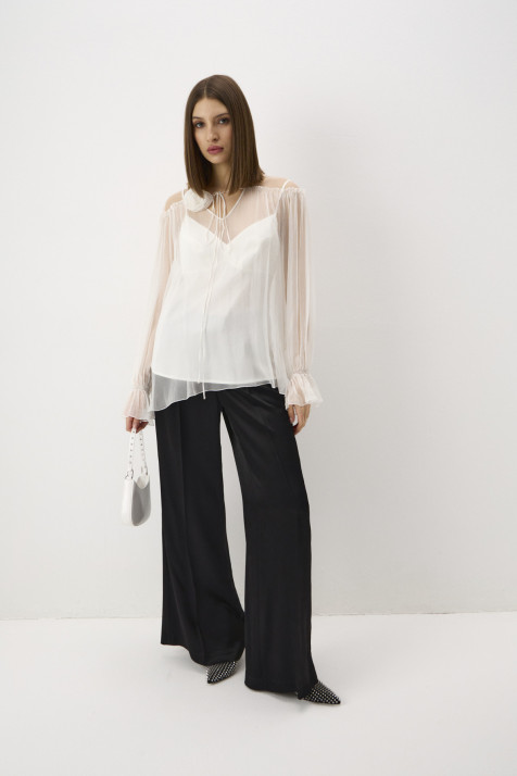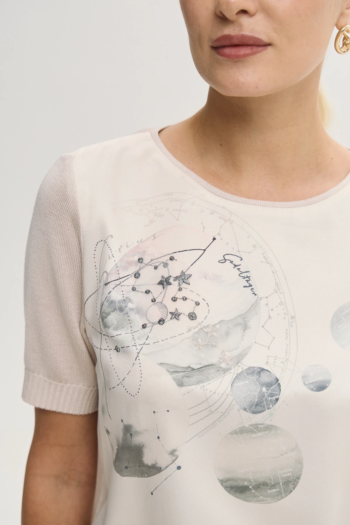 Уникальный авторский принт и вышивка по сетке с астрономическим сюжетом придают модели интеллектуальное звучание. Комбинированные фактуры: атласная ткань и фактурный трикотаж — комфортное сочетание для носки. Свободный крой с мягкой посадкой обеспечивает комфорт в течение всего дня. Светлая палитра подчёркивает свежесть кожи и делает блузку универсальной. Идеальна для многослойных образов — легко комбинировать с жакетами, жилетами и кардиганами.