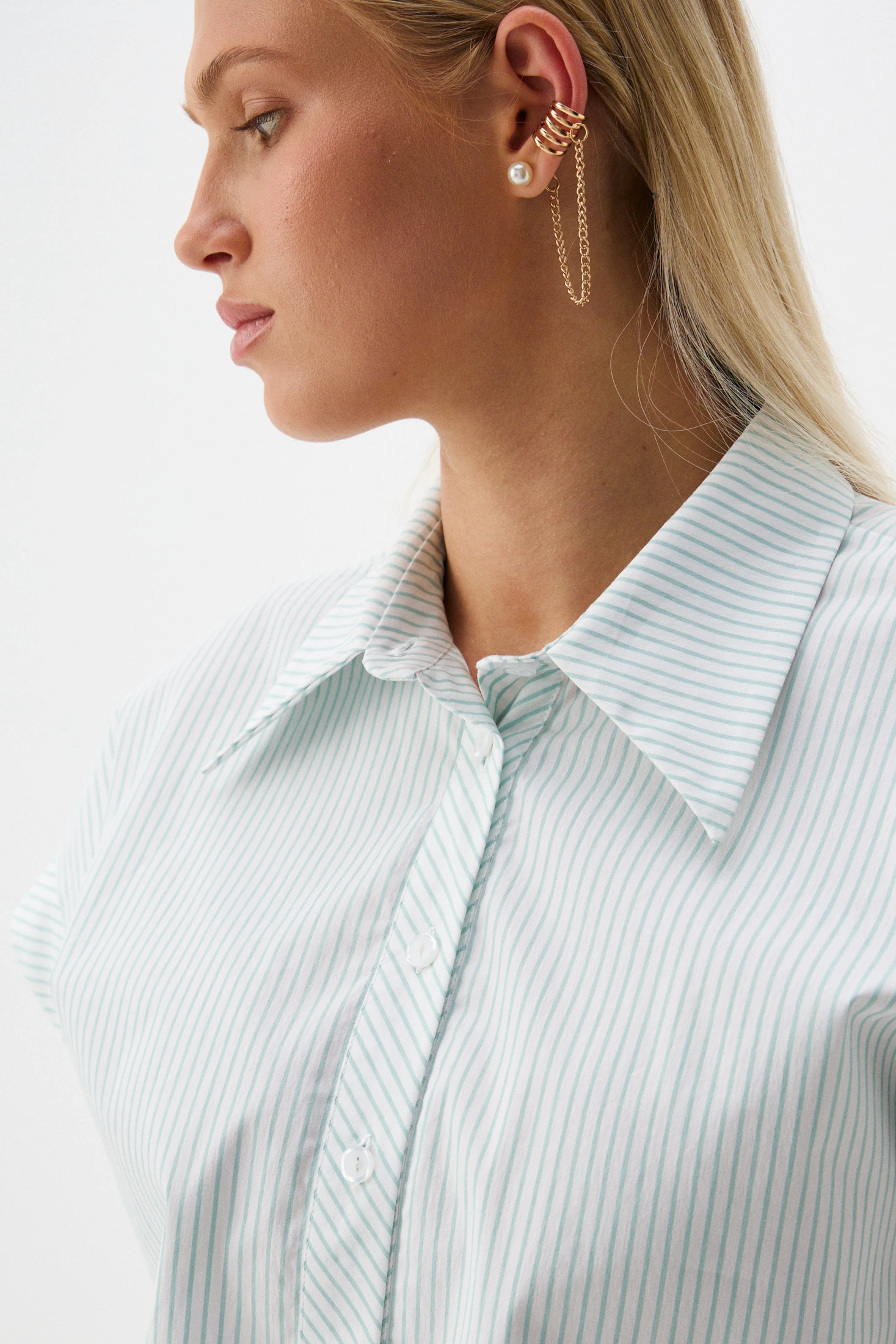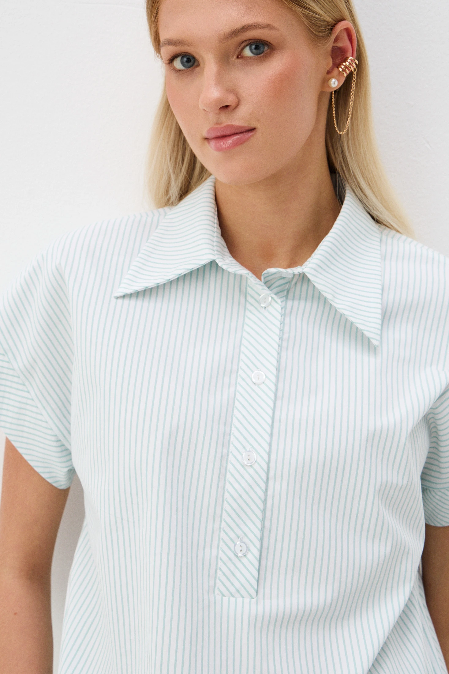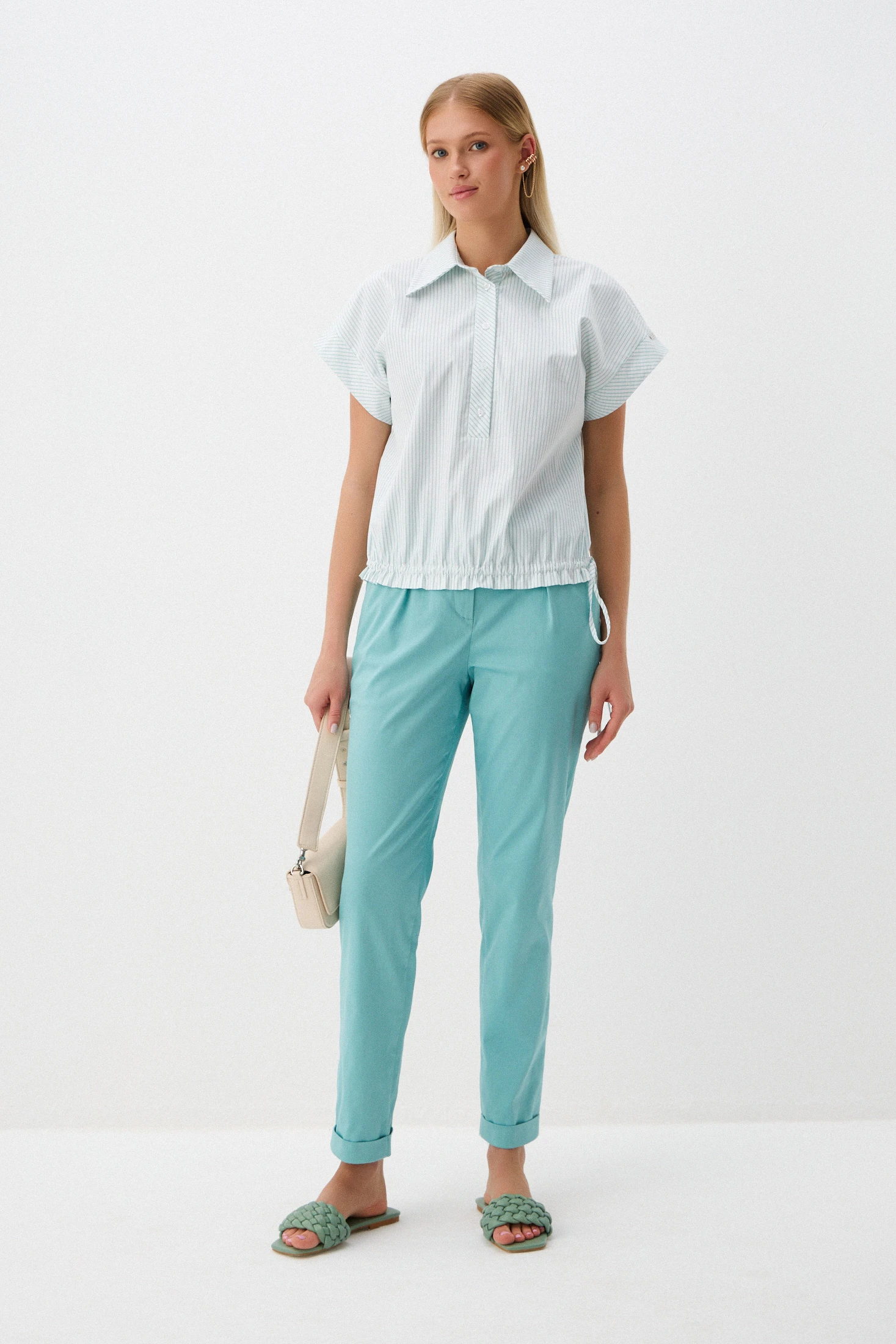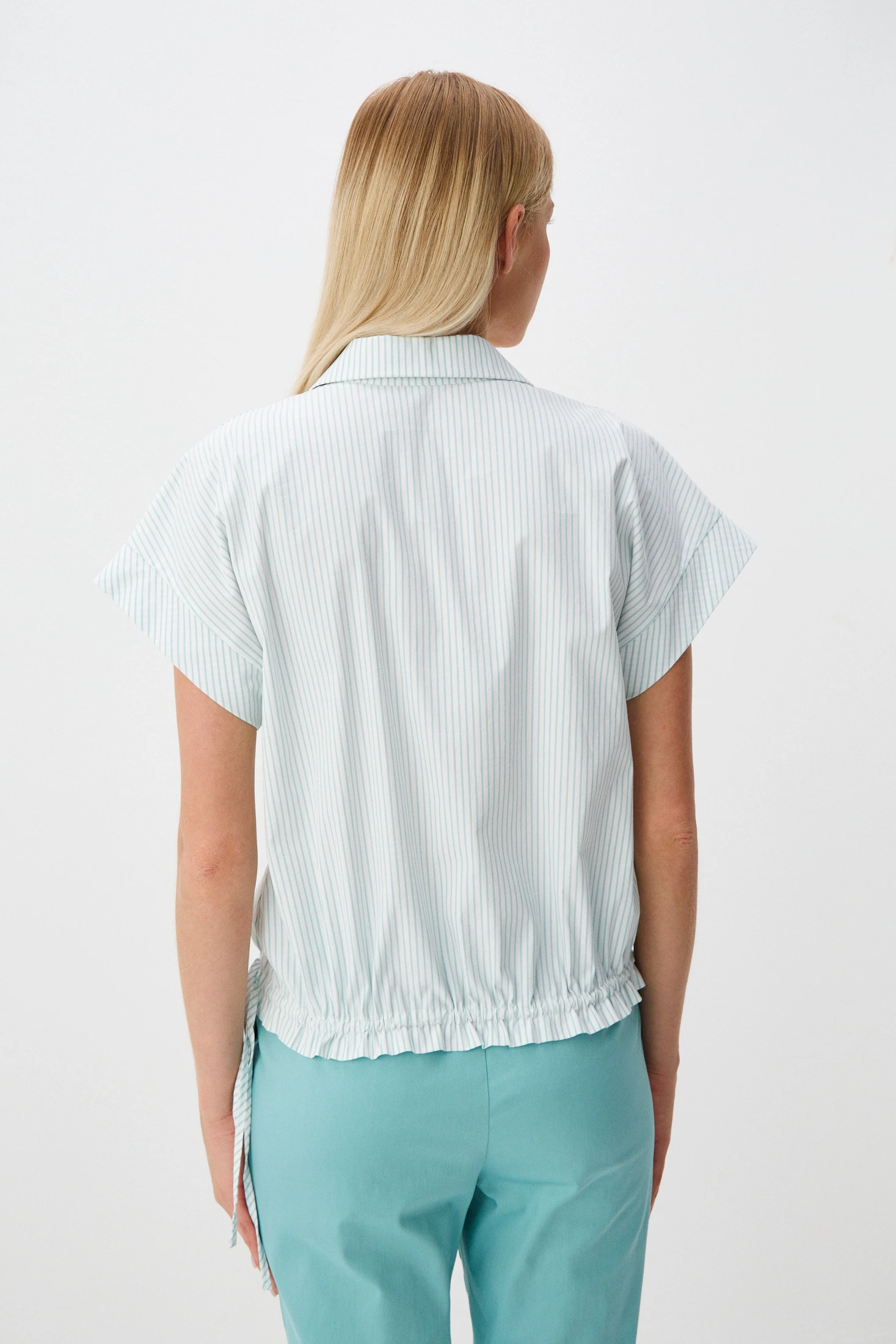 Блузон из ткани на основе хлопка – прекрасный вариант на лето. Гигроскопичная воздухопроницаемая ткань позволяет носить блузон даже в самые жаркие дни. Вертикальная полоска мятного оттенка дарит беззаботное настроение и лёгкость. Свободный крой, глубокая застежка-поло и кулиска, регулирующая степень приталенности, обеспечивает удобство и свободу движений, что делает блузон идеальным для повседневного использования.