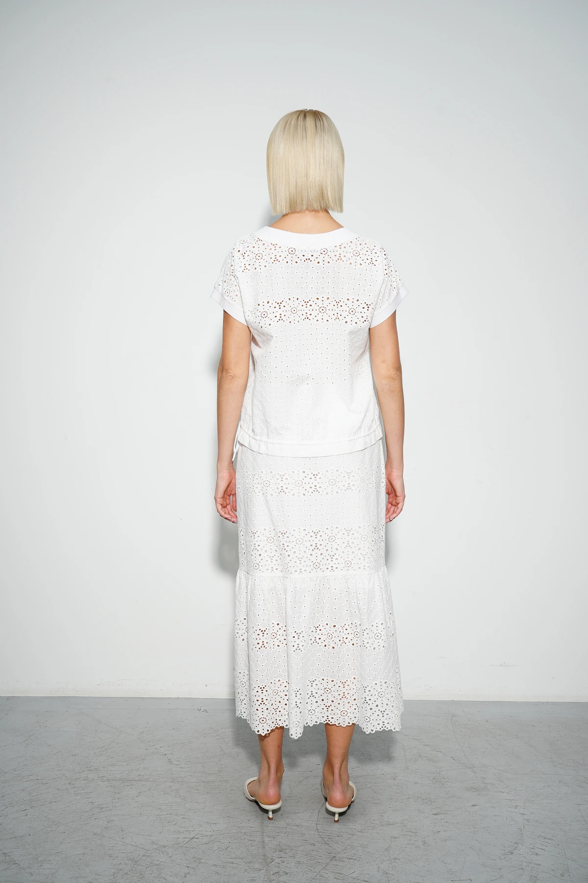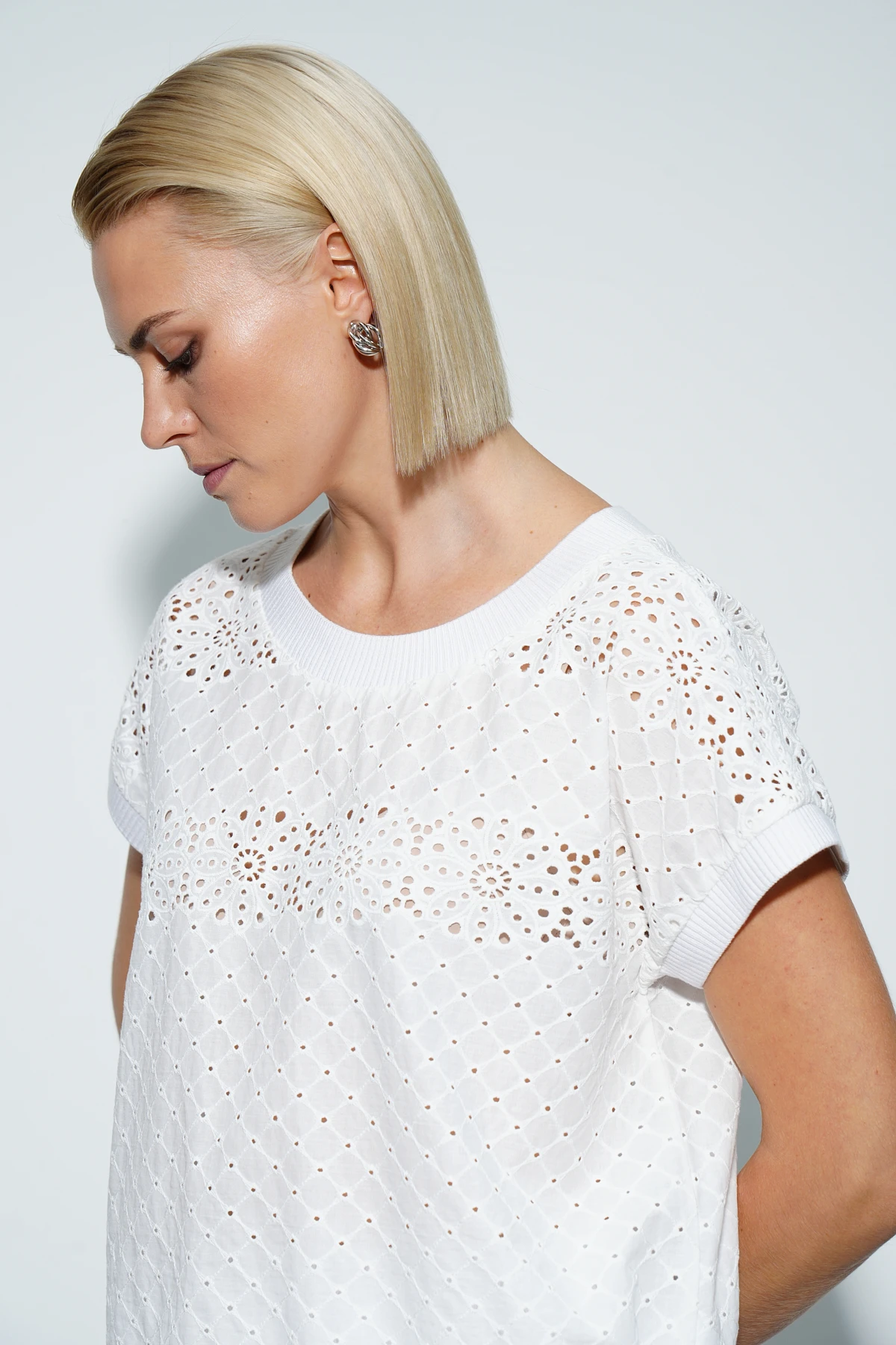 Блузон из хлопкового шитья в молочном оттенке с флорально-геометричной перфорацией — легкая и элегантная модель, идеально подходящая для жарких дней. Свободный силуэт блузона с кулиской по низу позволяет регулировать степень прилегания, создавая комфортный образ. Короткие цельновыкроенные рукава придают образу расслабленности. Круглый вырез горловины и манжеты рукавов оформлены трикотажной бейкой в рубчик. Модель идеально дополнит ваш летний гардероб и станет универсальным вариантом для создания легкого и элегантного образ.