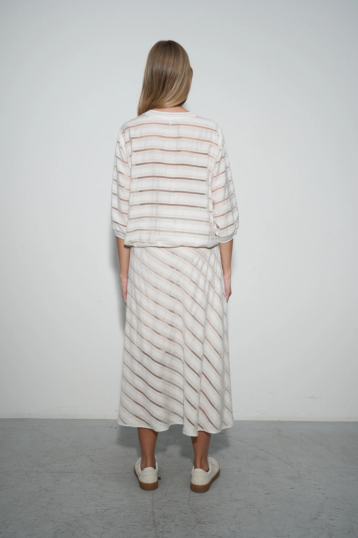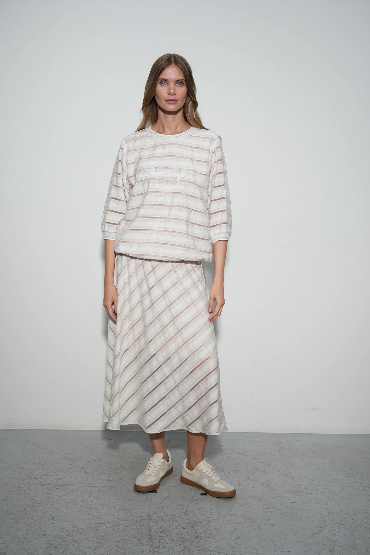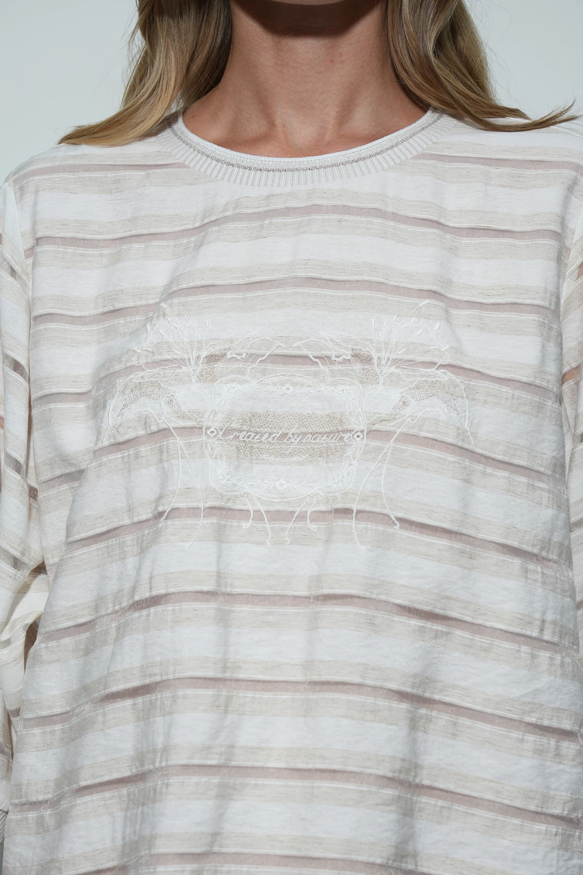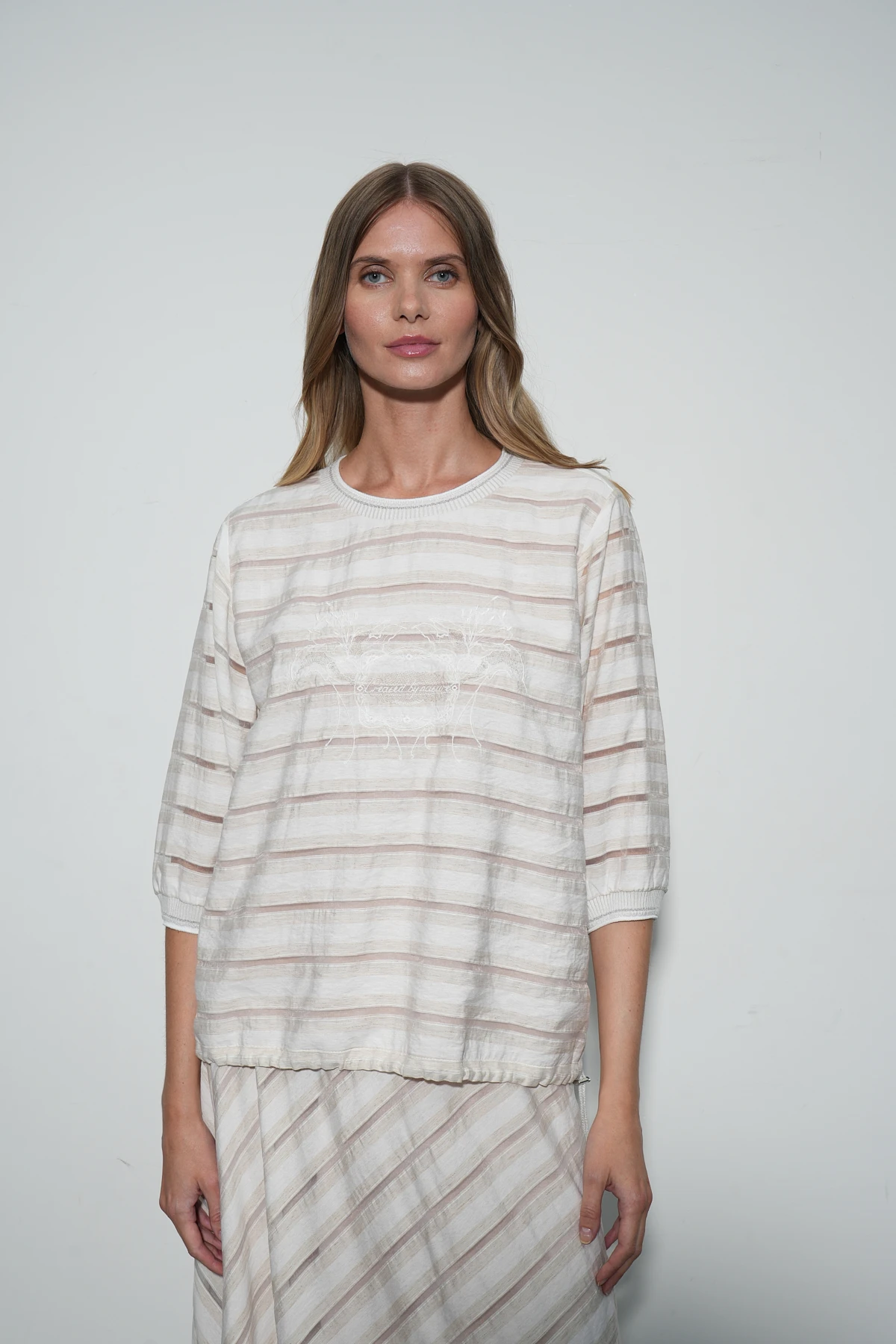 Блузон из ткани восхитительного состава – премиальный район и натуральный лён. Фактура ткани имеет характерные льняные оттенки и вставки-полосы из нейлона, создающие воздушный полупрозрачный эффект. Свободный крой с короткими рукавами на манжетах идеально подходит для комфортных образов, а кулиска по низу позволяет регулировать прилегание. Изюминка модели с-авторская вышивка с изящными цветами аквилегий и надписью «created by nature» (с англ. «создано природой»). Вырез горловины и манжеты оформлены аккуратной бейкой.