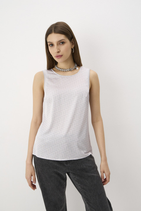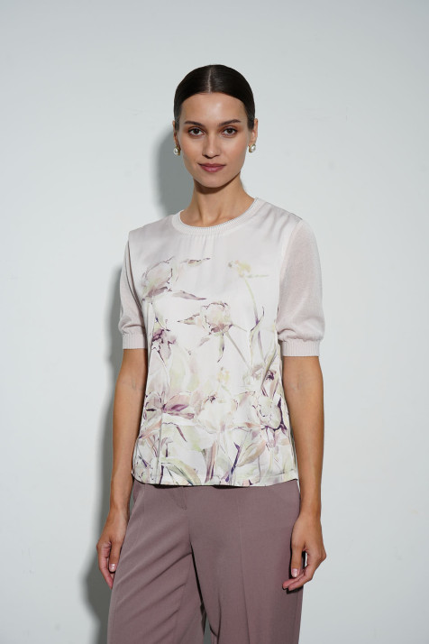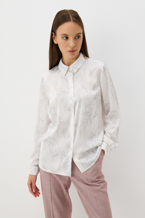 Женственная блузка свободного силуэта в романтичном чувственном стиле. Использование двух типов материалов – невесомого шифона и воздушной сетки – в области плеч создаёт трендовый «обнажённый» эффект. По переду горловины втачаны тонкие ленты с украшением-розой, которое можно повязать на шею. Длинные рукава собраны на эластичную ленту у запястья, что придаёт им элегантный «клёш»-эффект. Блузка дополнена монохромным топом из ткани на основе вискозы с деликатным сатиновым блеском.