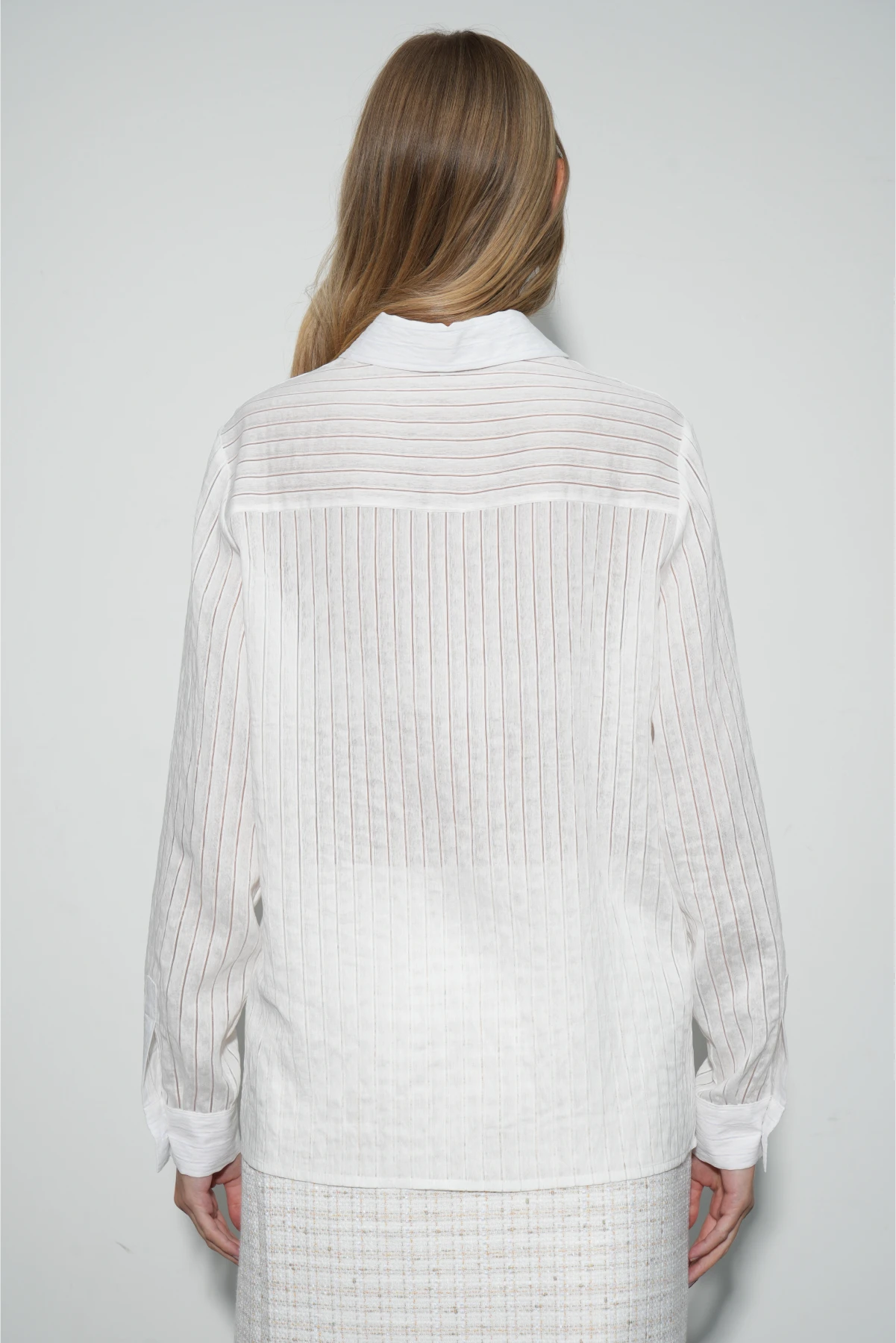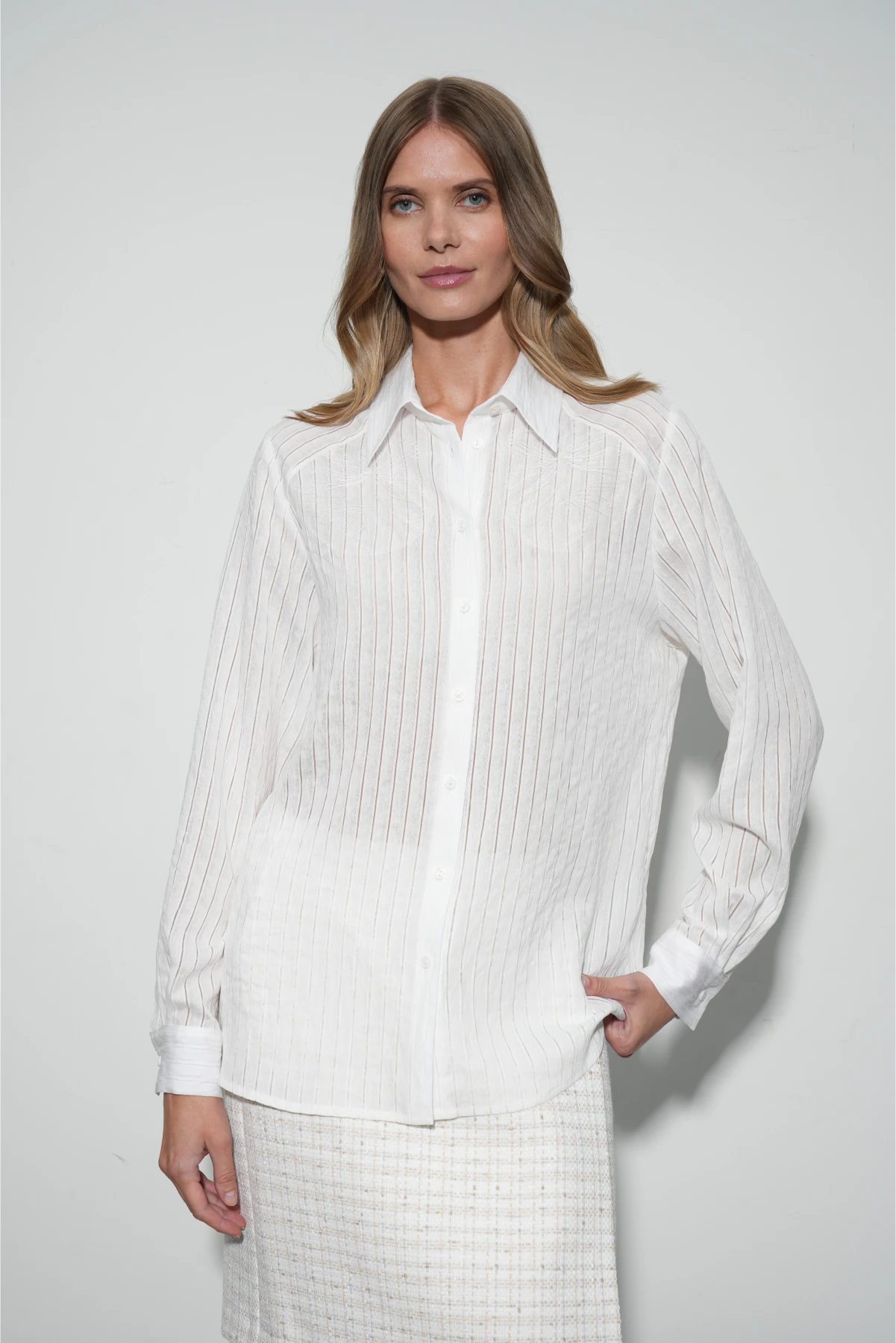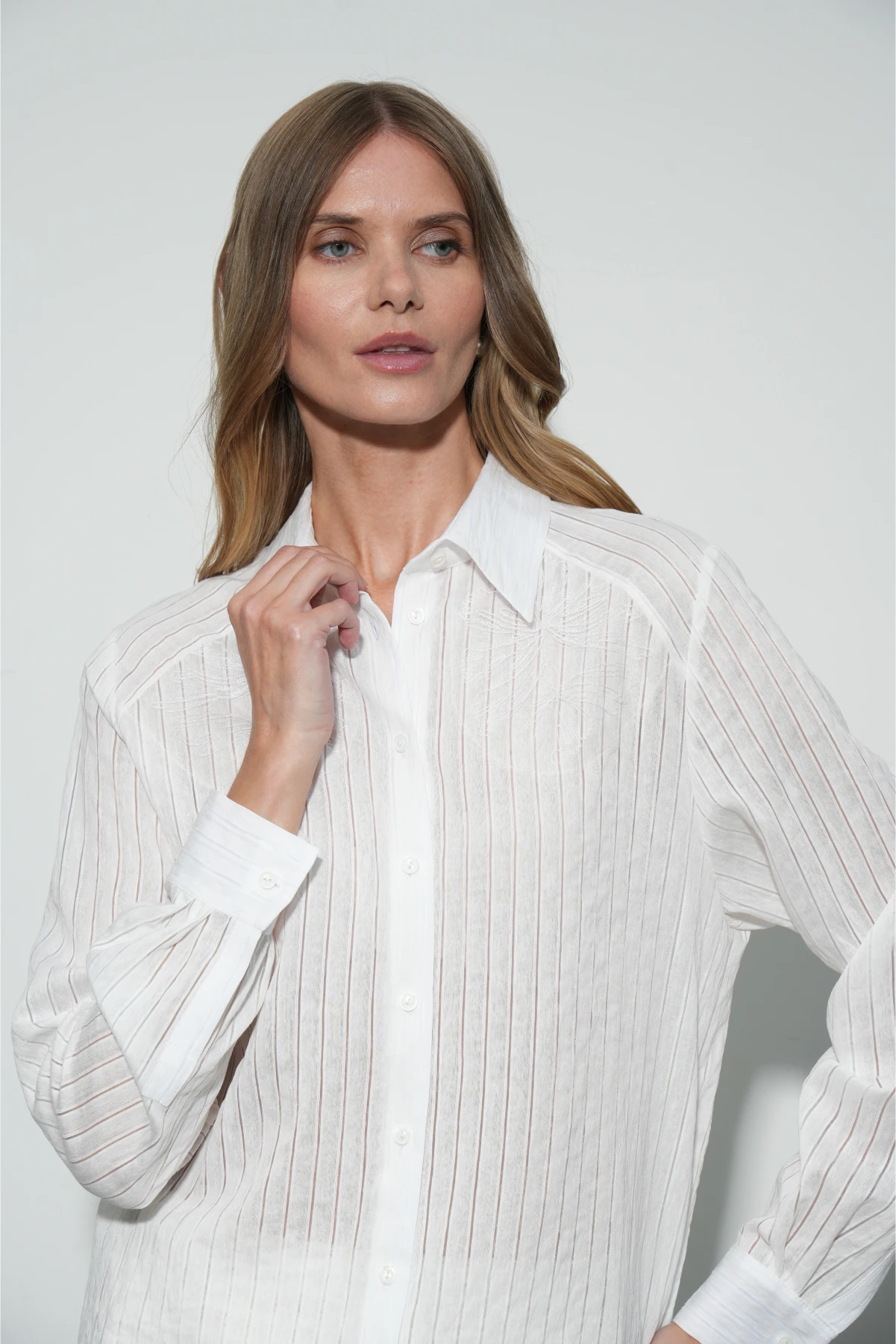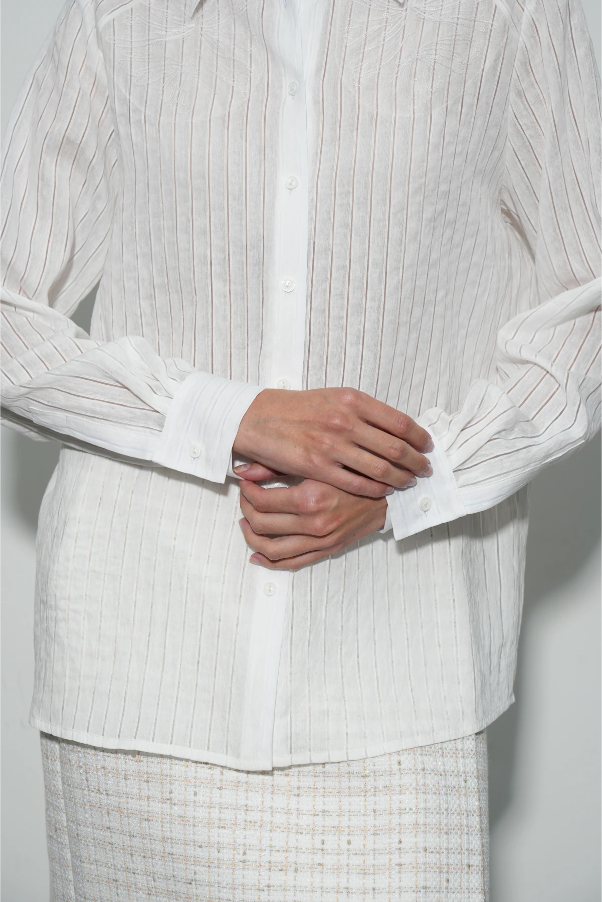 Монохромная рубашка из полупрозрачной ткани на основе премиального района в молочном оттенке. Интересная фактура достигается за счёт прозрачных воздушных полос из нейлона. Главный акцент модели - симметричная авторская вышивка, выполненная по сетке, изображающие изящные цветы. Вышивка добавляет модели выразительности и превращает её в произведение искусства, подчеркивающее нежность и элегантность. Свободный крой, рубашечный воротник на притачной стойке и застёжка на брендированные белые пуговицы обеспечивают элегантную посадку. Плечевые кокетки по переду, имитирующие реглан, и кокетка на спинке подчёркивают изысканность кроя. Втачные рукава с манжетами дополнены разрезами, оформленными аккуратными планками. Рубашка с вышивкой станет центральным элементом образа, идеально подходя для особых случаев, вечерних мероприятий и оригинальных сочетаний.