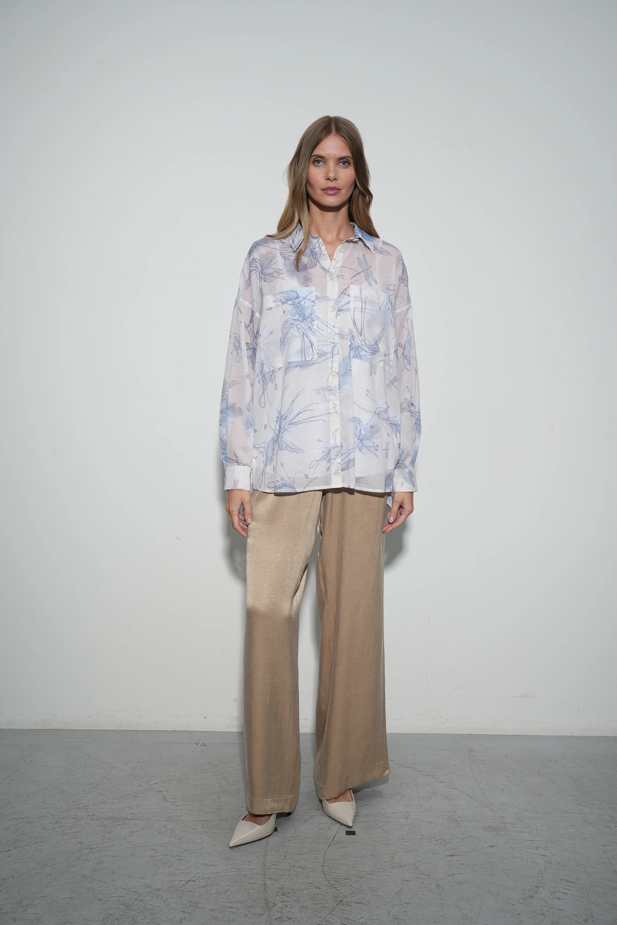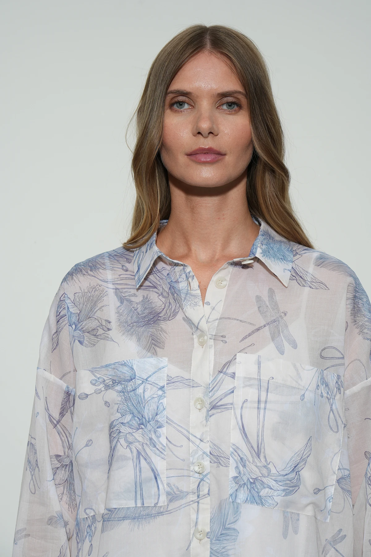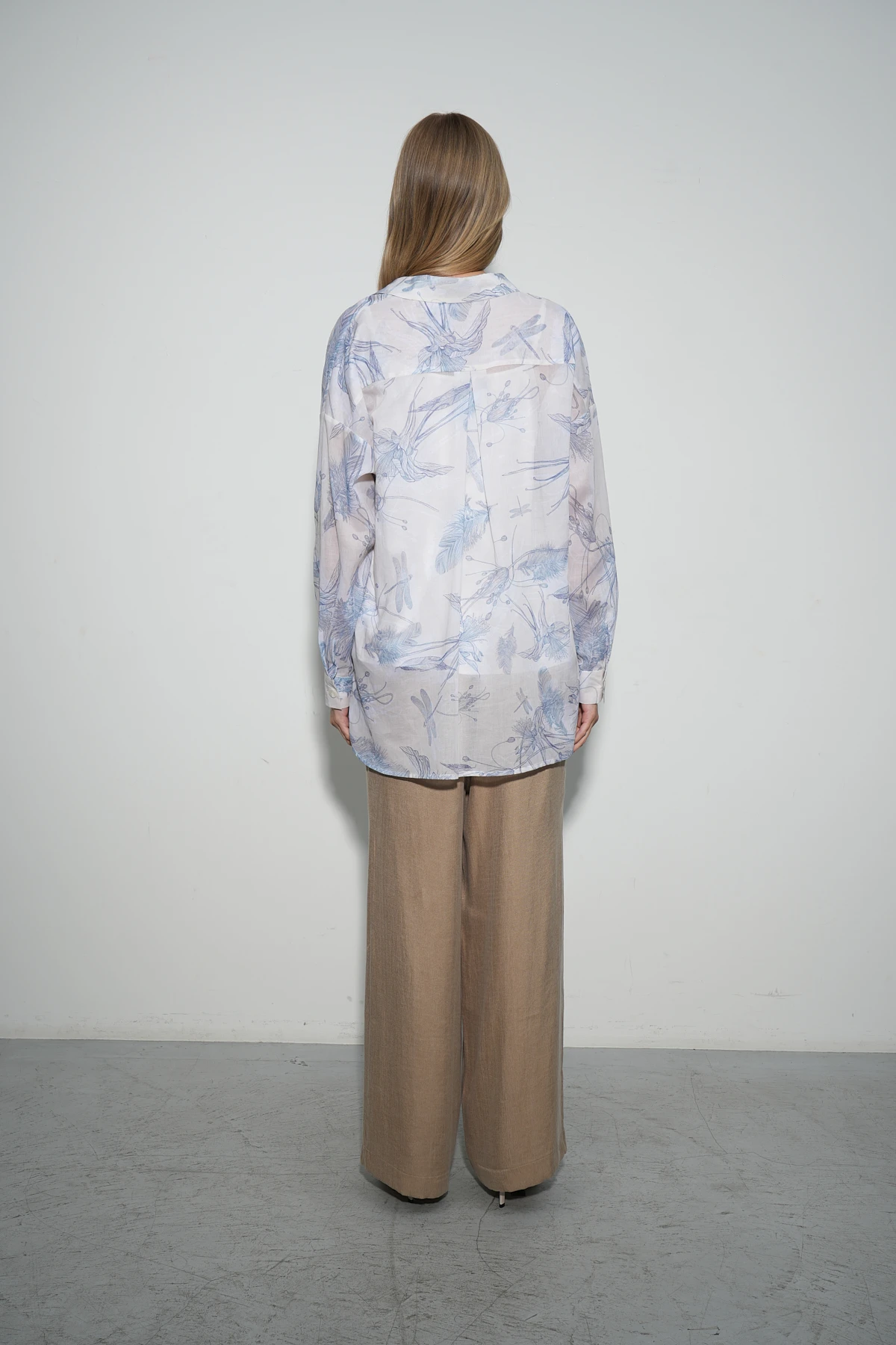 Рубашка из лёгкой полупрозрачной ткани, сочетающей в себе хлопок и вискозу, идеально подходит для летних дней. Авторский принт «Летний этюд» в насыщенном синем оттенке гармонично смотрится на песочном фоне, добавляя модели элегантности. Свободный крой с рубашечным воротником на притачной стойке обеспечивает удобство и стиль. Накладные карманы по переду добавляют практичности, а кокетка и встречная складка на спинке создают комфортную посадку. Рукава полной длины со спущенной линией плеча и аккуратными защипами в манжеты подчёркивают изысканность дизайна. Разные длины переда и спинки позволяют носить рубашку как заправленной, так и навыпуск. Застёжка-планка на светлые роговые пуговицы завершает утончённый образ. Летнее настроение рубашки подчёркивают лёгкость ткани, свежесть оттенков и изысканный принт, вдохновляющий на солнечные образы.