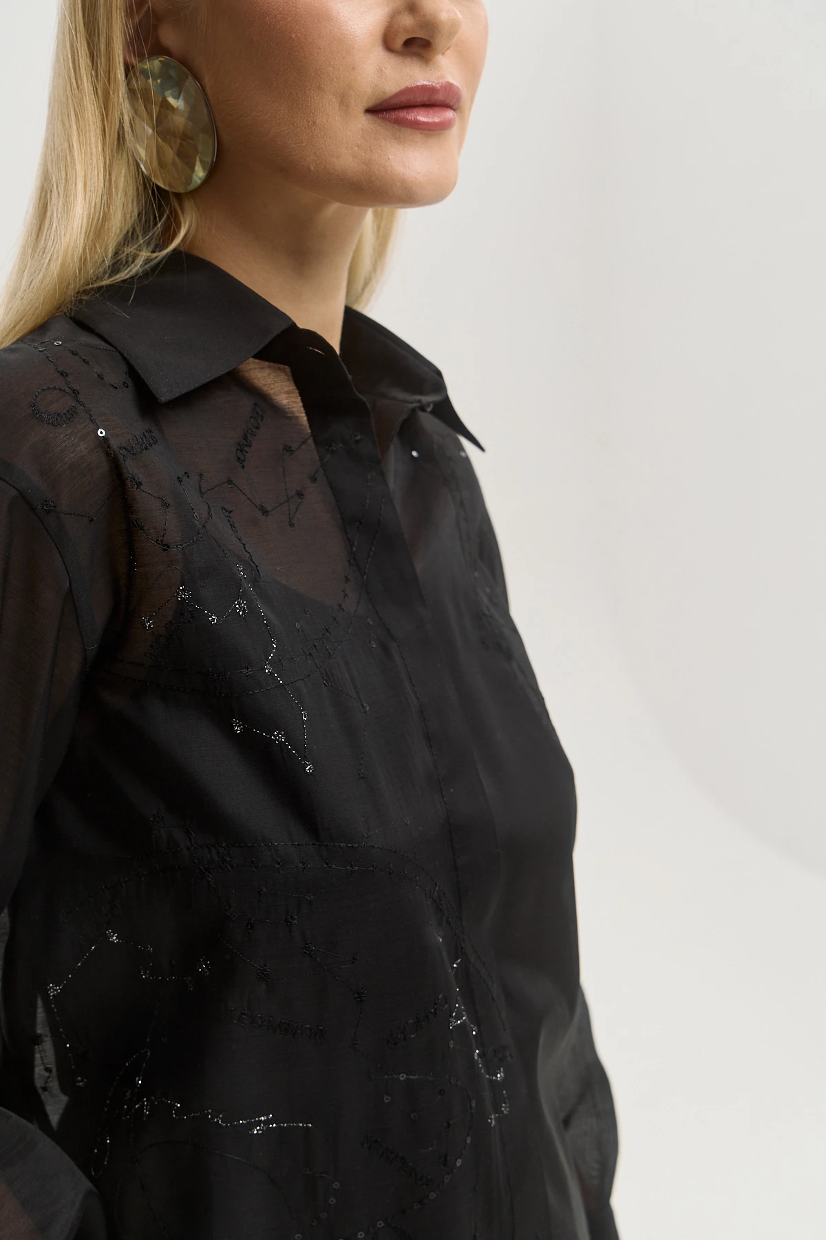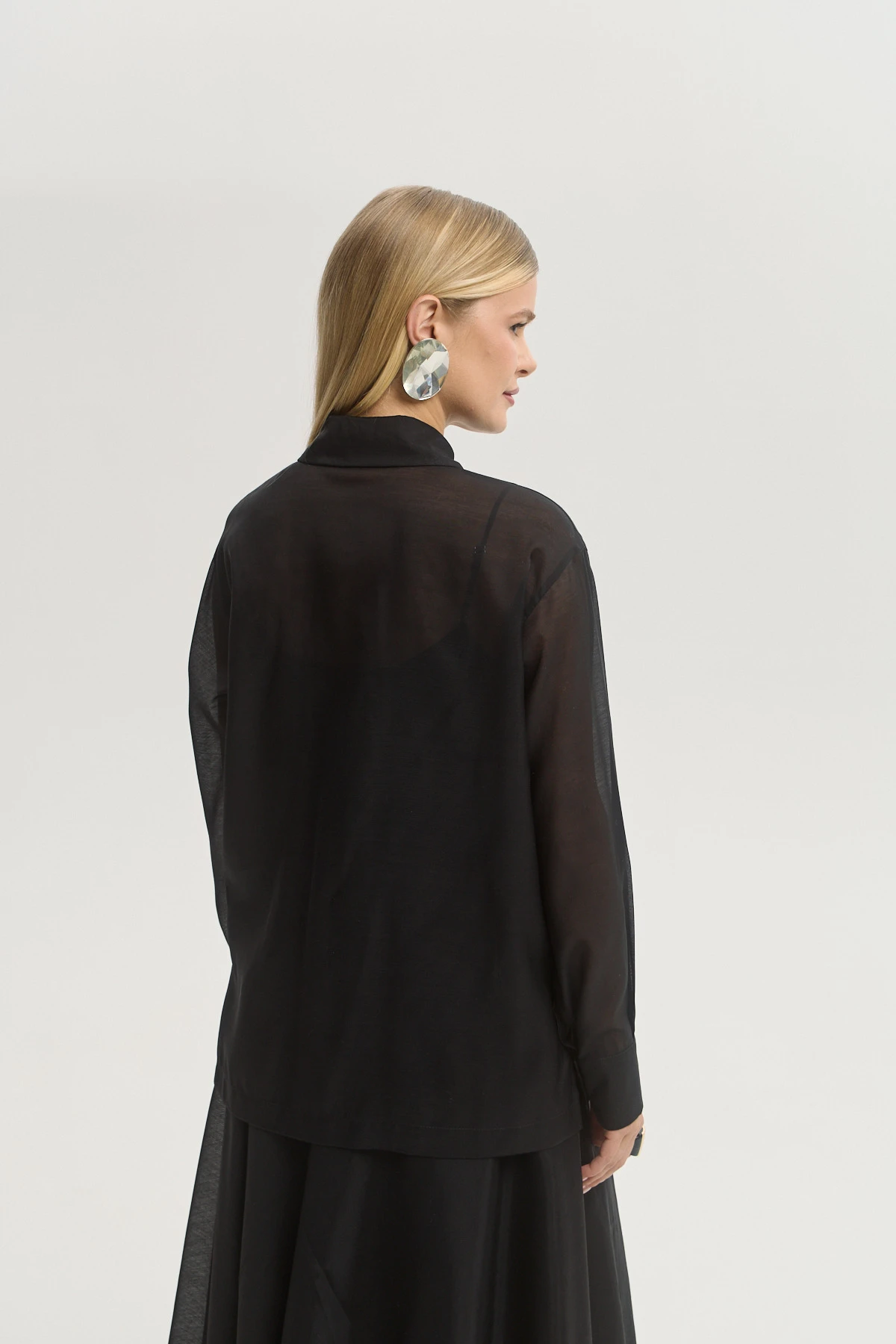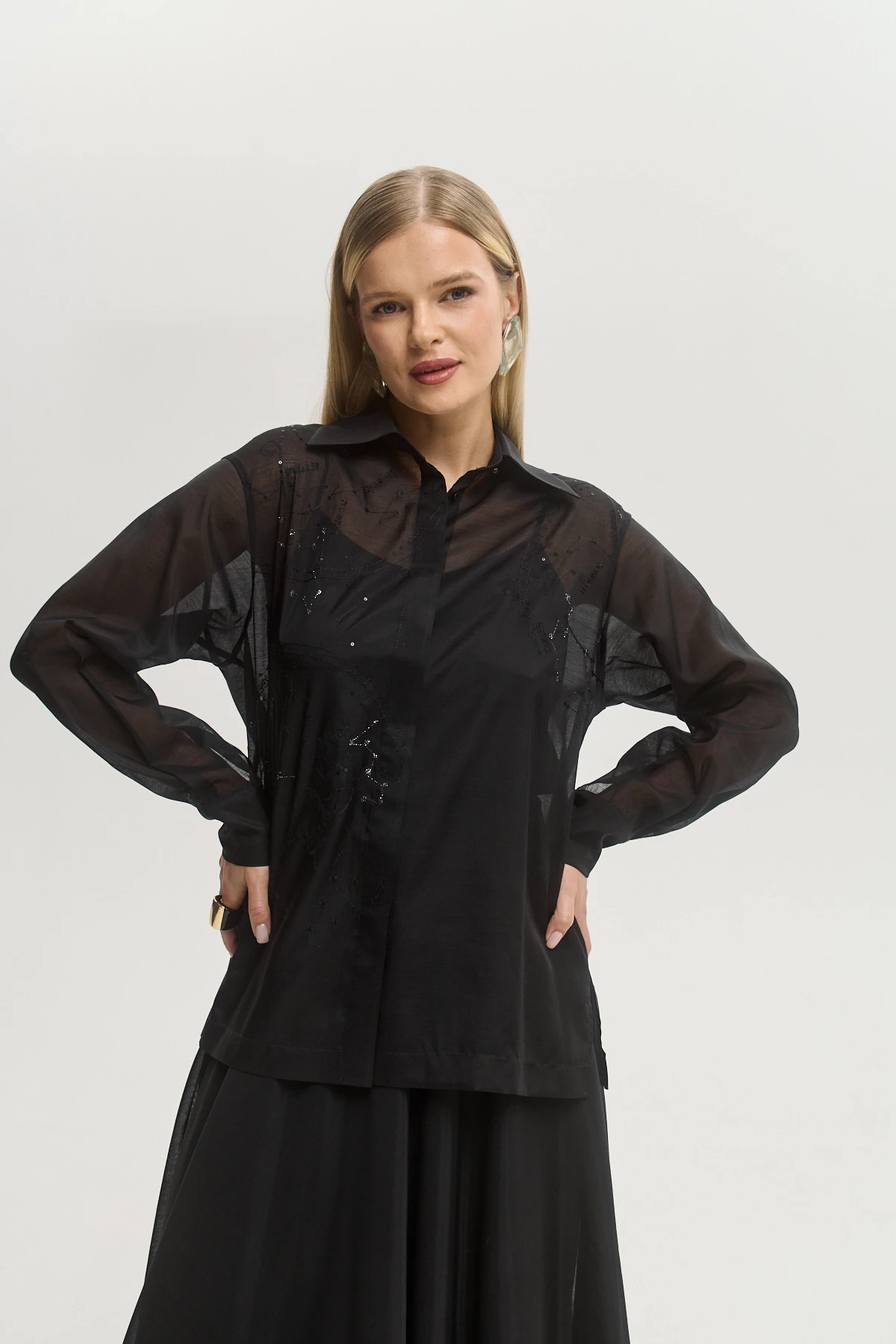 Универсальный черный цвет — базовый и выразительный одновременно, легко адаптируется под вечерние и дневные стилизации. Полупрозрачная ткань с легким блеском создает чувственный эффект без излишней откровенности. Свободный крой делает рубашку современной альтернативой классической блузе. Можно носить заправленной, навыпуск или нараспашку как лёгкий жакет — высокая стилистическая вариативность. Сочетается с брюками, юбками, джинсами и платьями-комбинациями, открывая десятки актуальных комбинаций.