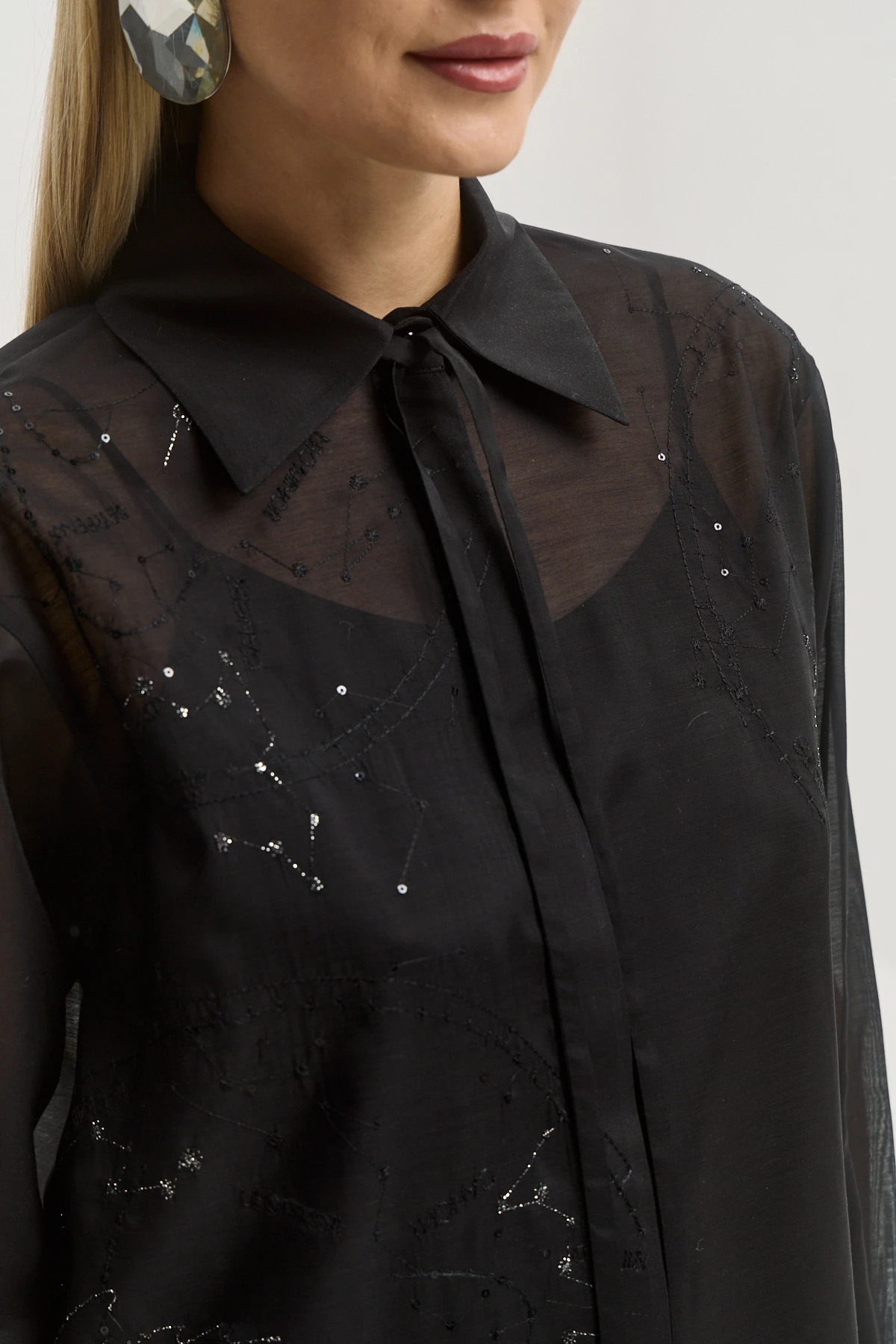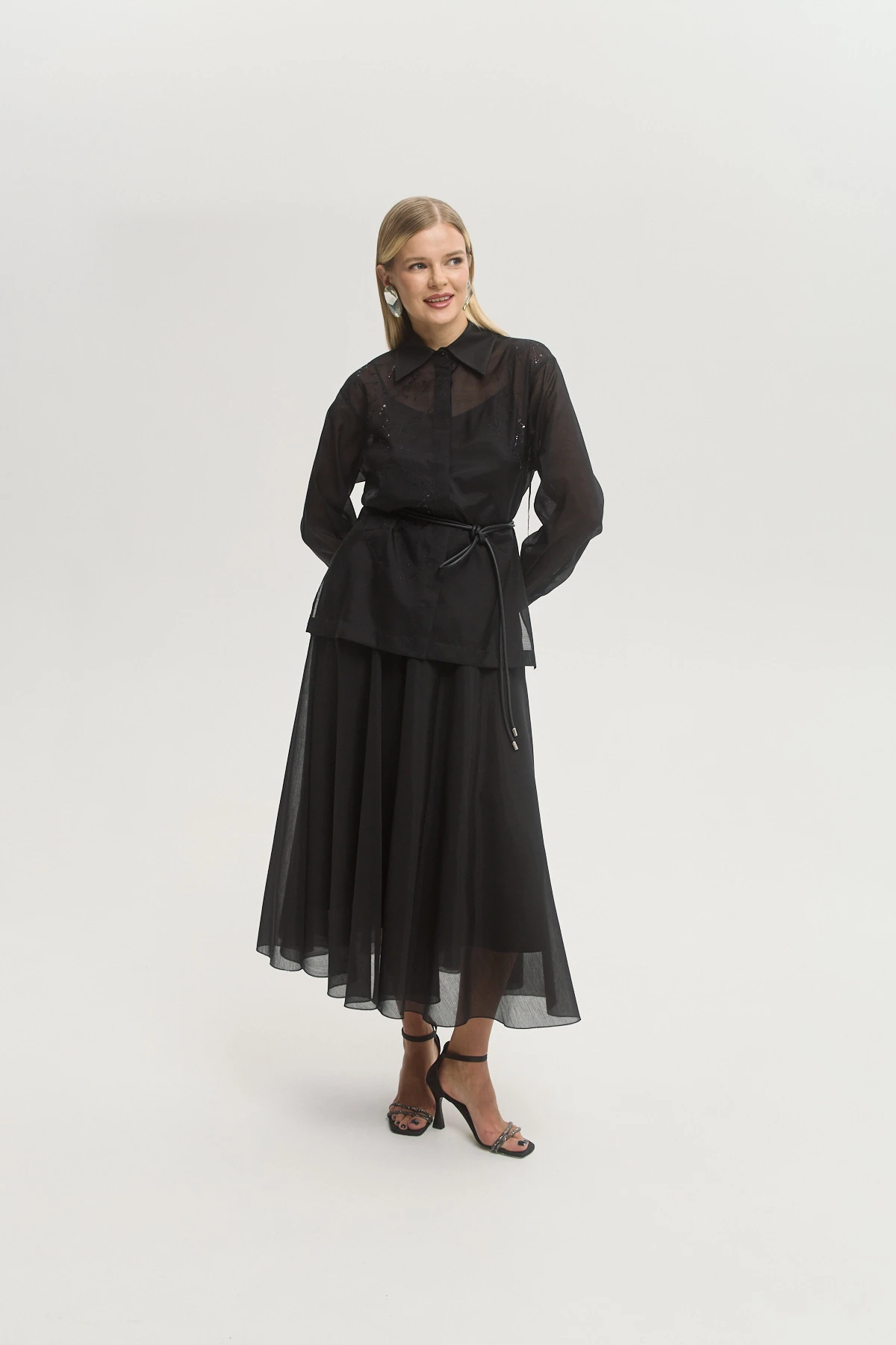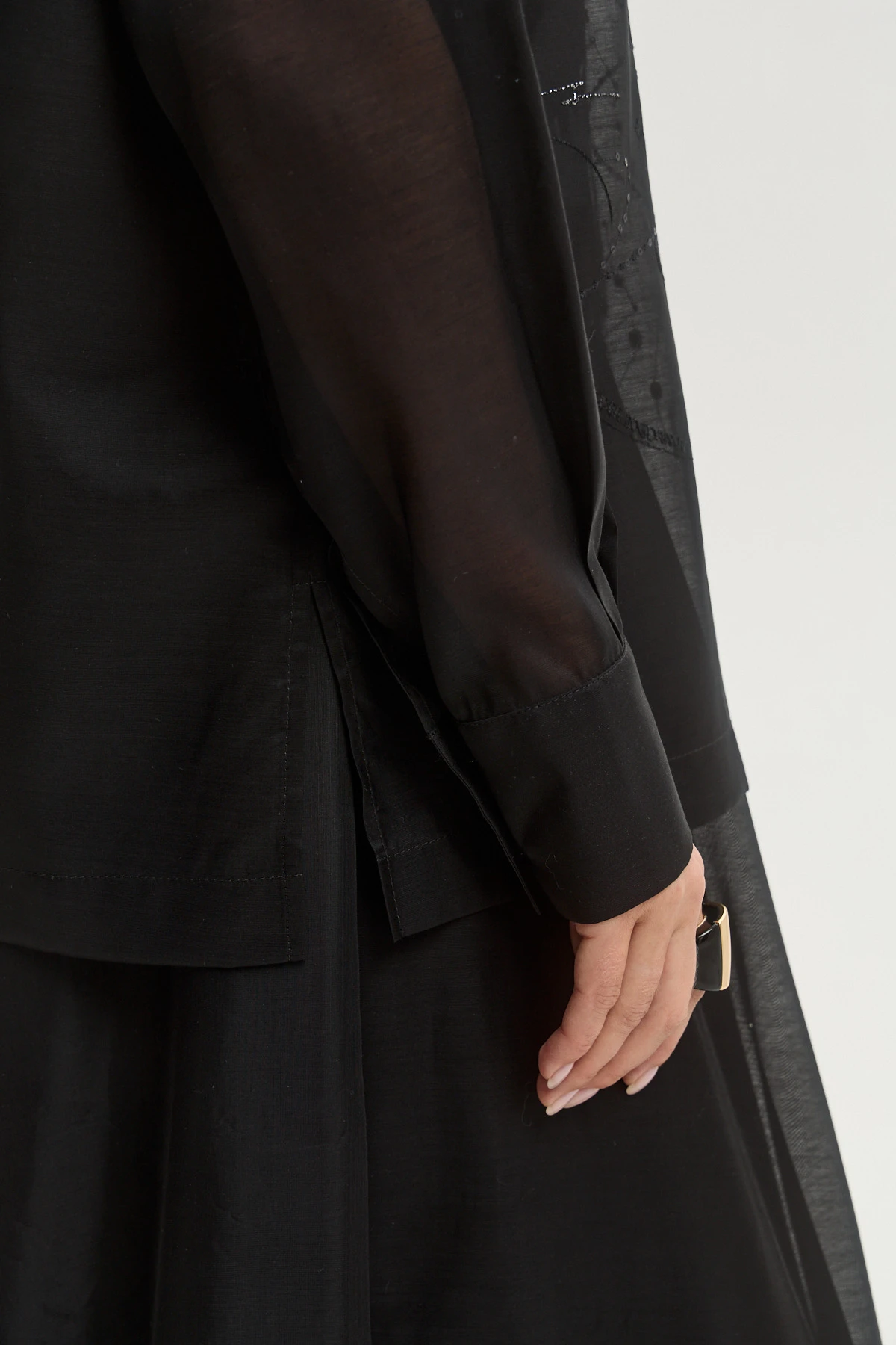 Универсальный черный цвет — базовый и выразительный одновременно, легко адаптируется под вечерние и дневные стилизации. Полупрозрачная ткань с легким блеском создает чувственный эффект без излишней откровенности. Свободный крой делает рубашку современной альтернативой классической блузе. Можно носить заправленной, навыпуск или нараспашку как лёгкий жакет — высокая стилистическая вариативность. Сочетается с брюками, юбками, джинсами и платьями-комбинациями, открывая десятки актуальных комбинаций.
