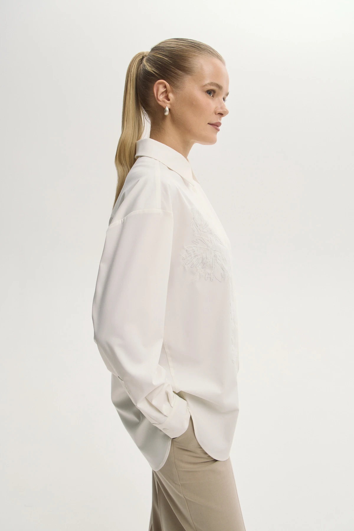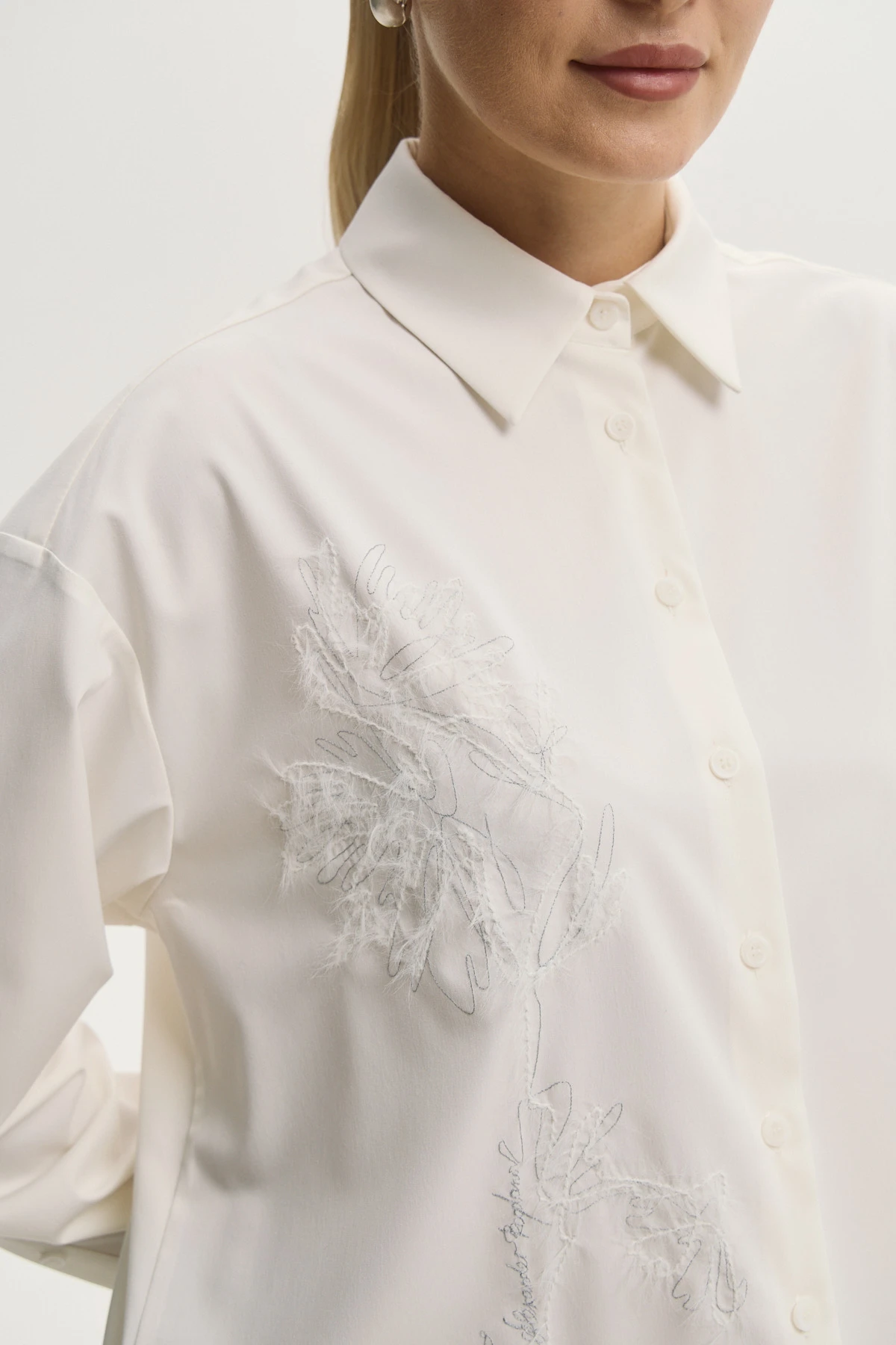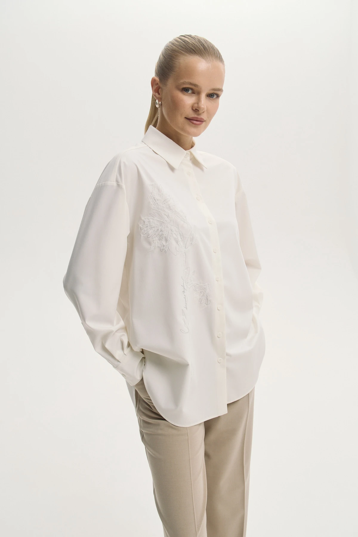 Деликатная вышивка на полочке делает модель выразительной и подчёркивает утончённый стиль. Универсальная длина позволяет носить рубашку как навыпуск, так и заправленной. Молочный оттенок — классическое решение для базового гардероба.