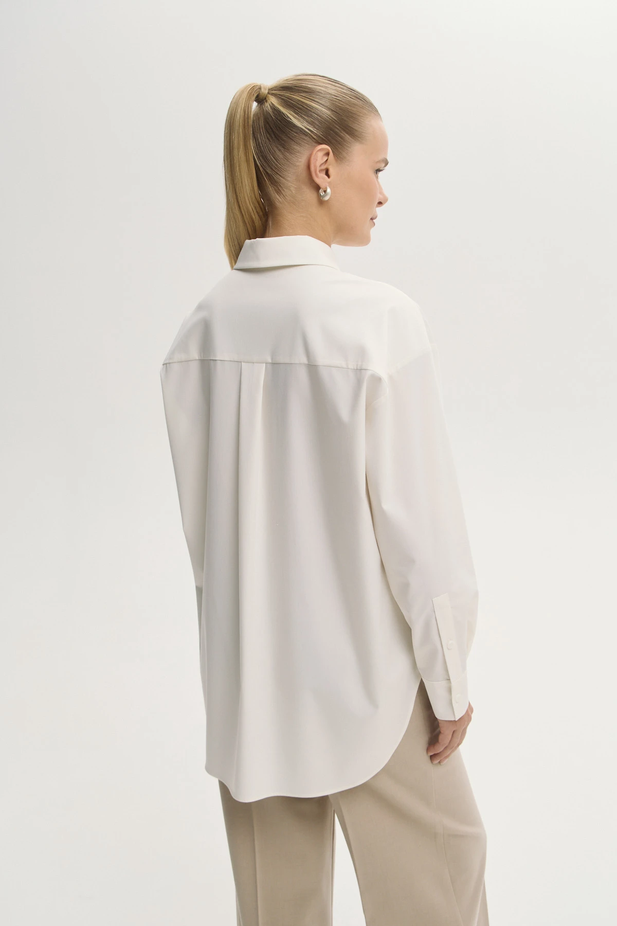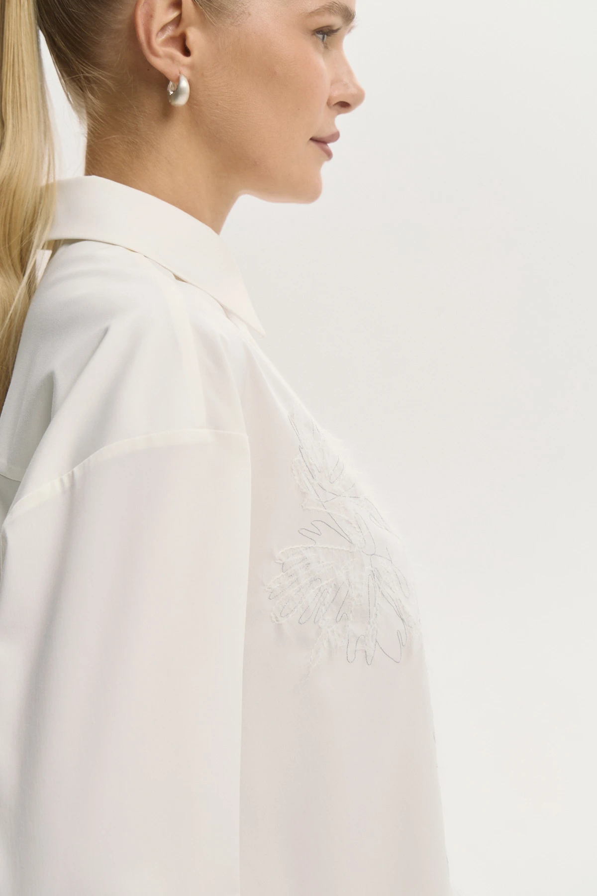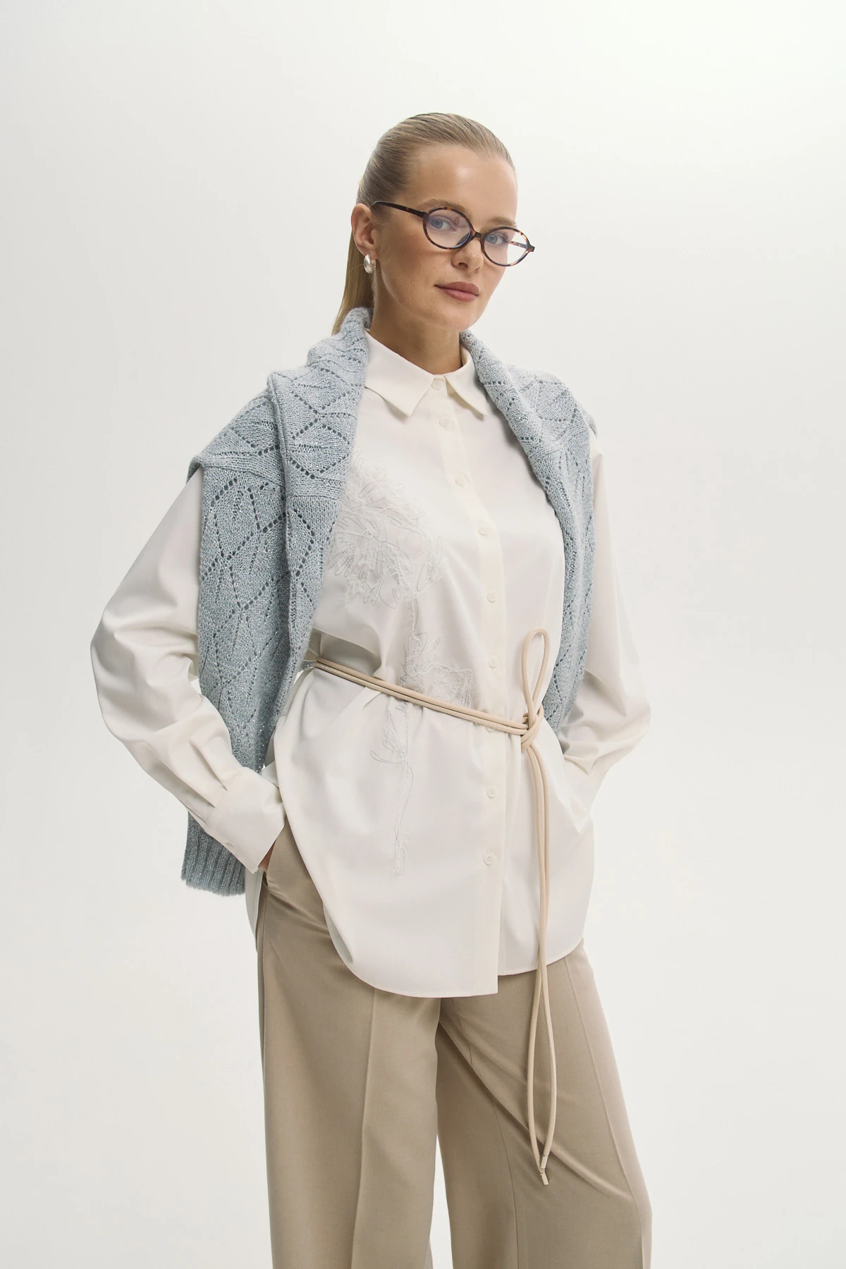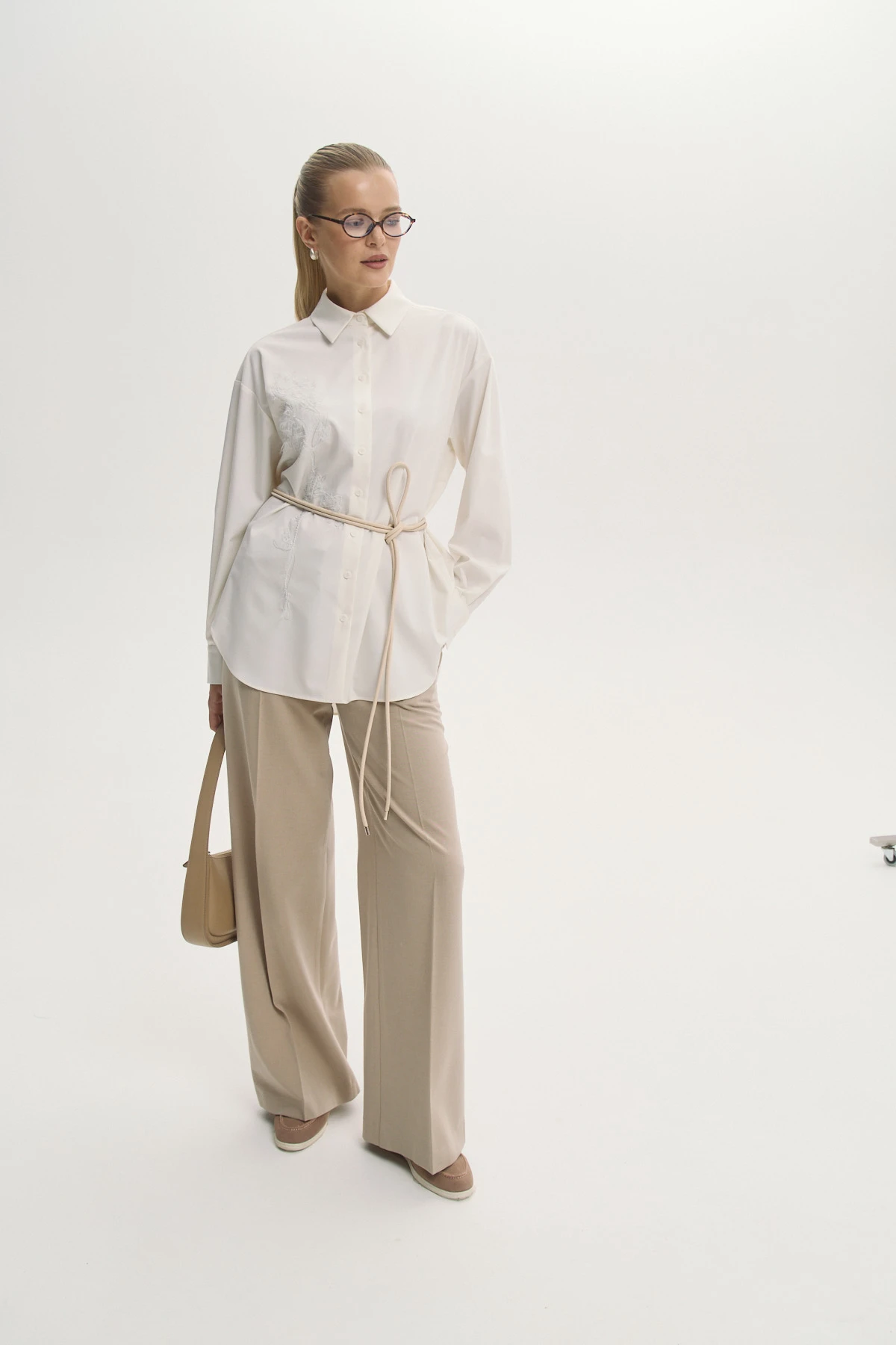 Деликатная вышивка на полочке делает модель выразительной и подчёркивает утончённый стиль. Универсальная длина позволяет носить рубашку как навыпуск, так и заправленной. Молочный оттенок — классическое решение для базового гардероба.