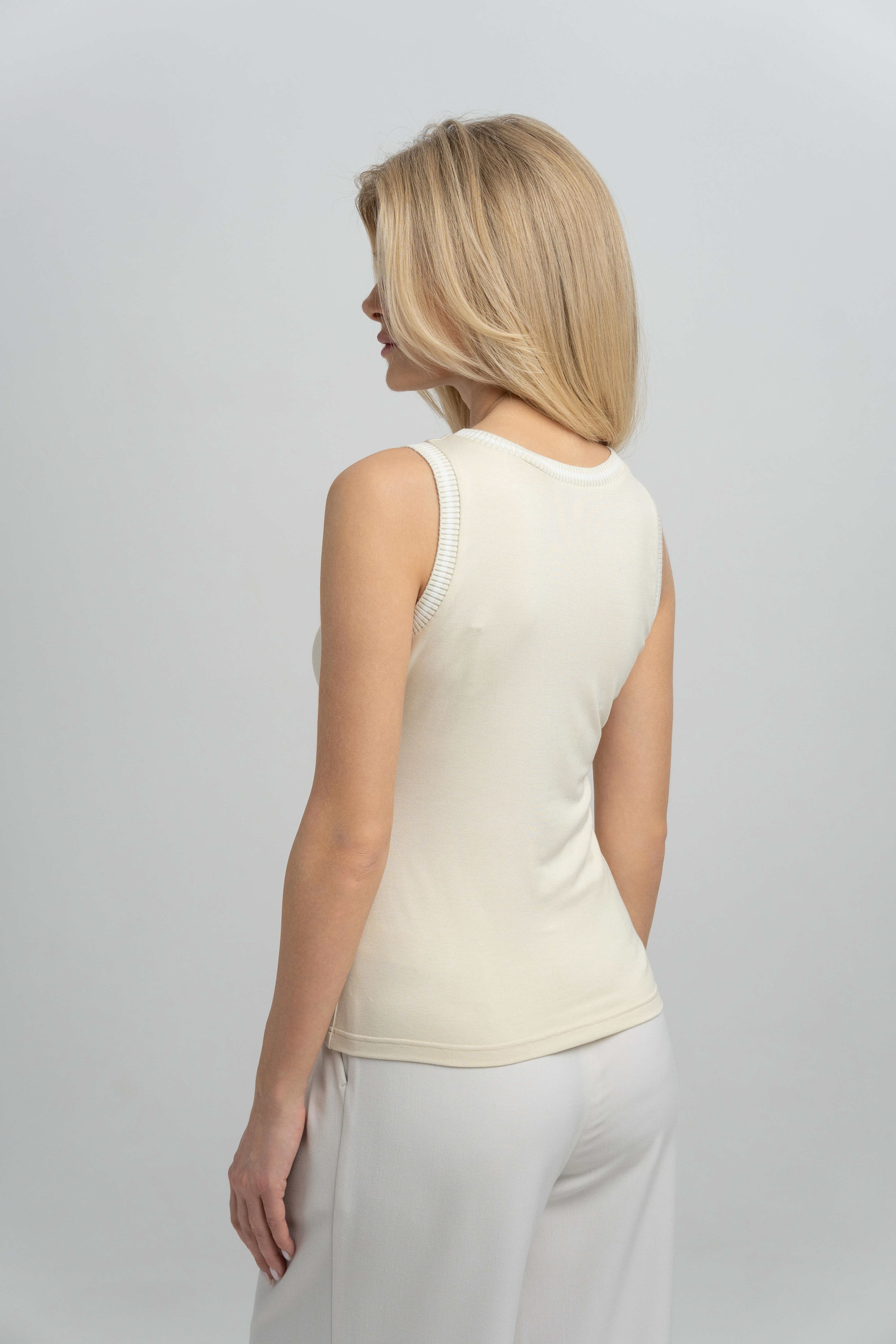 Минималистичный топ — универсальный элемент гардероба, который легко вписывается в повседневные и деловые образы. Модель выполнена из мягкого эластичного трикотажа, комфортного к телу. Акцентная бейка по проймам и вырезу горловины добавляет графичный штрих и завершённость.