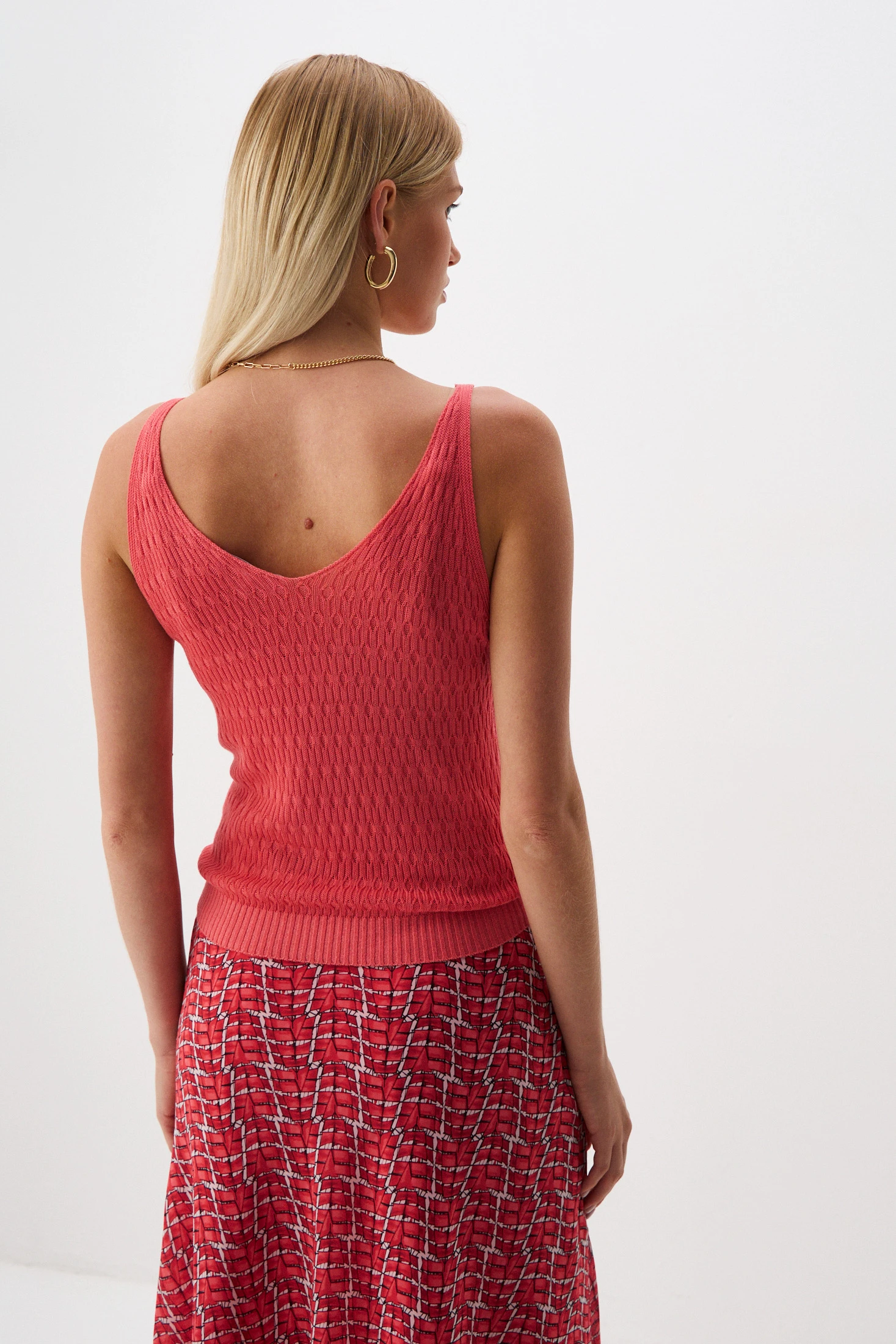 Добавьте яркое настроение своему гардеробу! Топ из трикотажного полотна в алом оттенке с ажурным узором тактильно приятен и гигроскопичен благодаря вискозе в составе. С джинсами или строгим костюмом – он впишется в любую стилистику образа.
