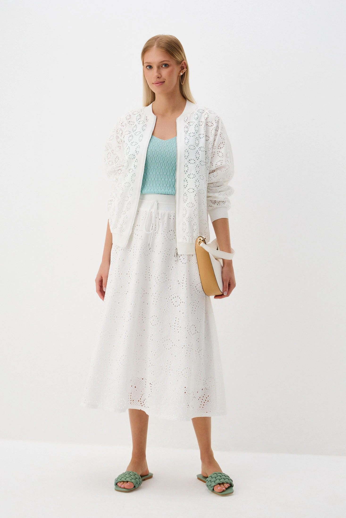 Топ из трикотажного полотна в мятном оттенке с ажурным узором тактильно приятен и гигроскопичен – 100% технологичный тенсел комфортен в носке и прост в уходе. С джинсами или строгим костюмом – топ впишется в любую стилистику образа.