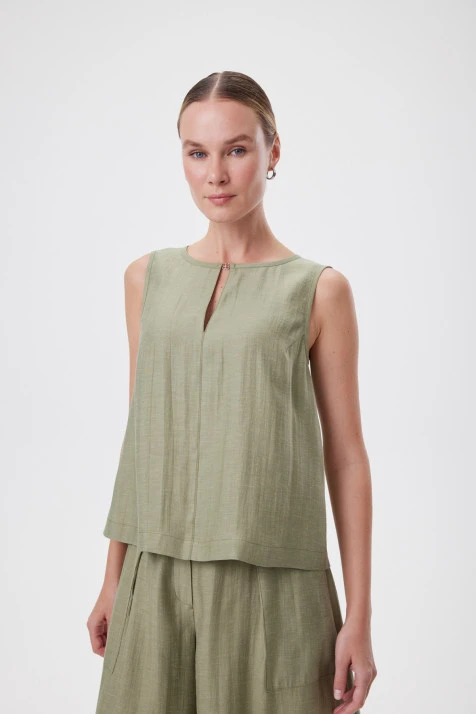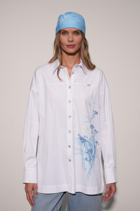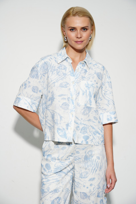 Топ выполнен из 100% вискозы — приятной к телу, гигроскопичной, дышащей ткани. Лаконичный силуэт с круглым вырезом подчёркивает линию шеи. Авторский принт в небесной гамме создаёт лёгкое настроение. Универсальная длина позволяет носить топ как навыпуск, так и заправленным. Идеален для многослойных образов — легко комбинируется с жакетами и рубашками.