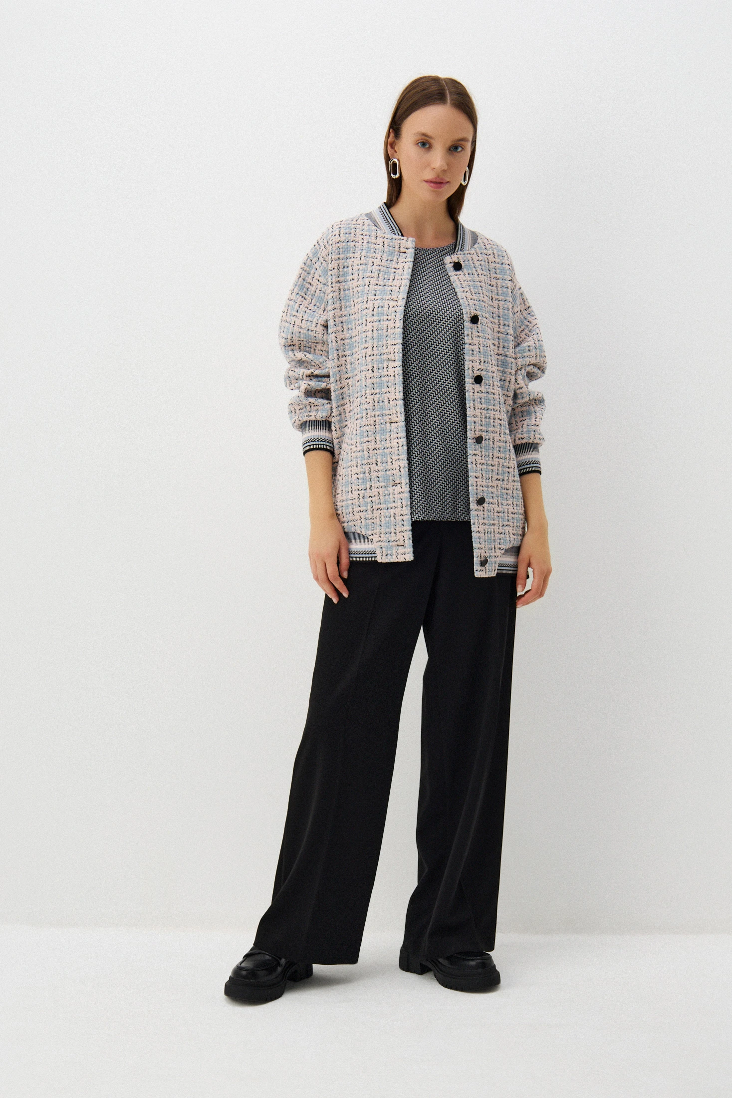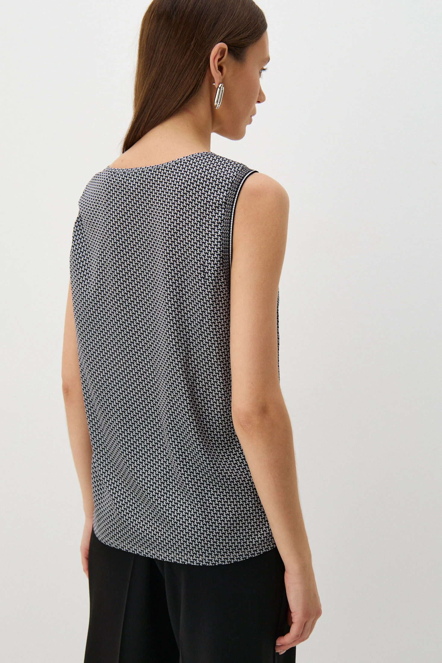 Топ выполнен из тактильно приятной, струящейся ткани с сатиновым блеском. Мелкораппортный геометричный принт выполнен в ахроматичных оттенках. Модель можно надеть и с расслабленными джинсами, и со строгим костюмом.