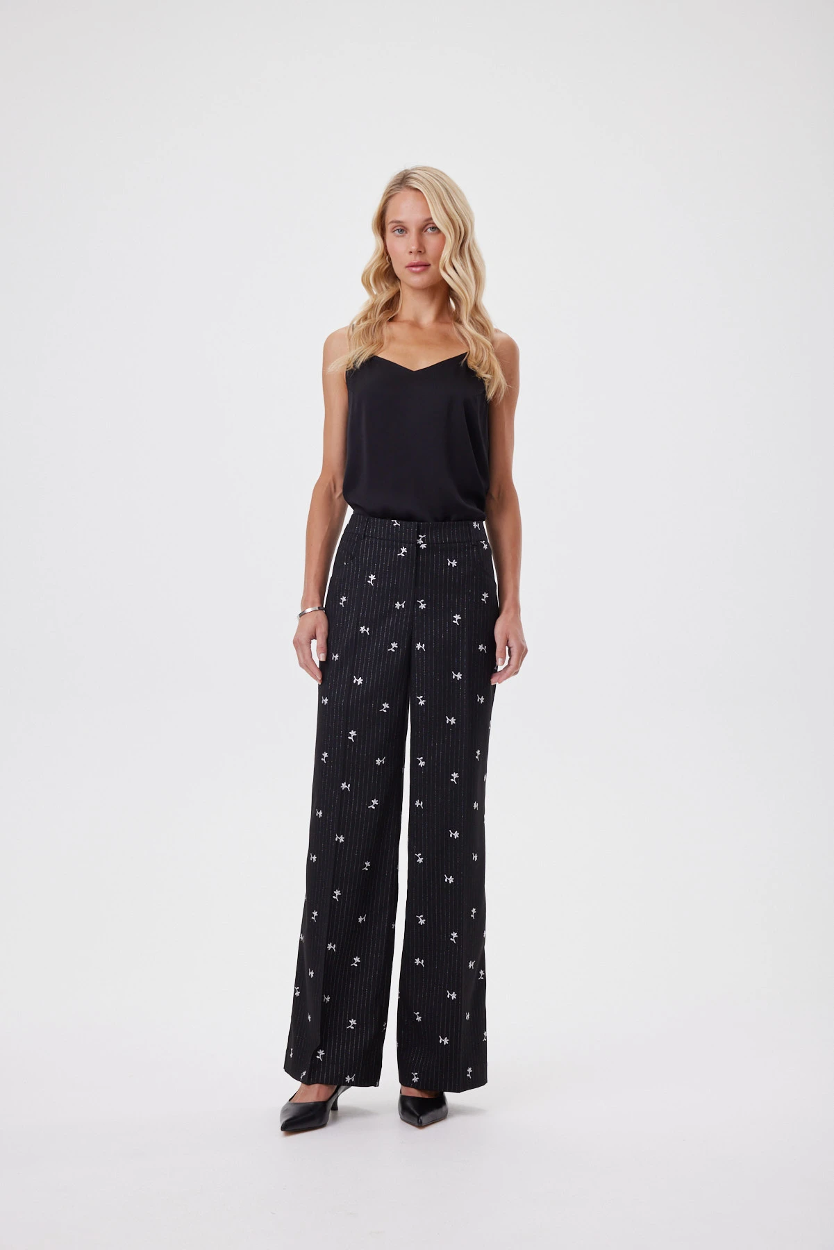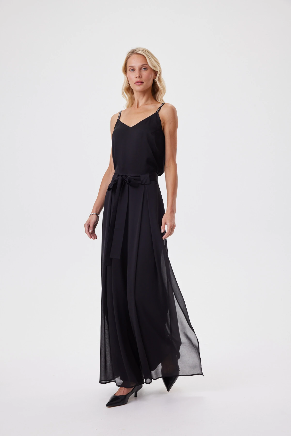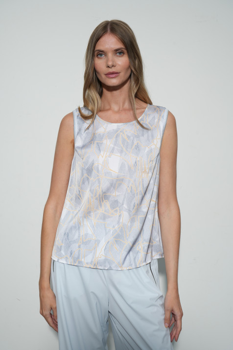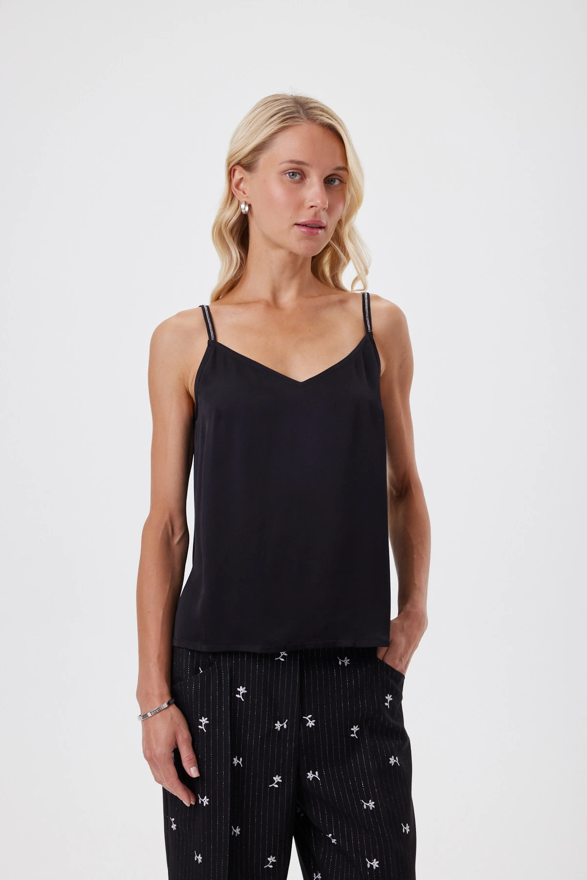 Топ выполнен в лаконичном, укороченном силуэте с деликатным V-вырезом, который мягко раскрывает линию декольте. Посадка свободная: ткань не обтягивает, а драпируется по фигуре, визуально облегчая верх и красиво работая с высокой талией. Тонкие регулируемые бретели с монилью в три нити заменяют украшение и позволяют точно настроить высоту посадки. Премиальная смесь вискозы и района ощущается как лёгкий шёлковый поток: прохладная, гладкая, пластичная, она струится в движении. Сочетайте с брюками wide leg, юбкой-карандаш или денимом; поверх — жакет или лёгкий бомбер для вечернего слоя.