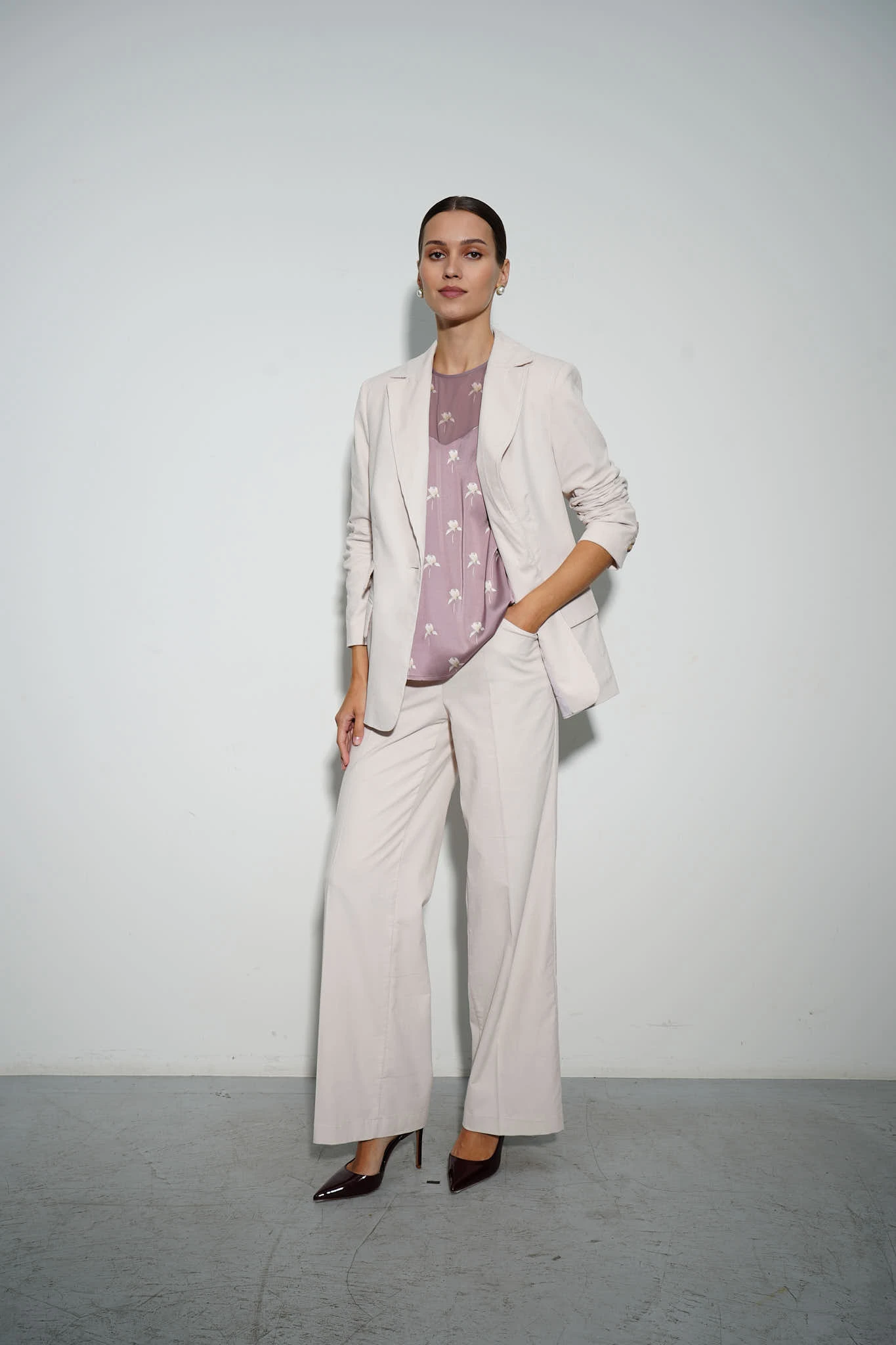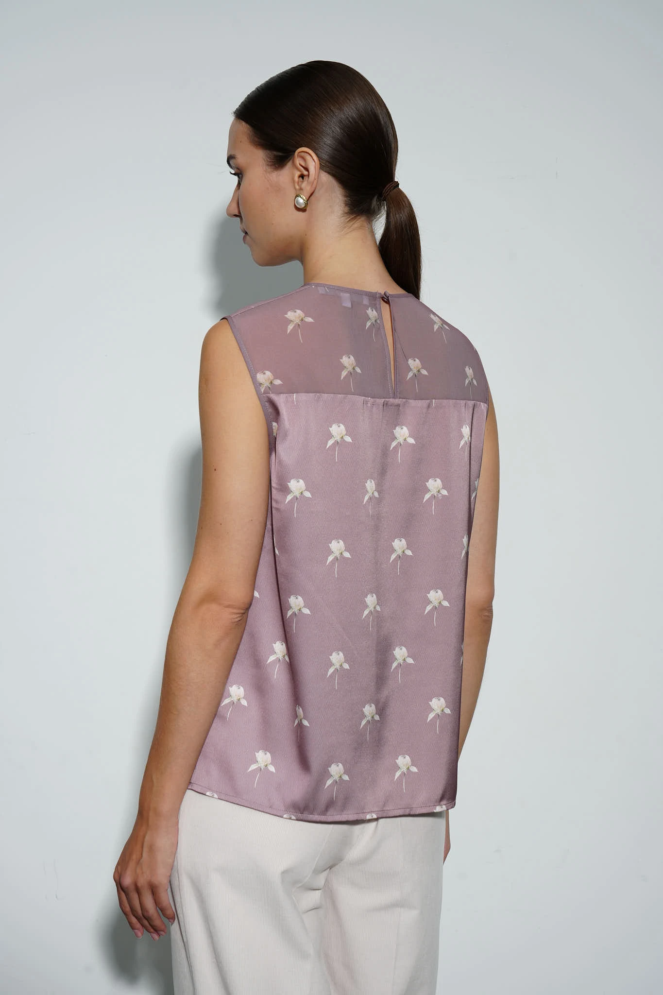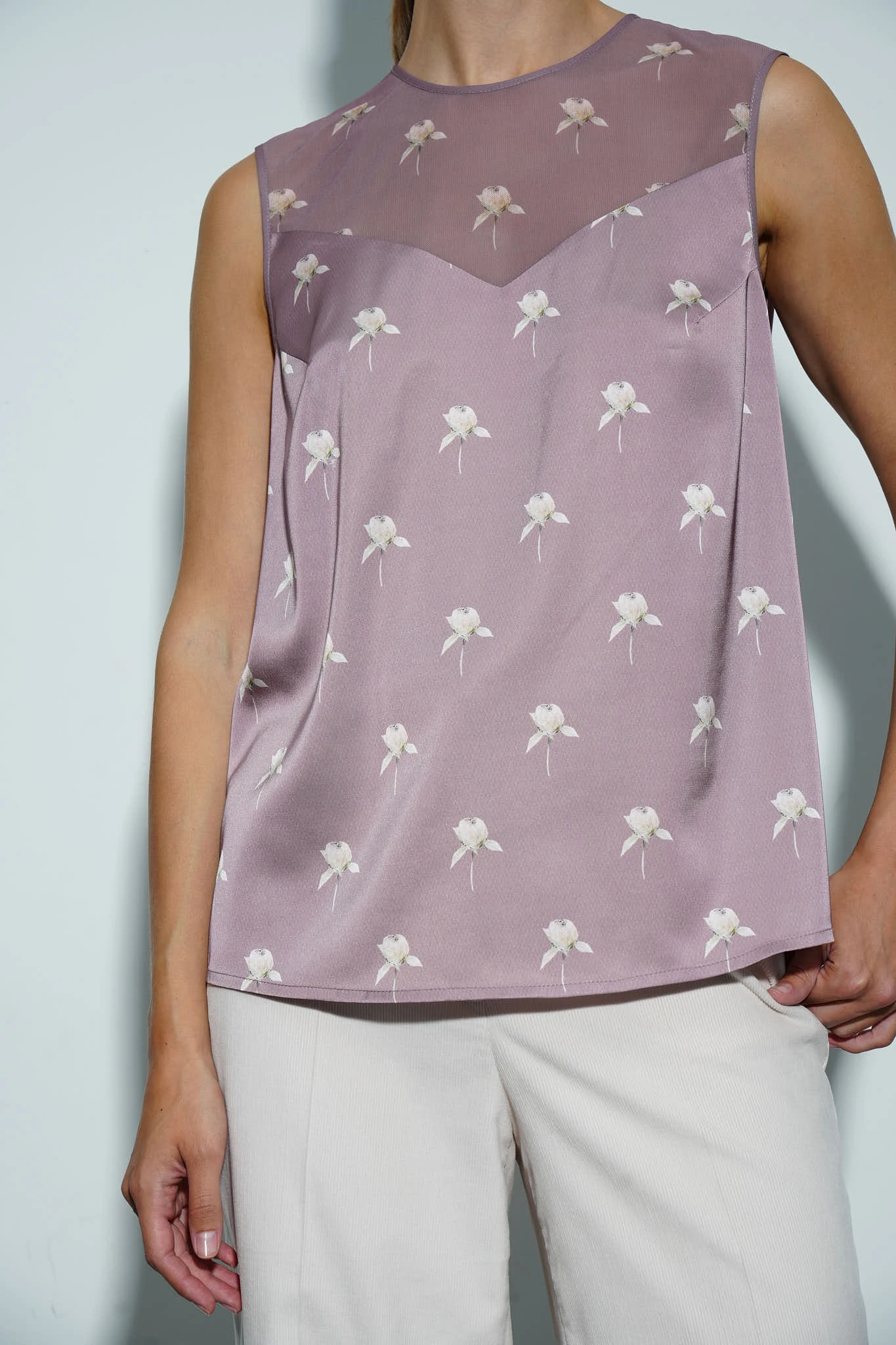 Топ из нежного атласа в оттенке «пралине» с авторским принтом в виде бутонов пиона —утончённая и романтичная модель. V-образная кокетка из эластичной сетки изящно подчёркивает линию декольте, а свободный крой обеспечивает комфорт и расслабленность. Горловина и проймы окантованы ткаью-компаньоном, а вырез-капля на спинке с перламутровой пуговицей придаёт образу нотку изысканности. Топ станет идеальным дополнением к элегантному образу, придавая ему нежности и шарма.
