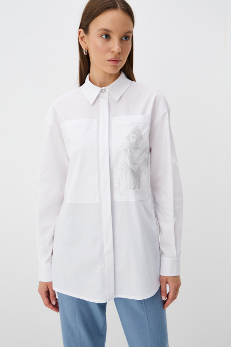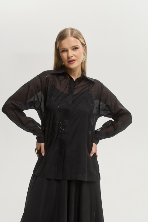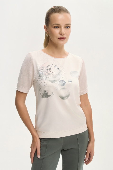 По форме выреза топа выложены две тесьмы с разными видами бусин. Это не готовый фабричный элемент, а кропотливая работа: каждая лента оформлена по-своему, а их комбинация создаёт объёмный, переливающийся контур, поэтому можно обойтись без ожерелья и выглядеть нарядно. Чистый белый цвет, ровное полотно и мерцающая отделка горловины — всё это не кричит, а тихо собирает образ, подчёркивает шею и ключицы, освежает лицо и делает любой низ более аккуратным. Вискоза даёт мягкость и ощущение “второй кожи”, нейлон отвечает за упругость и “пружинность”: изделие не вытягивается, не теряет своей эластичности по низу и проймам, после носки возвращается к первоначальной форме.
