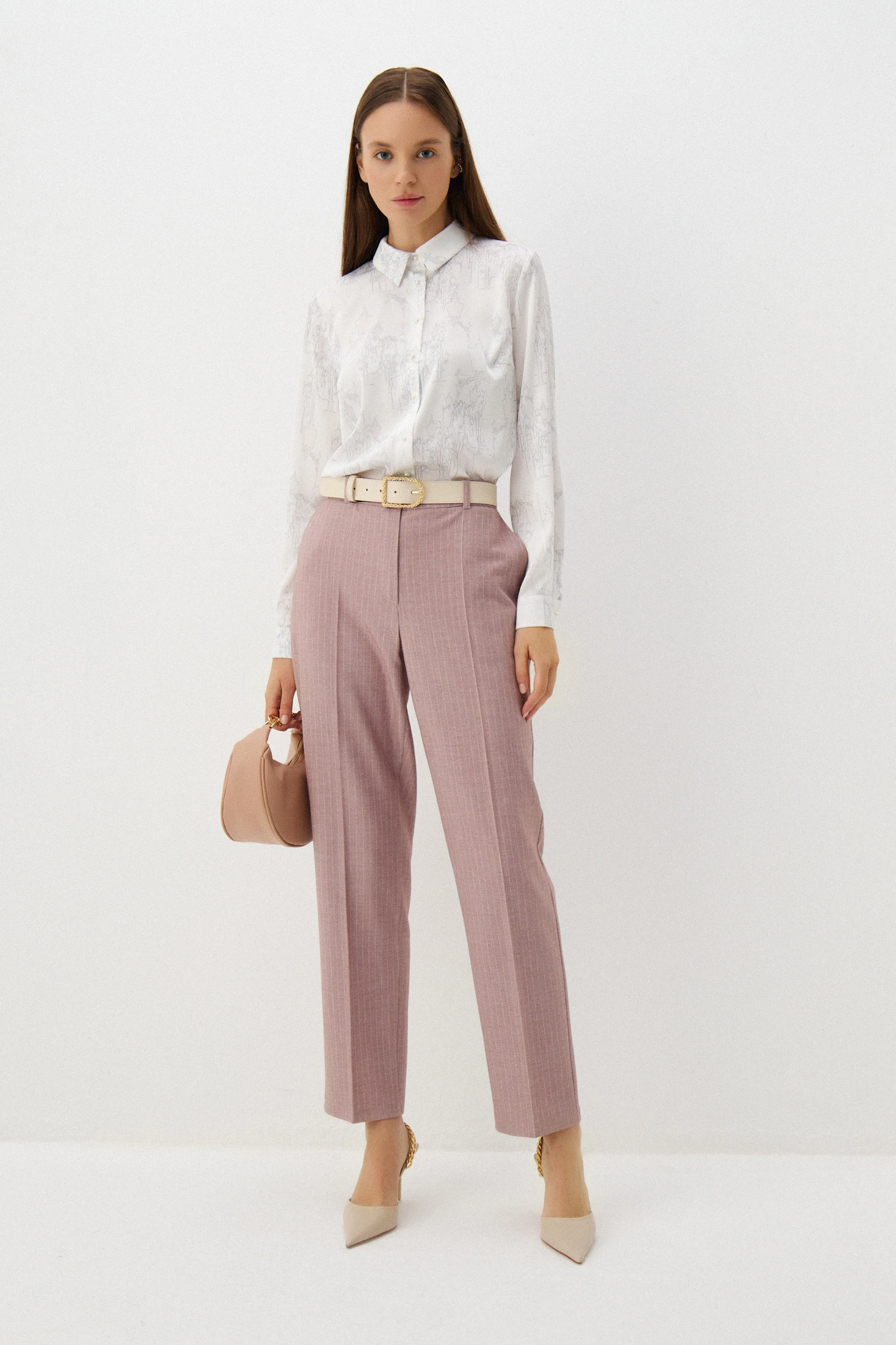 Брюки со стрелками – классика делового стиля. Тонкая полоска ткани подчёркивает стройность ног. Сочетайте модель с рубашками, романтичными блузами или базовыми футболками – и образы с брюками будут уместны как в офисе, так и в casual-образах.