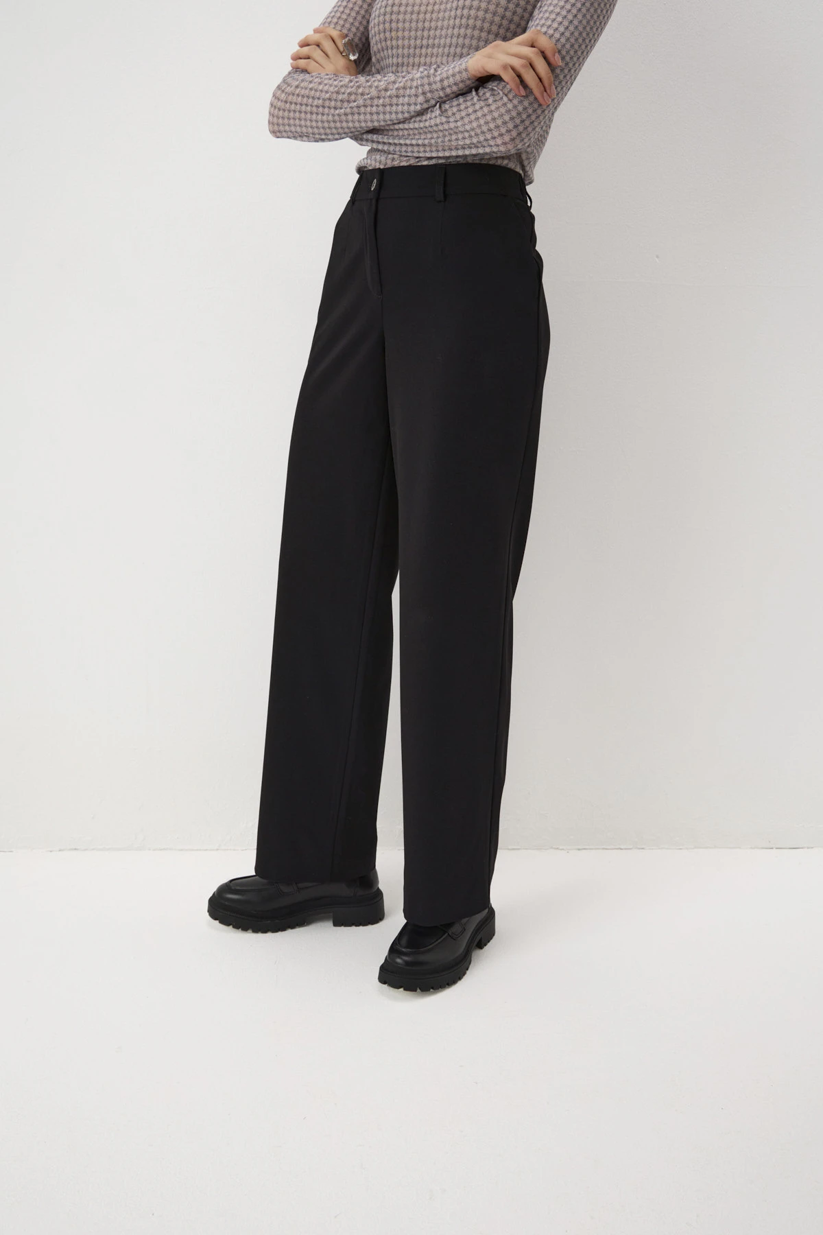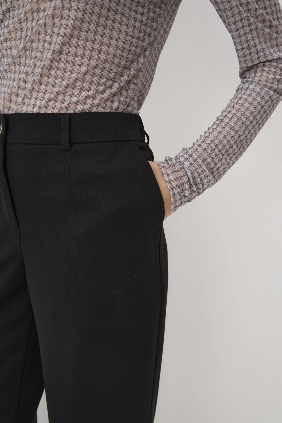 Классические черные брюки - важный элемент гардероба, который может быть использован в различных ситуациях: от офисных занятий до формальных мероприятий. Безупречный крой и идеальная посадка по фигуре – брюки станут прекрасной базой для повседневных и праздничных образов. Предусмотрены шлёвки для ношения ремня. Застёжка на молнию и брендированную пуговицу.