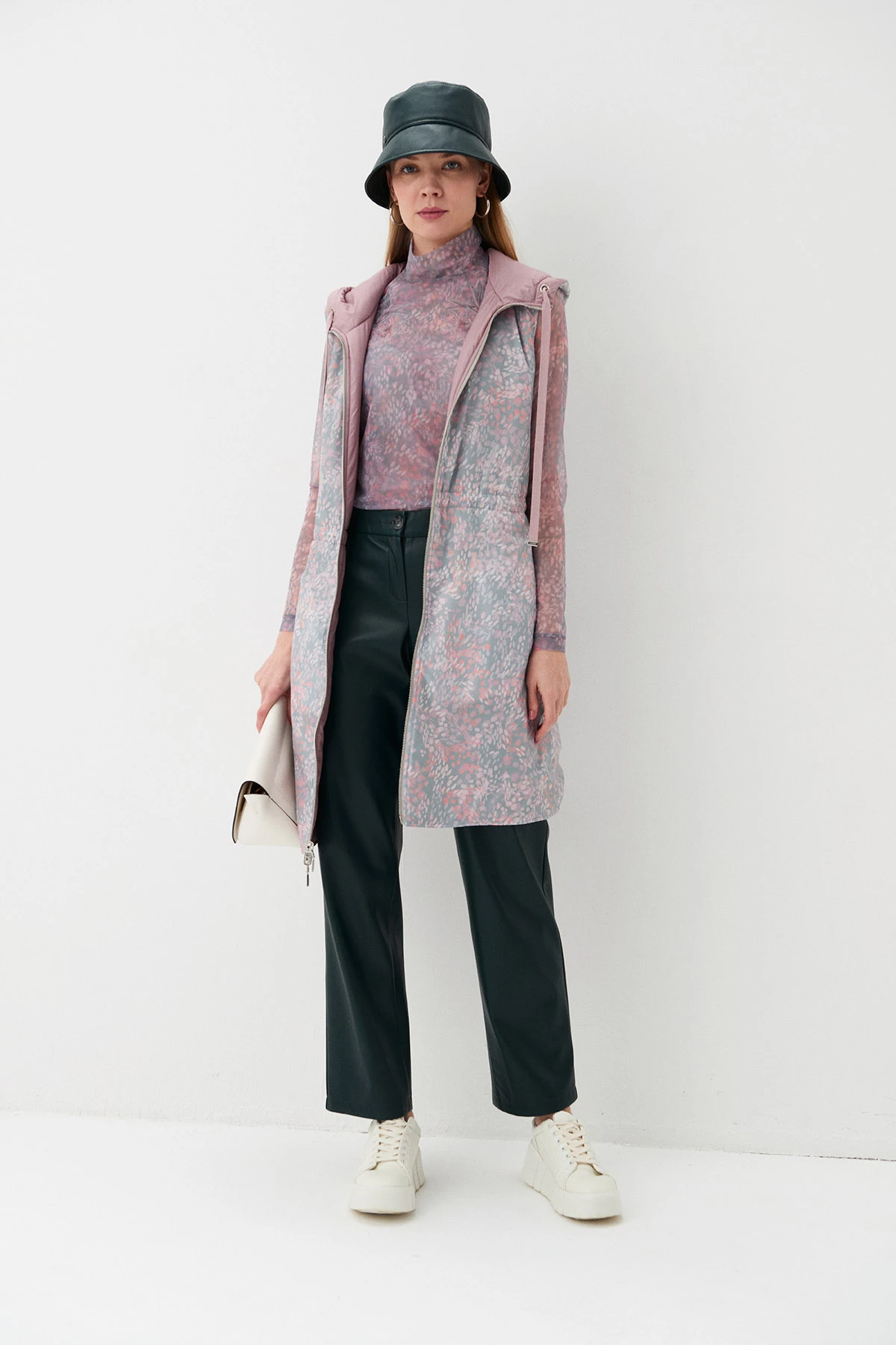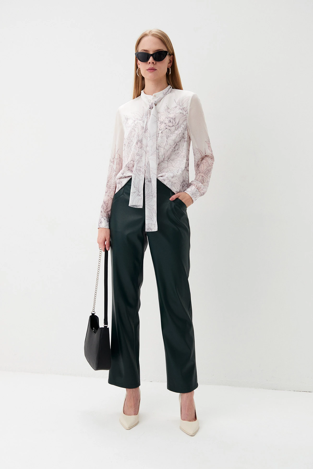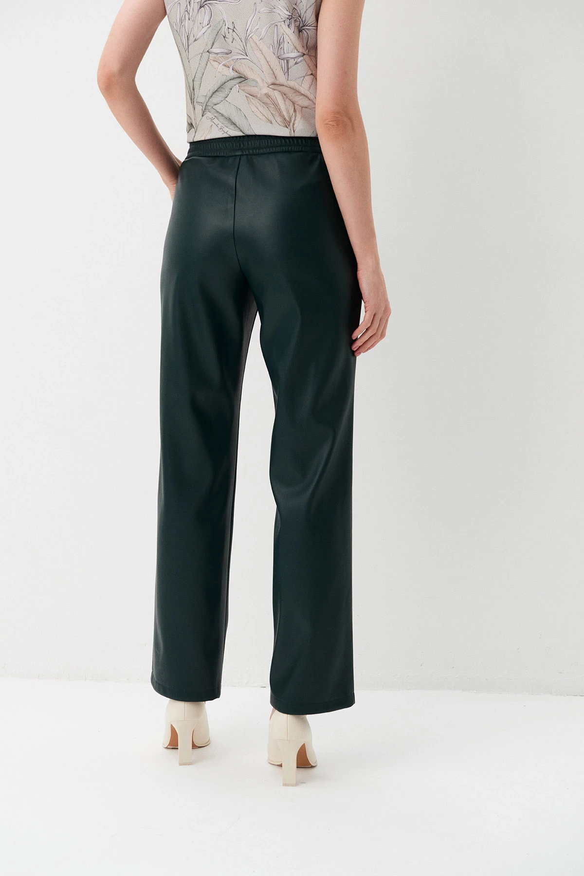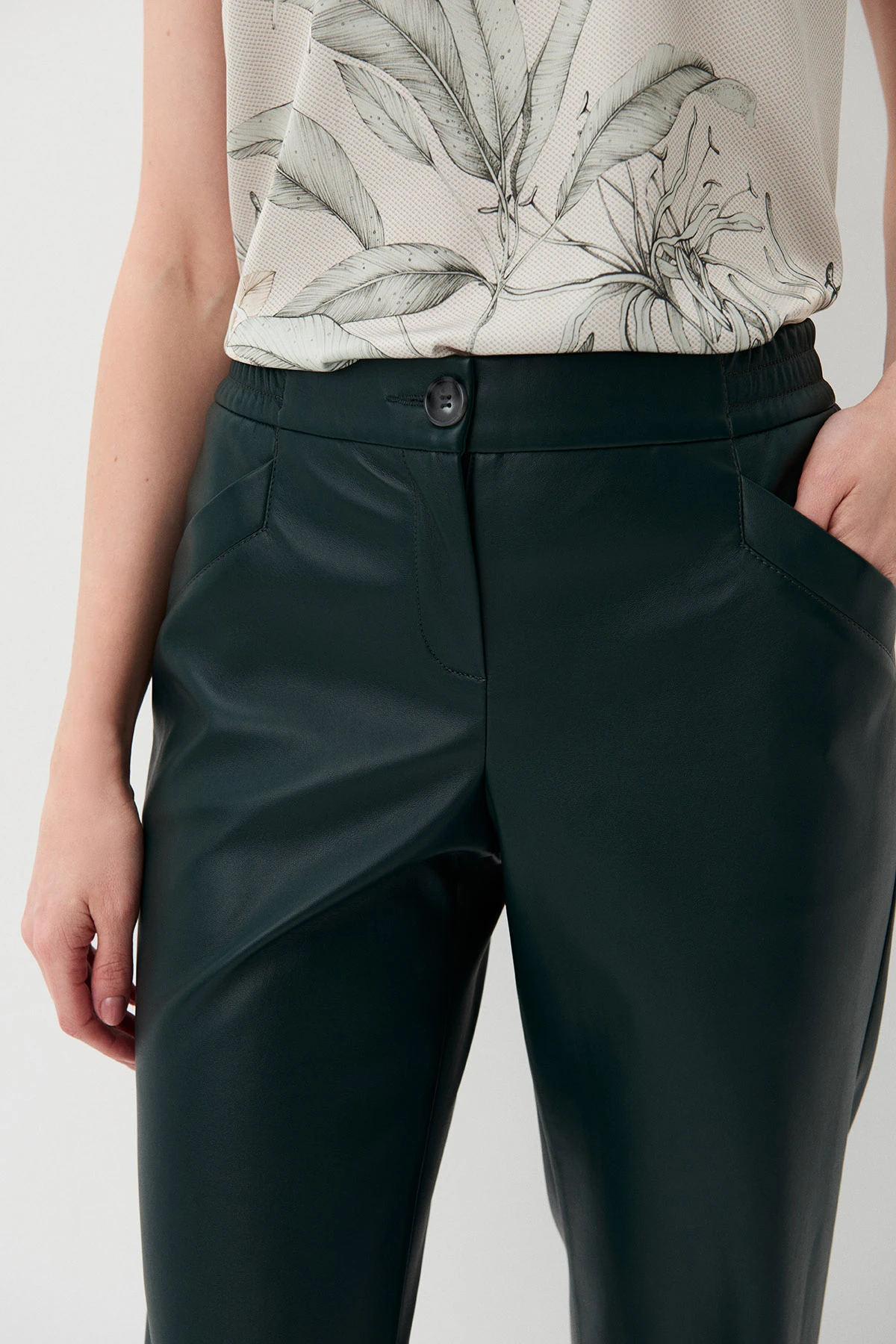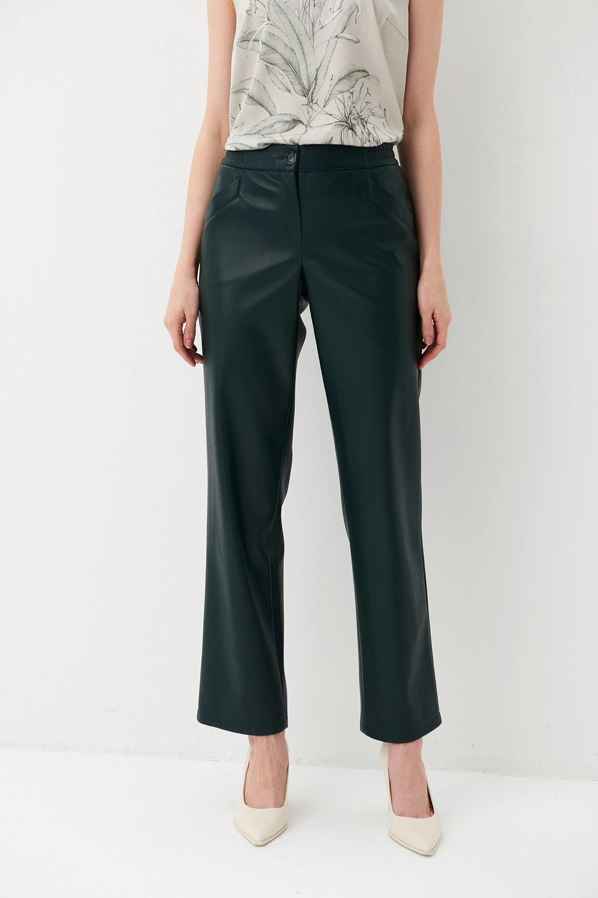 Ткань:Новинка! Брюки из экокожи в насыщенном тёмно-зелёном оттенке. Экокожа – практичный материал, не требующий стирки. Прочное покрытие из полиуретана не трескается, не деформируется,