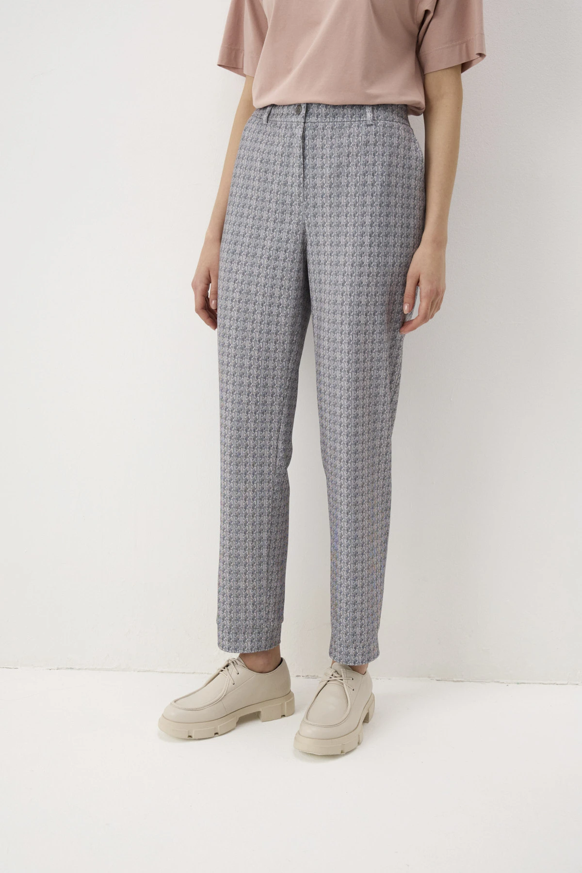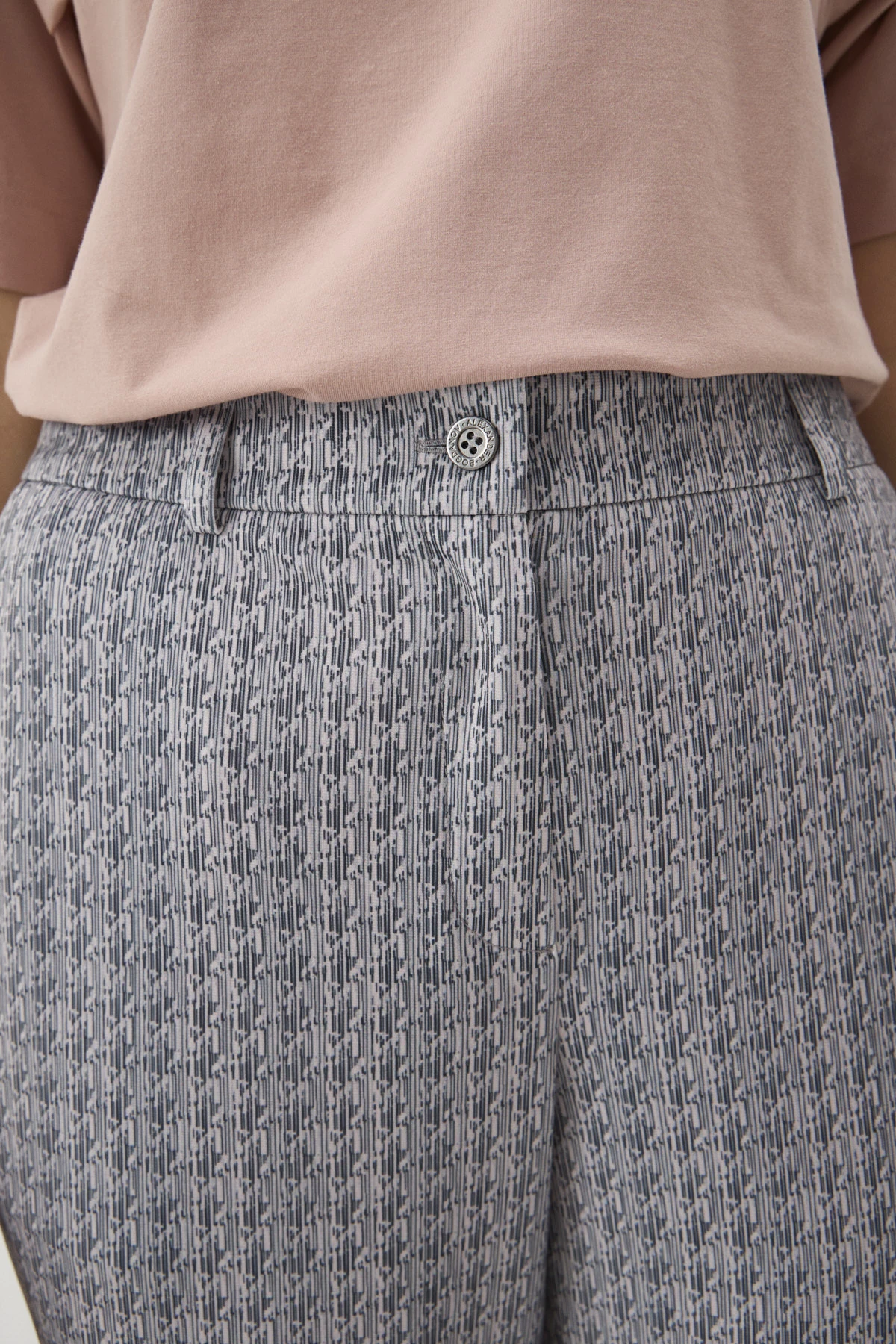 Зауженные брюки на манжетах из практичной, несминаемой ткани с добавлением гигроскопичного района с авторским раппортом. Знаменитый