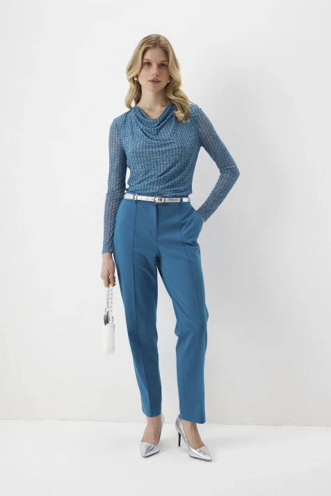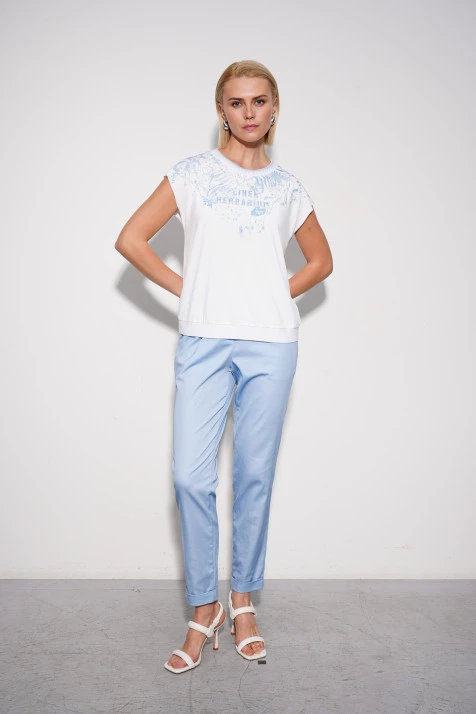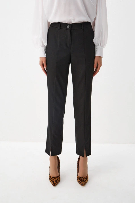Зауженные брюки на манжетах из практичной, несминаемой ткани с добавлением гигроскопичного района с авторским раппортом. Знаменитый