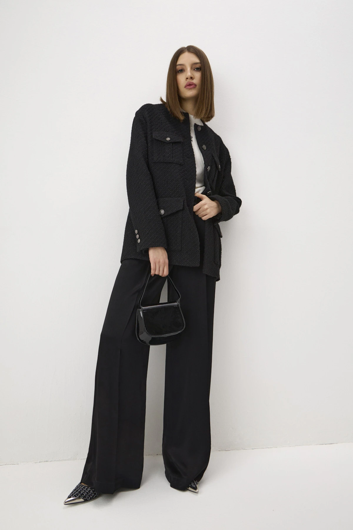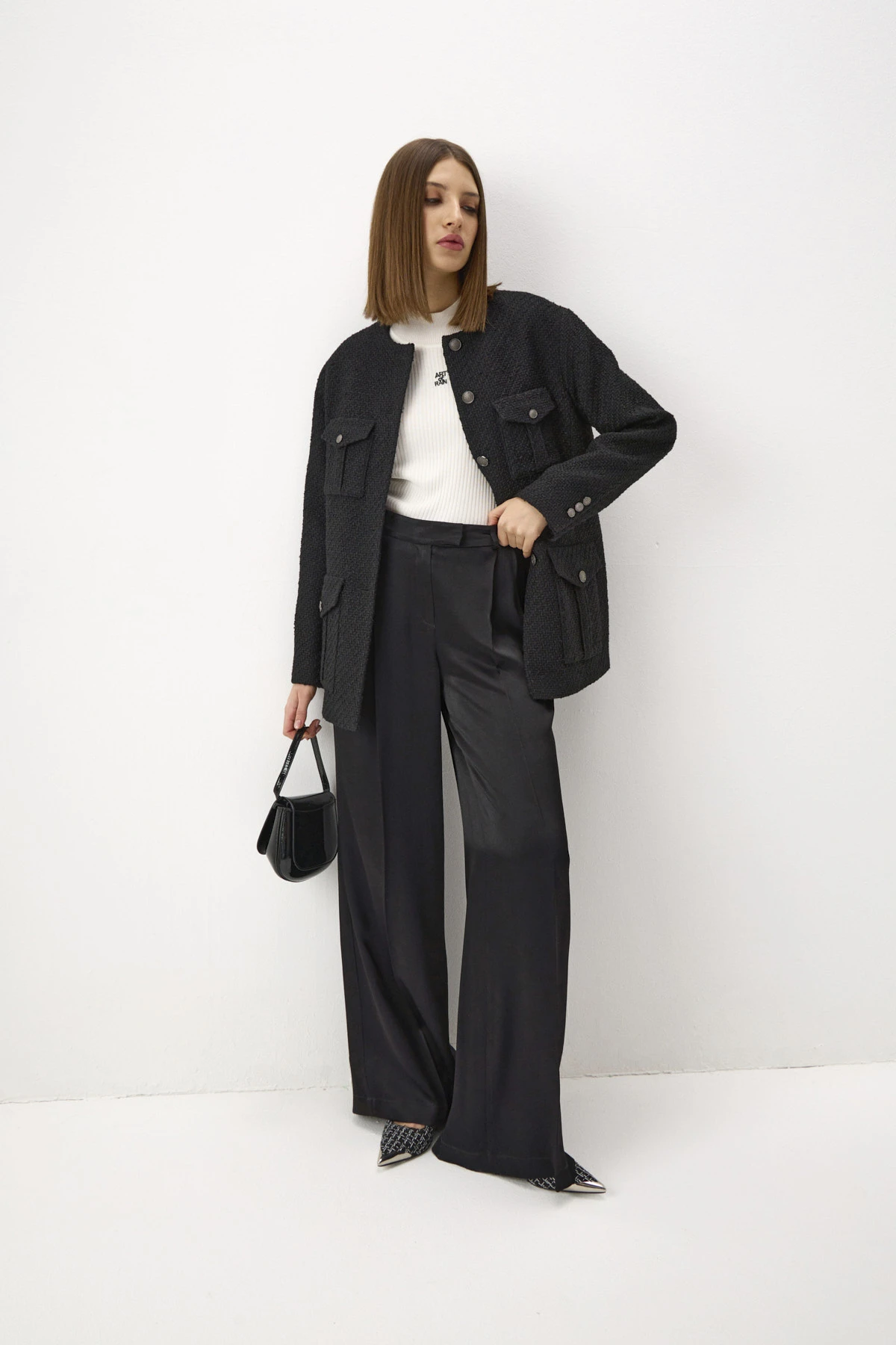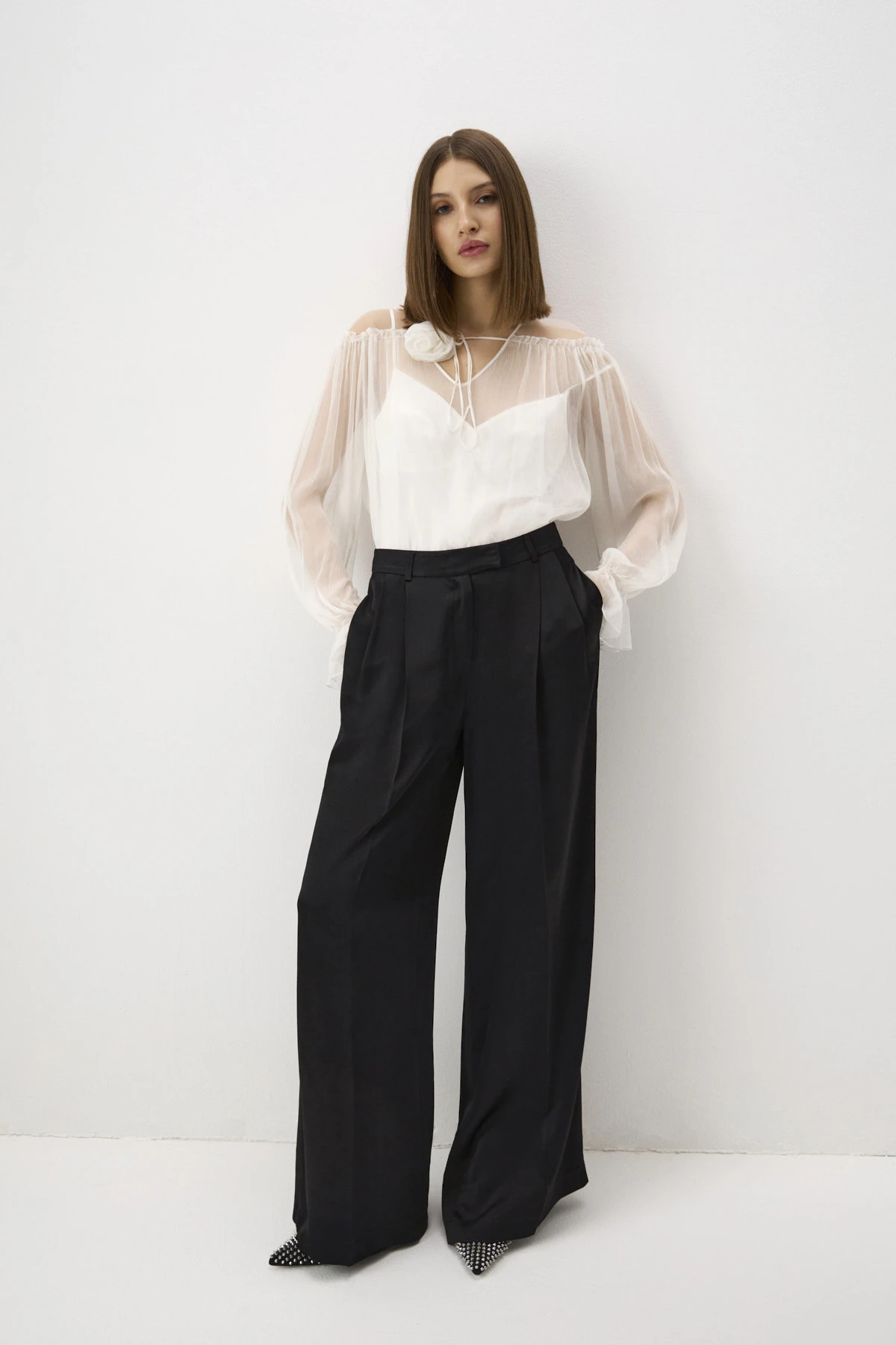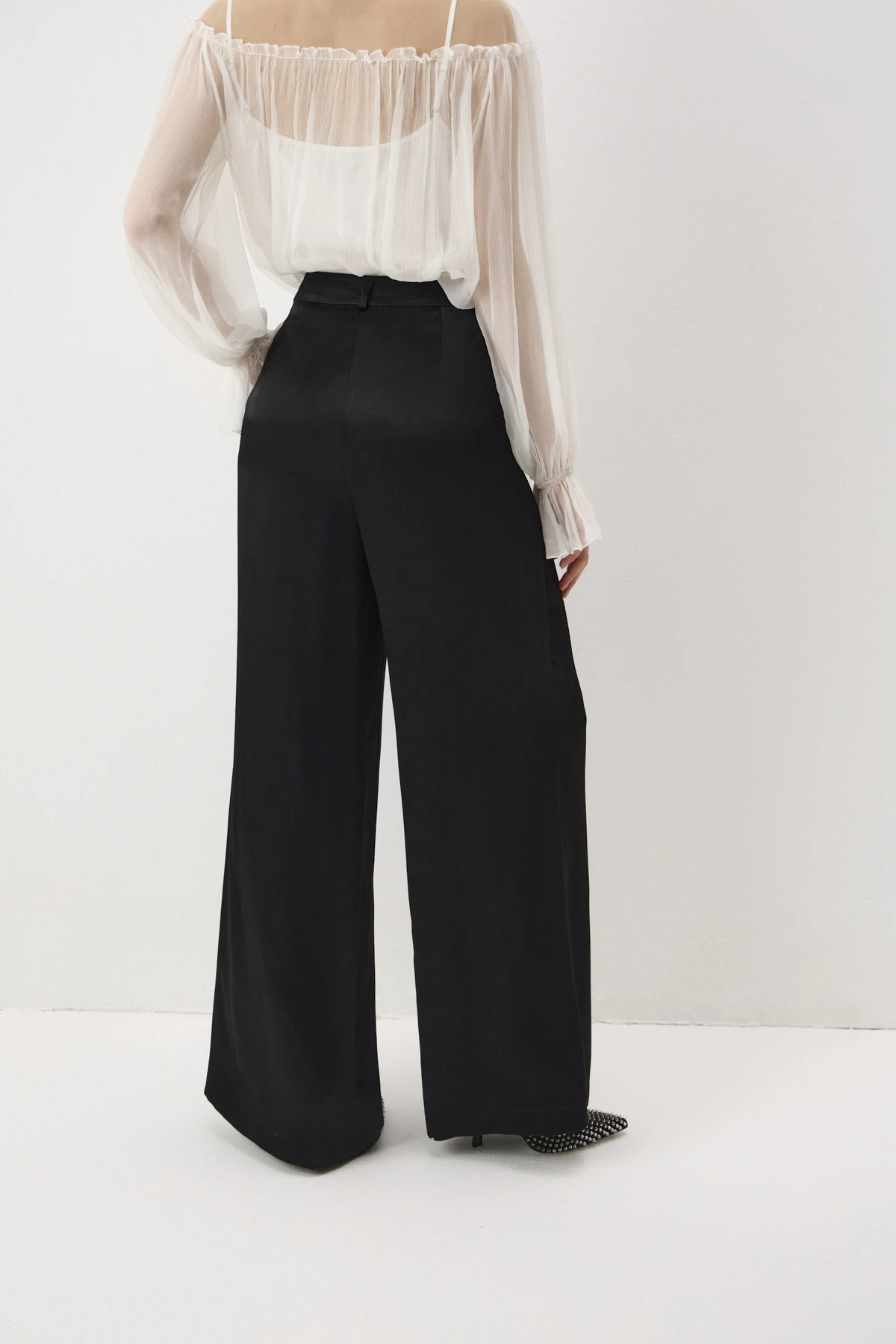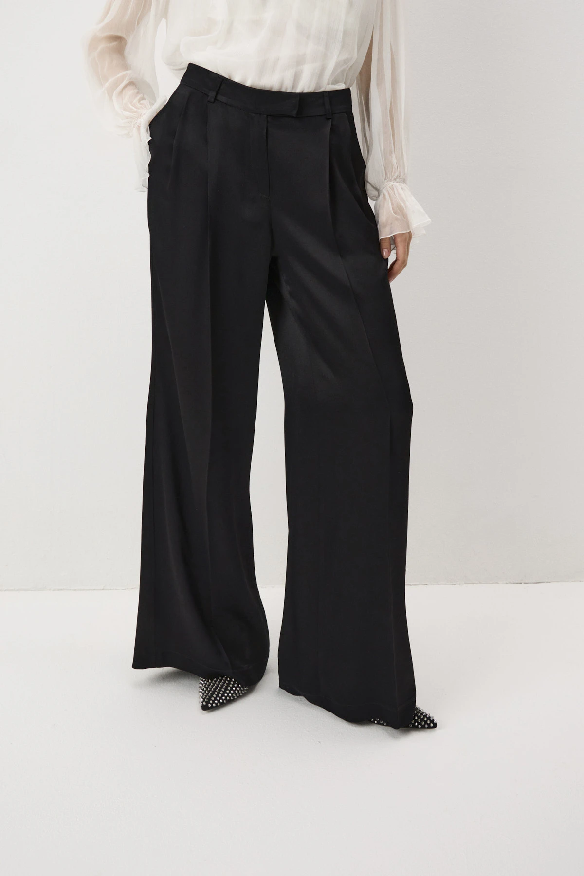 Брюки-палаццо со стрелками из шелковистой вискозы. Благодаря сатиновому блеску ткани брюки удачно впишутся в нарядные образы. «Тяжёлая» пластика ткани особенно раскрывается при движении. Лаконичные брюки декорированы защипами спереди, которые создают изящную драпировку.