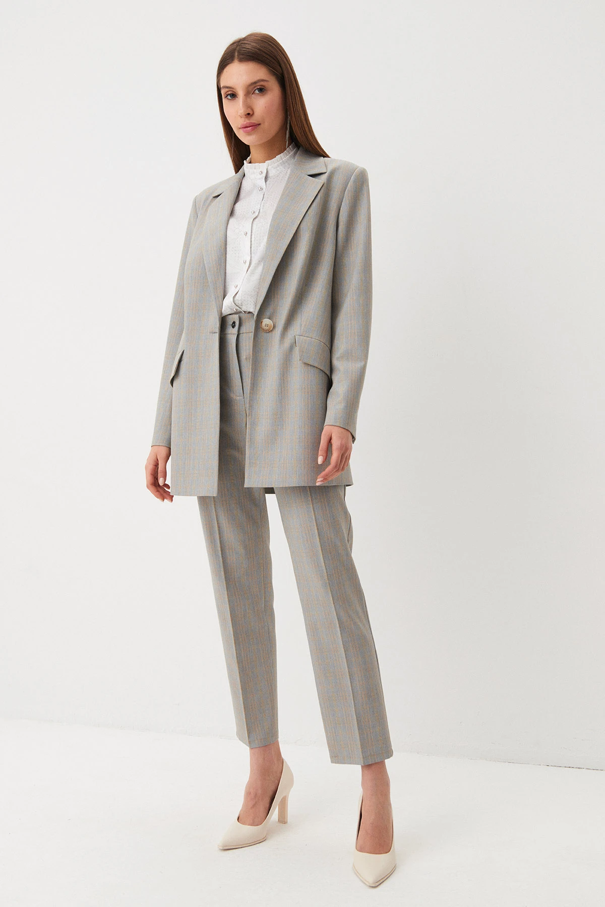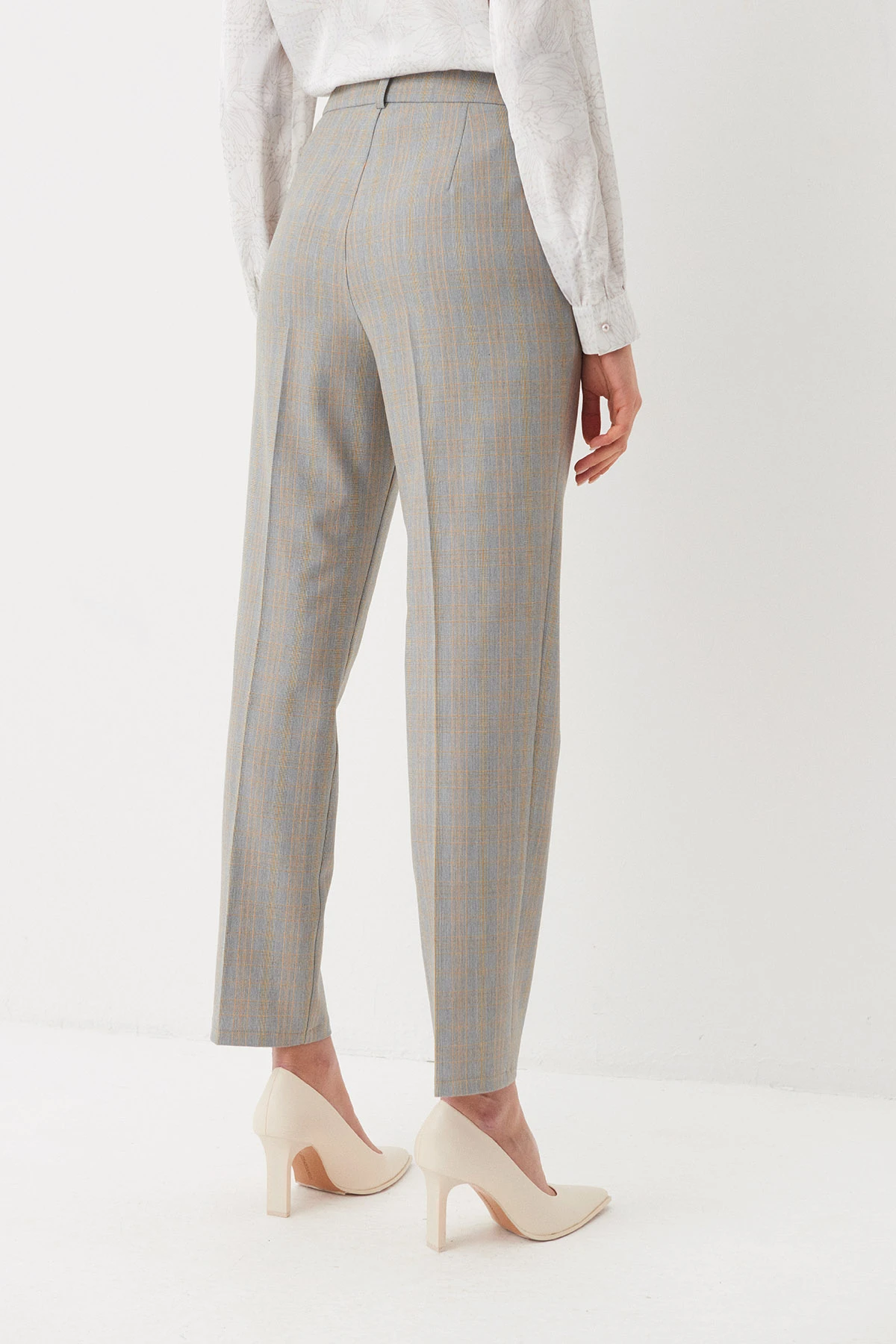 Крой:Зауженные брюки со стрелками по передним и задним половинкам. По задним половинкам – вытачки. Карманы наклонные с подкройными бочками.