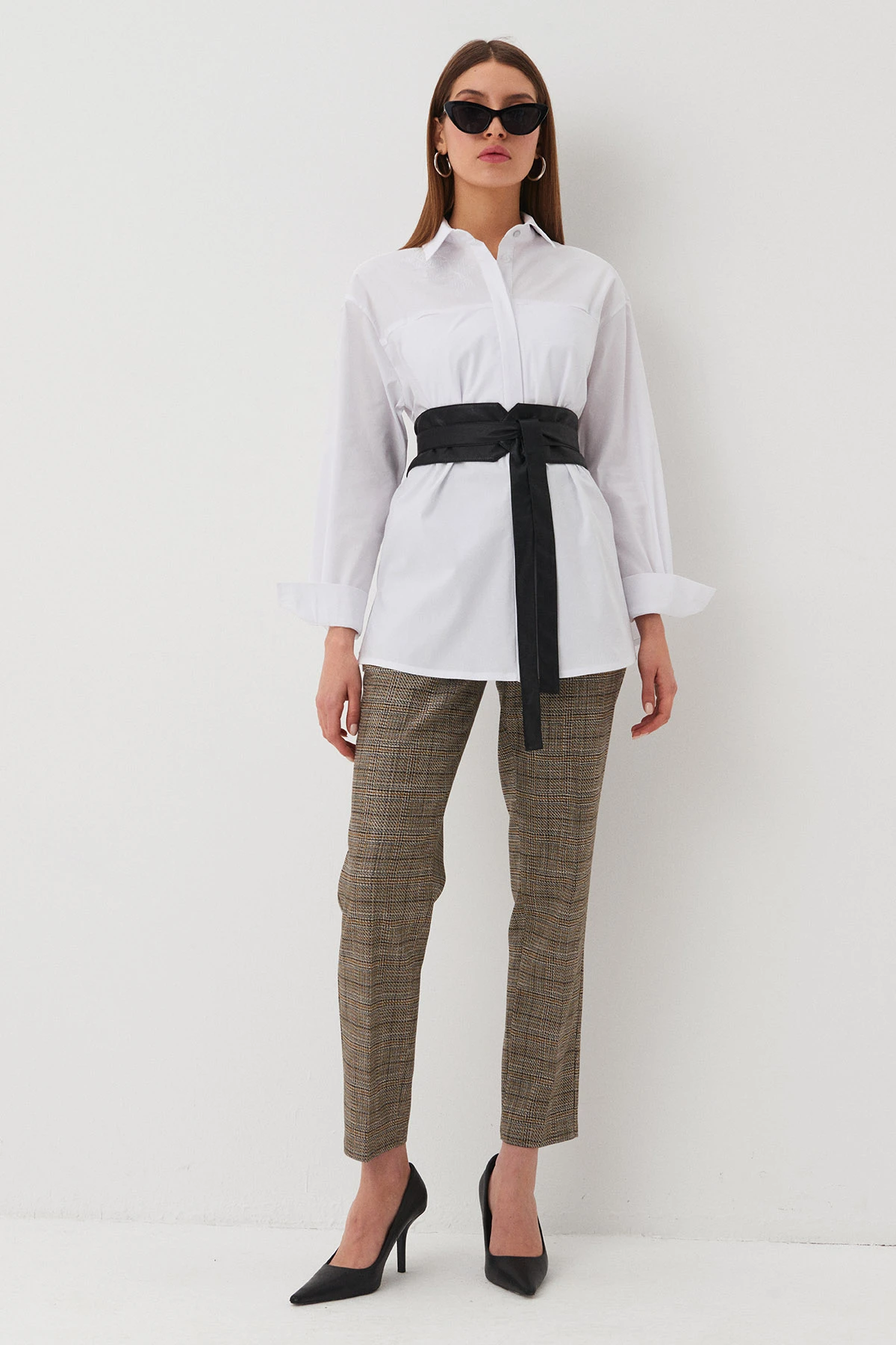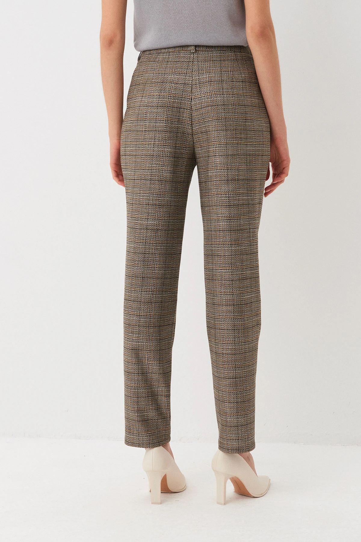 Крой:Зауженные брюки. по передним половинкам - защипы, стрелки и наклонные карманы с подкройными бочками. По задним половинкам – вытачки и прорезной карман.