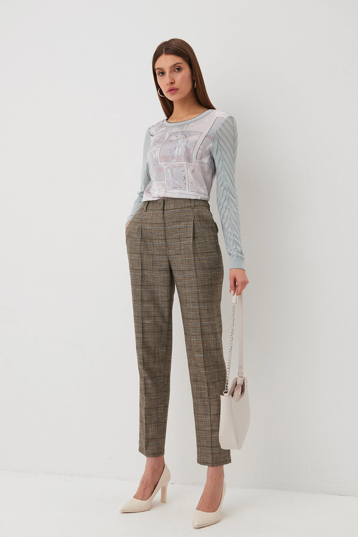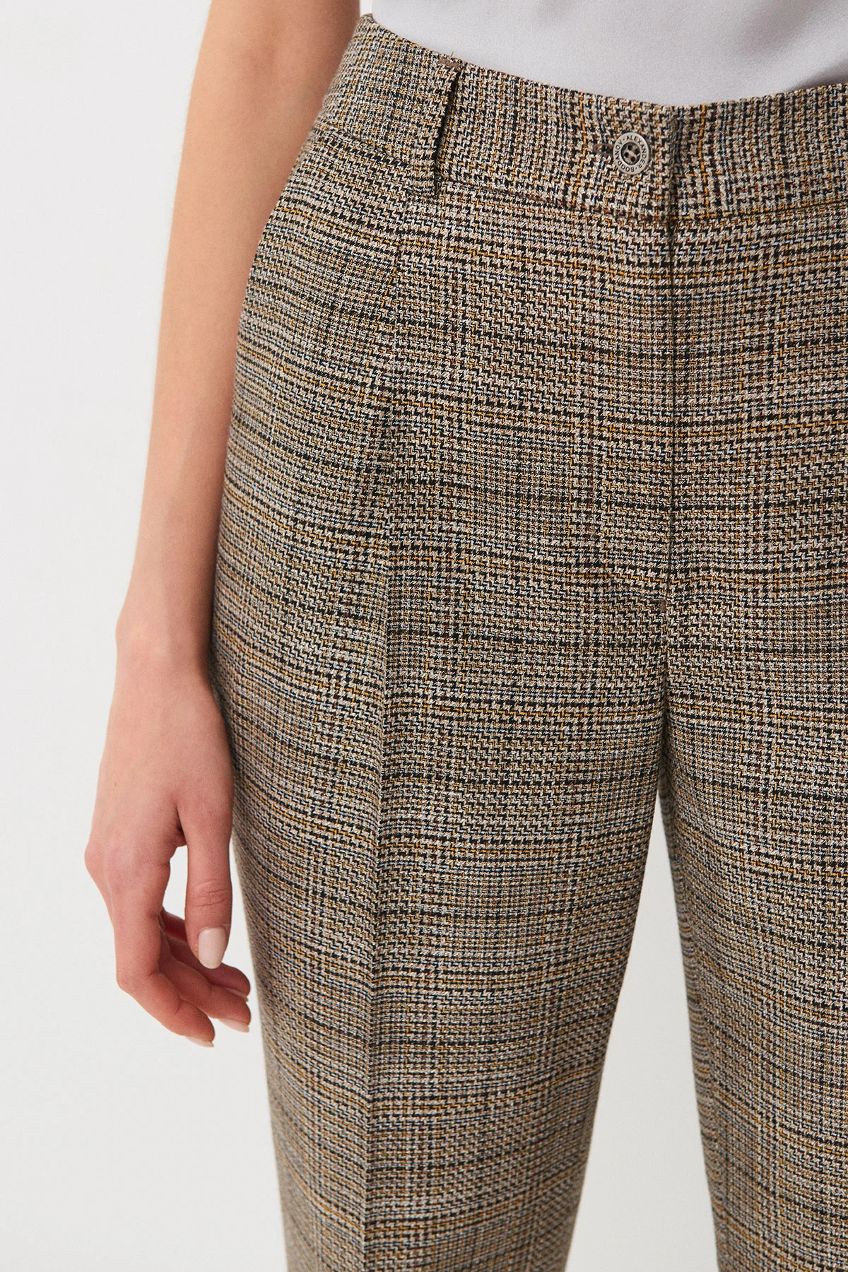 Ткань:Брюки из комфортной, удобной, тактильно приятной ткани смешанного состава на основе вискозы с добавлением эластана. Ткань имеет фактурное жаккардовое переплетение нитей в гармонично подобранных шоколадном, бирюзовом и горчичном оттенках.