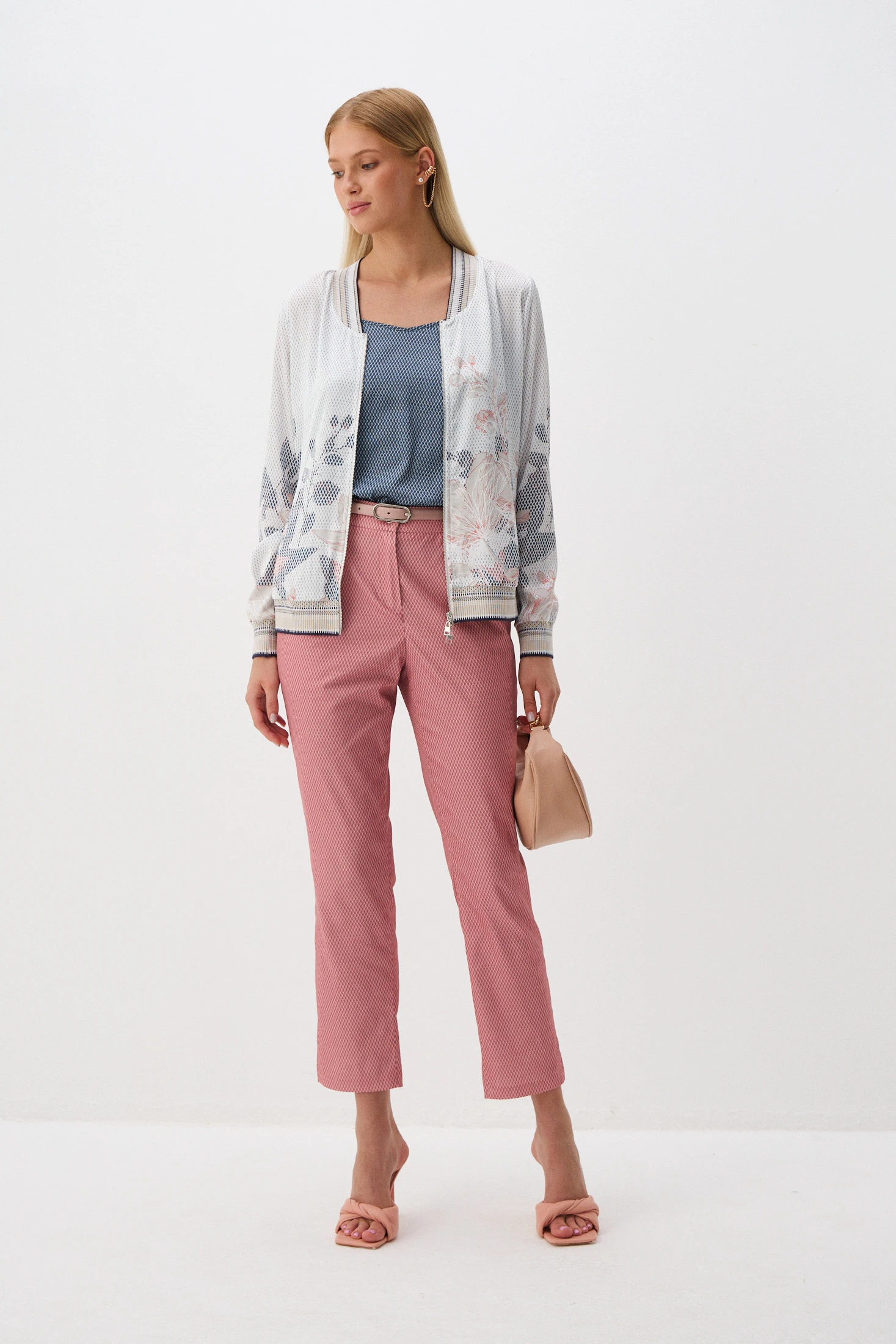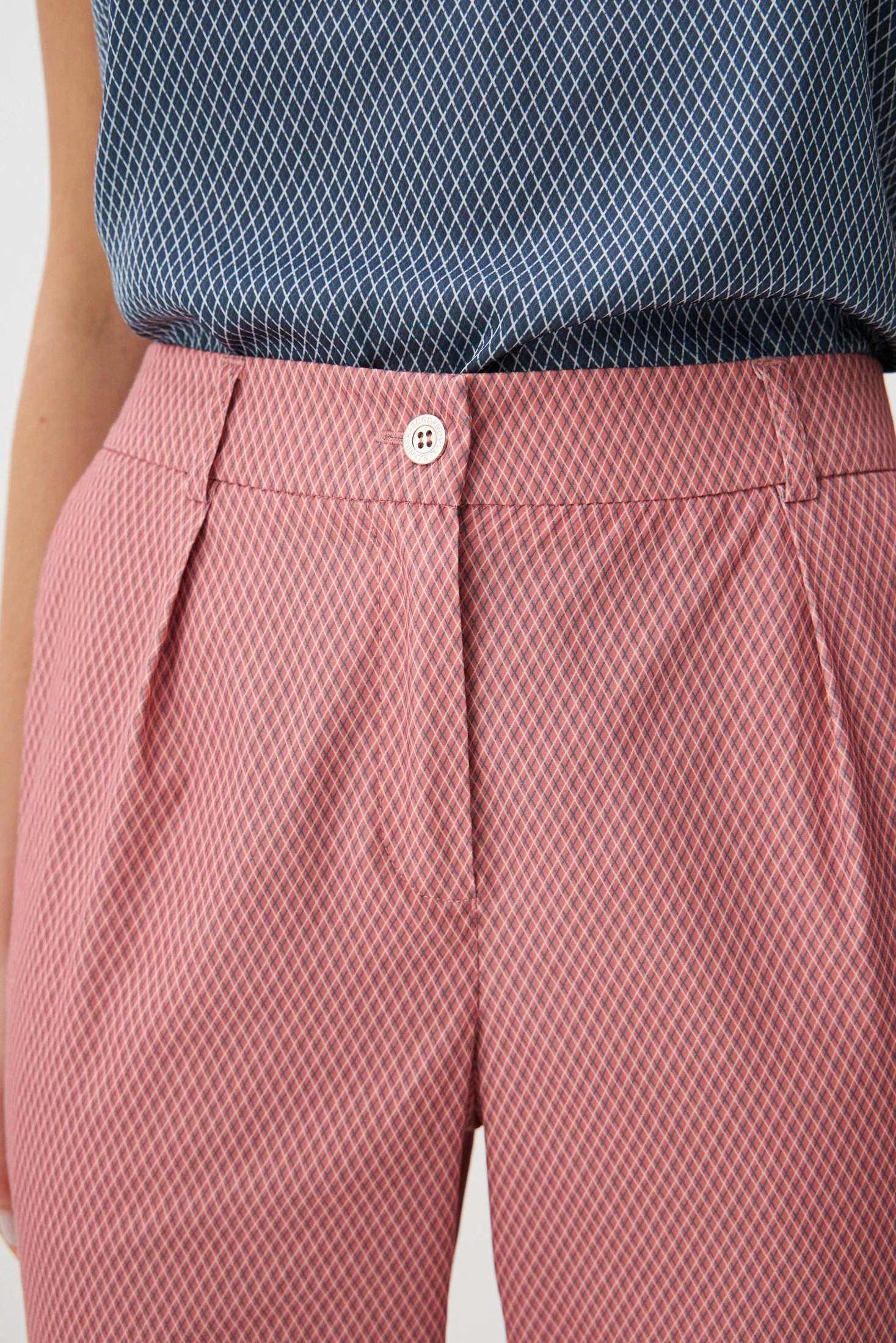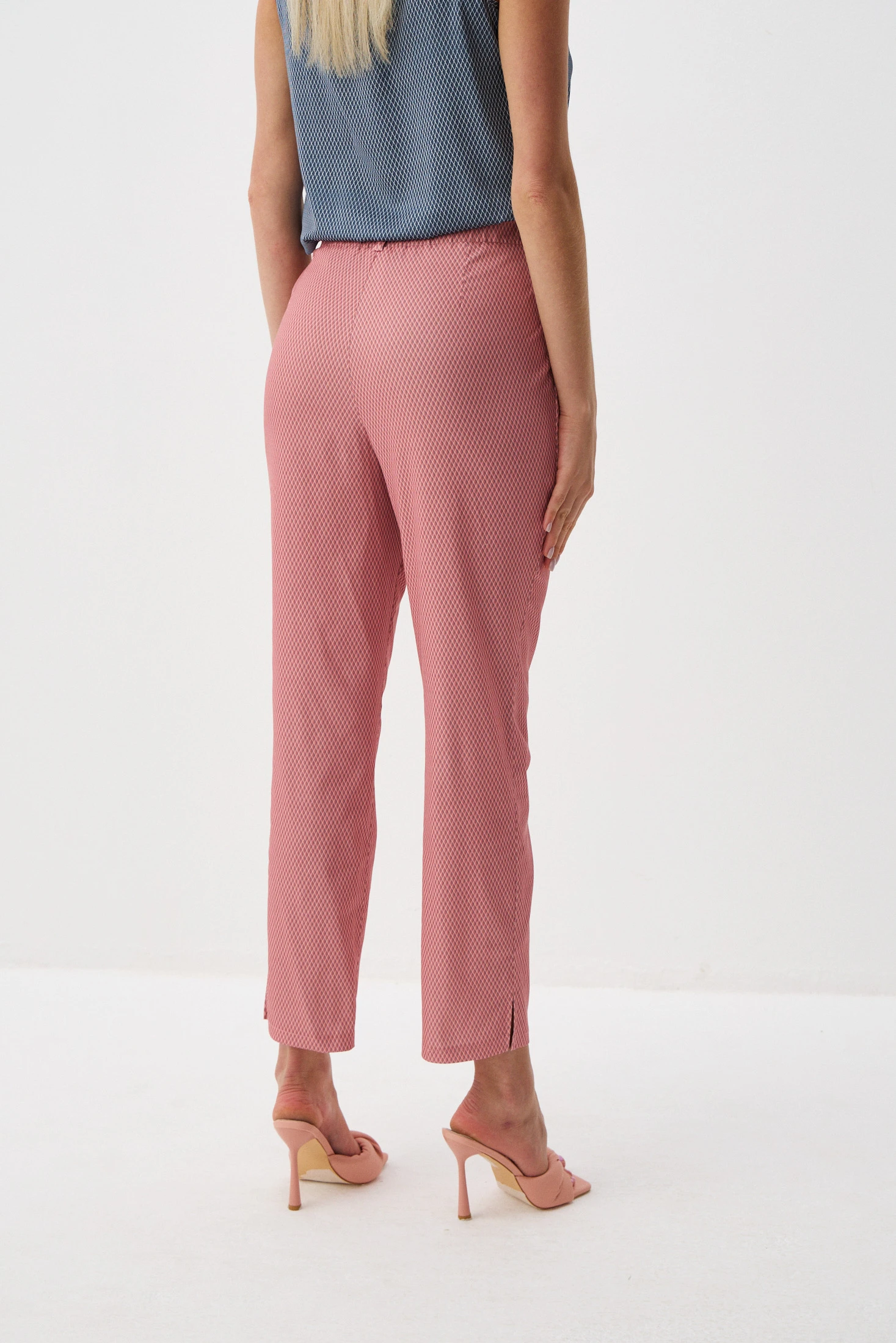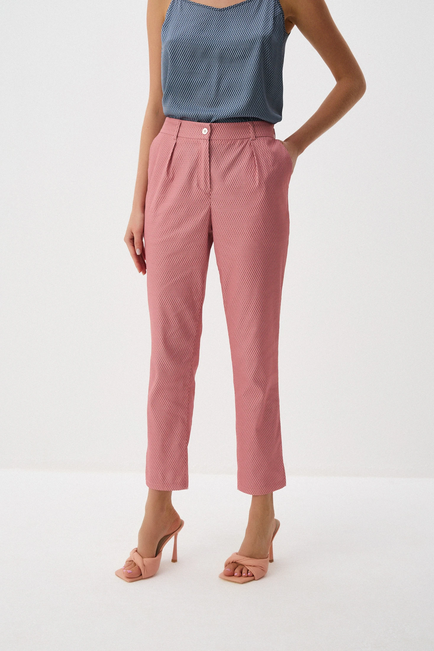 Брюки в коралловом оттенке с мелкораппортным геометричным принтом – яркая акцентная модель для Вашего гардероба. Озорные вырезы создают кокетливый акцент на стройных щиколотках, а притачной пояс обеспечивает идеальную посадку. Комфортная ткань на основе хлопка позволит носить брюки даже в жаркие летние дни. Брюки «Мерцание города» - прекрасный выбор для всех, кто не боится быть яркими!