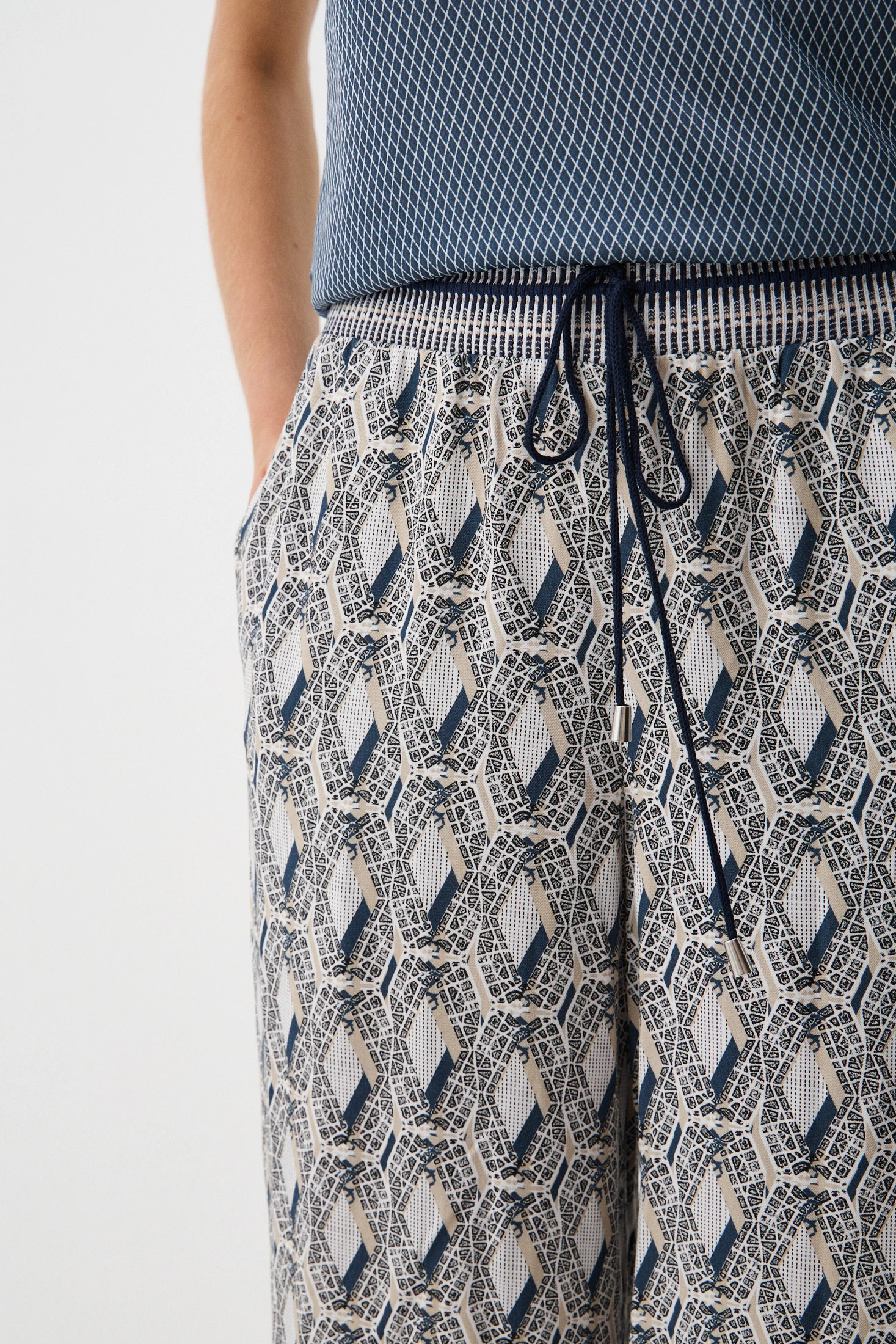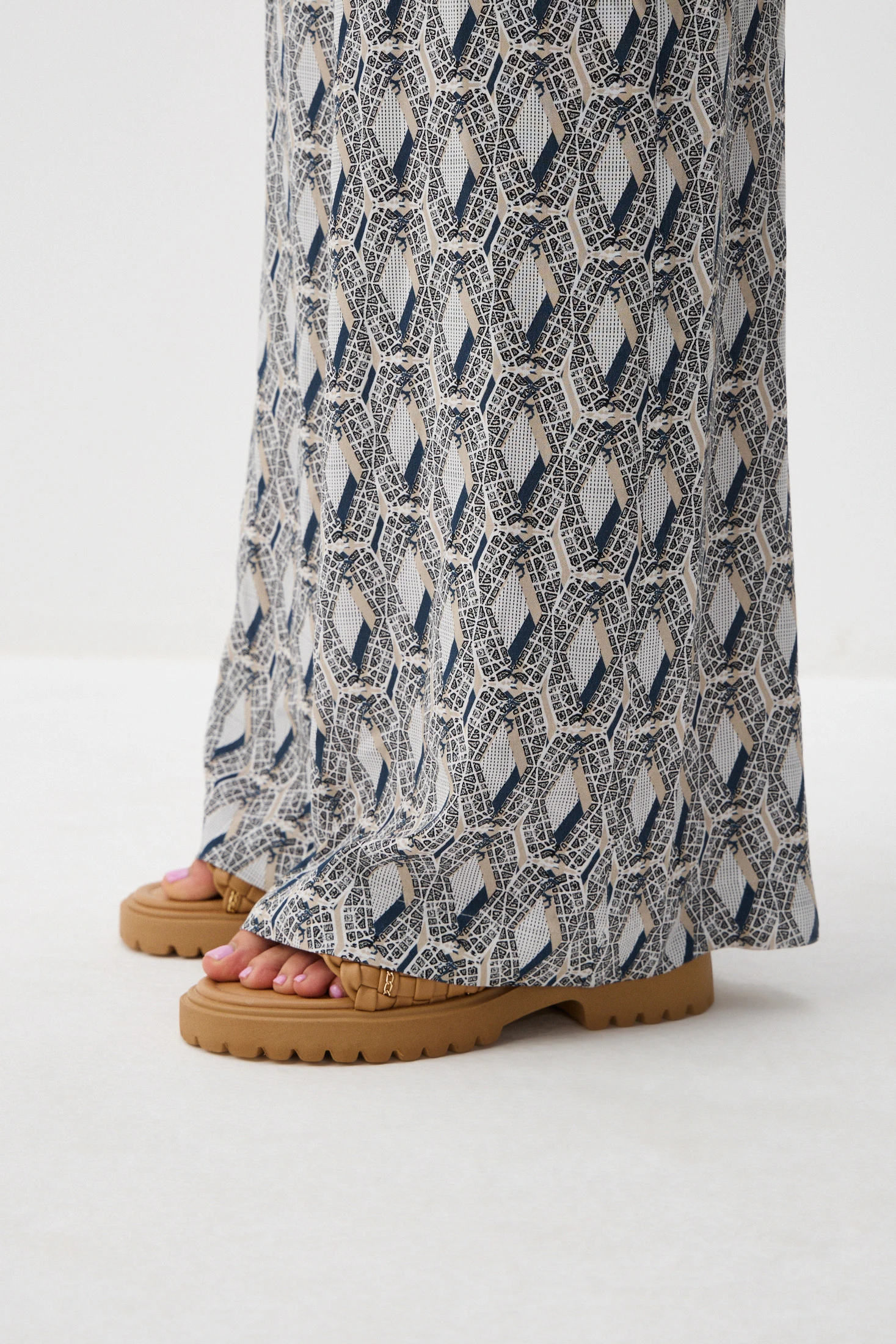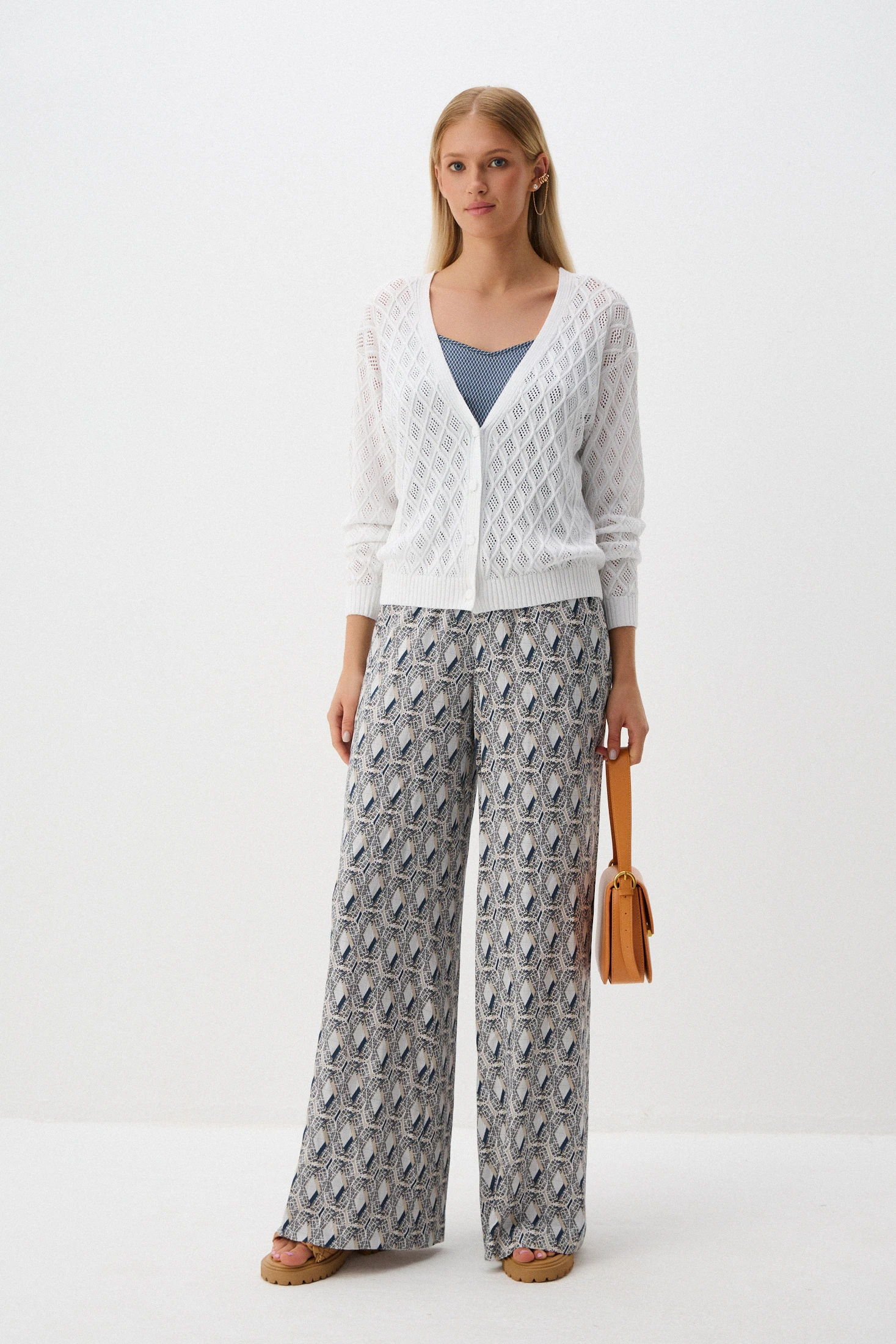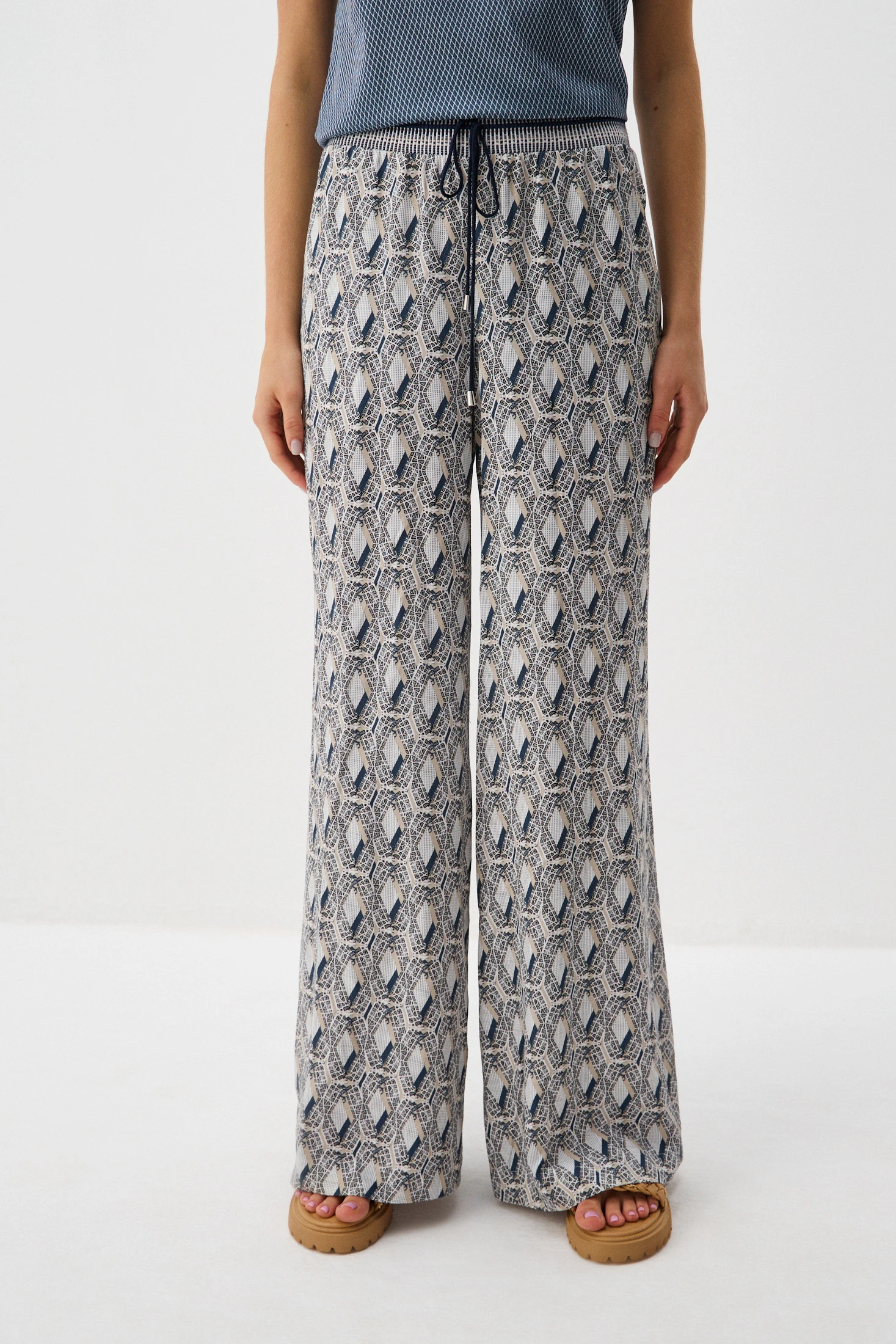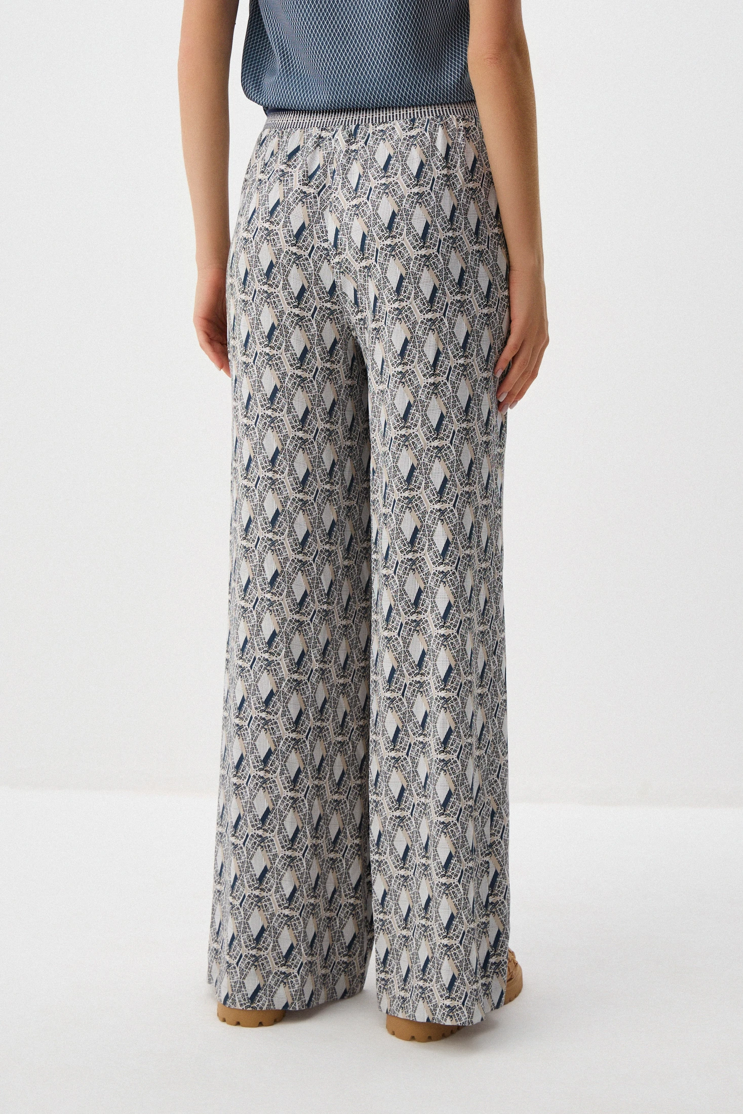 Брюки из тактильно приятной гигроскопичной вискозы – прекрасный вариант на лето. Фасон брюк-палаццо добавляет изысканности и визуально подчёркивает красоту стройных ног. Абстрактный геометричный принт привносит изюминку модели. В комфортном трикотажном поясе из авторской бейки гармонично сочетаются нити в оттенках принта. Удобный крой и гигроскопичная ткань - стильное решение в знойный день для любительниц комфортных аутфитов.