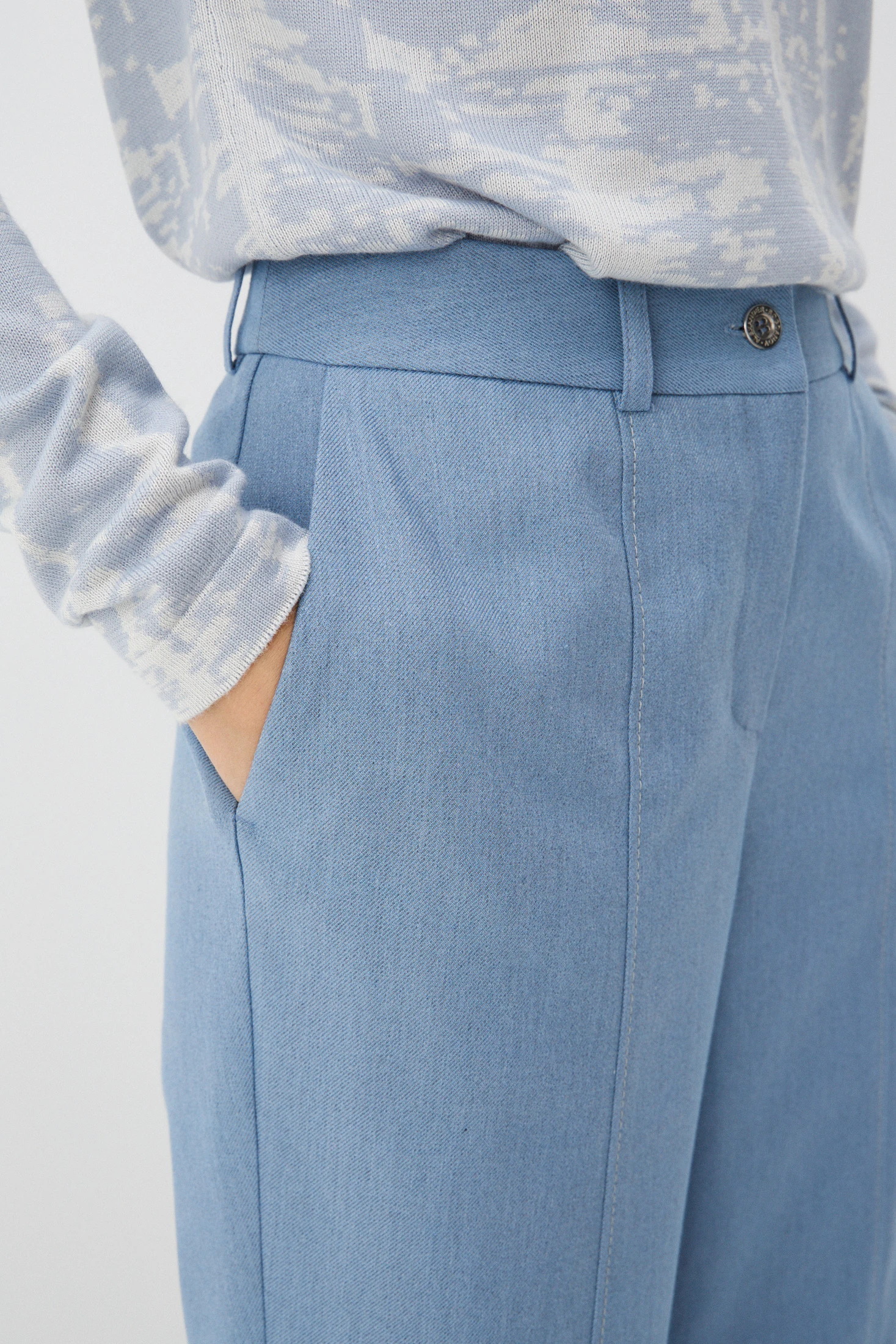 Зауженный крой брюк делает акцент на изящной щиколотке и выгодно подчёркивает красоту ног. Притачной пояс и вытачки обеспечивают идеальную посадку, а карманы – комфорт в носке. Ткань на основе хлопка с добавлением вискозы гигроскопична и по своей фактуре напоминает деним. Создавайте сочетания с классическими рубашками, романтичными блузками и туфлями на каблуках – брюки подойдут как для образа в офис, так и для выхода в свет. С футболками, кардиганами и лоферами брюки станут основой для аутфита в стиле casual. А с озорными кедами и косухой – придадут дерзкую нотку в Ваш образ.