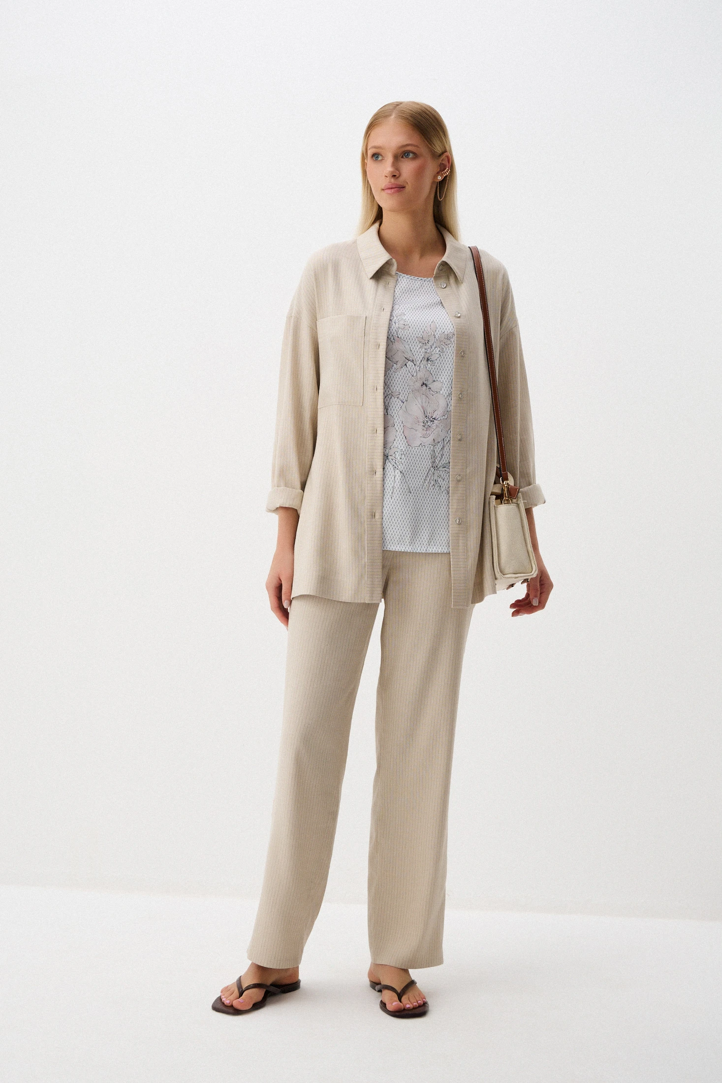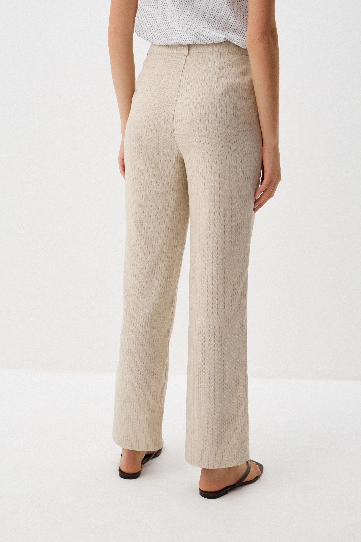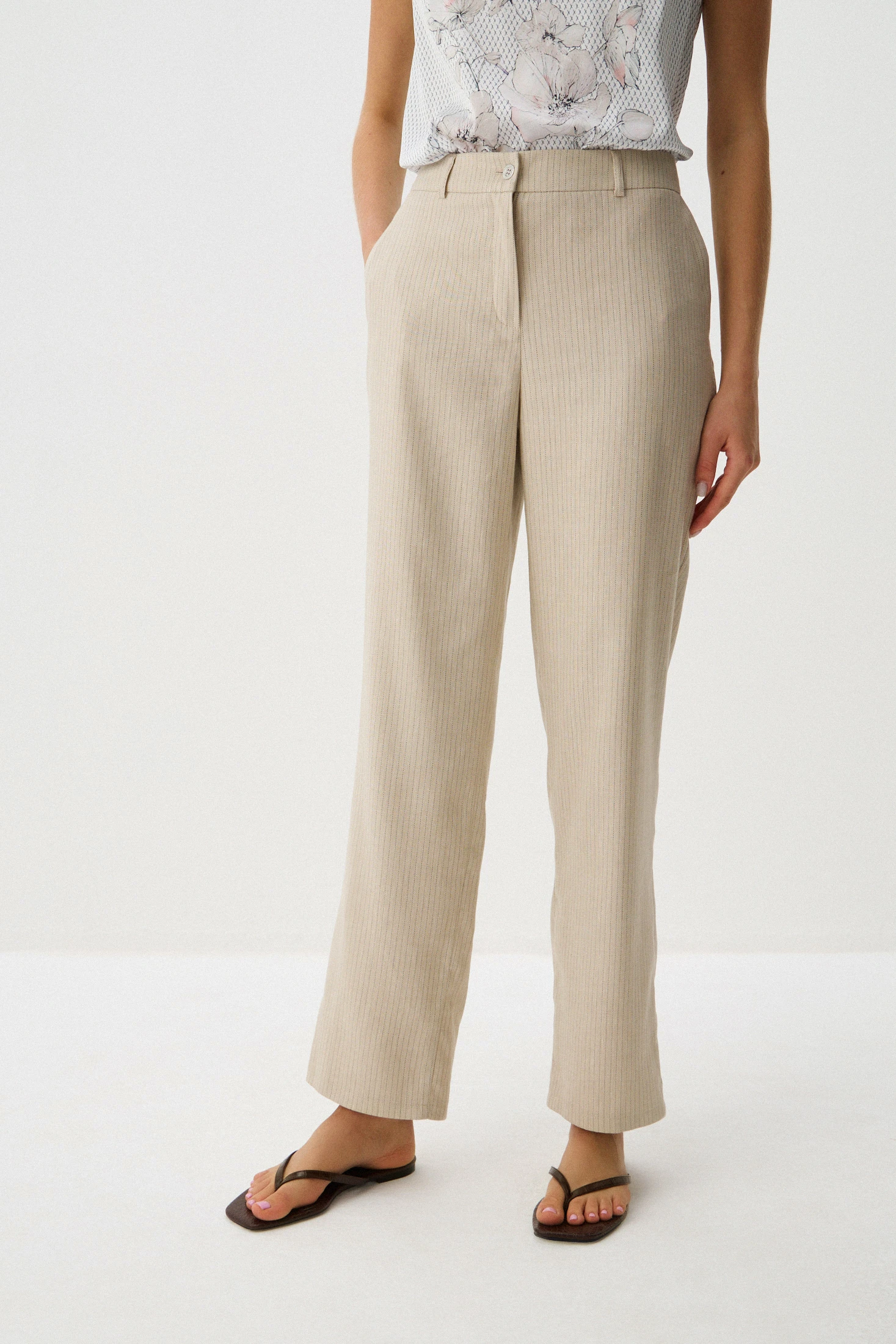 Брюки созданы из приятной к телу ткани смешанного состава, в которой соединены натуральное льняное волокно, создающее прохладу и дарящее приятные тактильные ощущения, и высококачественные синтетические волокна, обеспечивающие несминаемость и простоту в уходе. Нейтральный оттенок «тёплый песок» придает брюкам элегантность и универсальность, легко сочетаясь с различной одеждой и обувью. Едва заметная пунктирная полоска добавляет изысканный акцент. Брюки станут идеальным выбором для тёплых сезонов.
