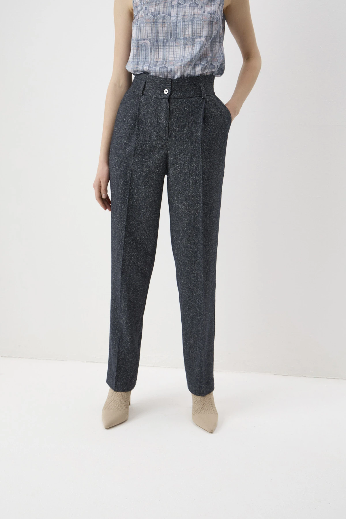 Зауженные брюки со стрелками из костюмной ткани смешанного состава с добавлением натуральных волокон шерсти и шёлка в тёмно-сером оттенке с меланжевой фактурой. Для комфорта в носке модель дополнена подкладом до середины брюк и по внутренней стороне пояса. Высокая посадка и широкий пояс создают акцент на талии. По передним половинкам – притачной пояс, защипы и карманы. По задним половинкам – пояс на эластичной ленте и вытачки. Застёжка на молнию и пуговицы.