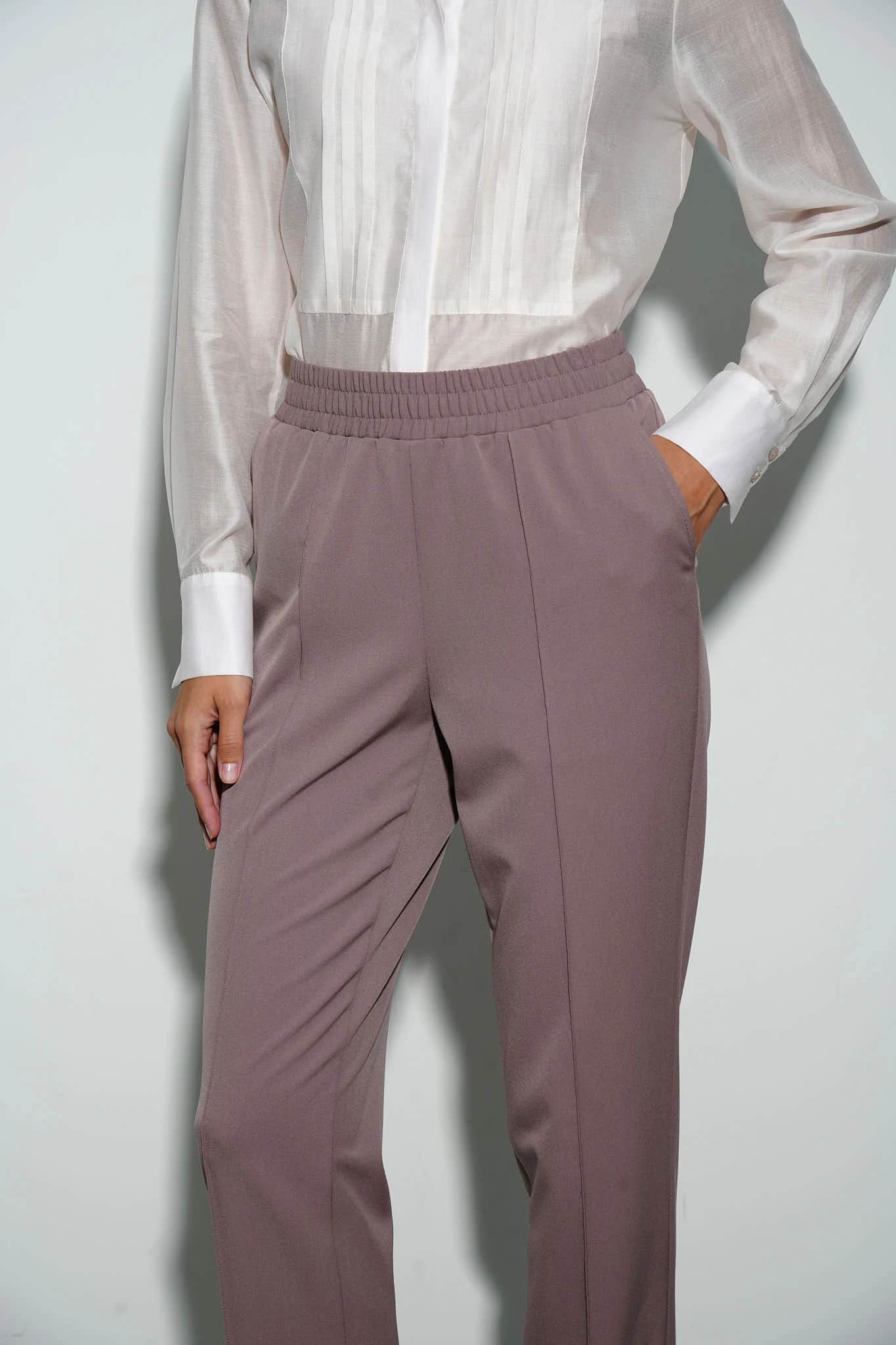 Зауженные брюки из костюмной ткани с добавлением вискозы в изысканном оттенке «пралине» — универсальная модель для создания элегантного образа. Эластичный пояс обеспечивает комфортную посадку, а отстрочные стрелки придают силуэту стройность. Практичные карманы добавляют функциональности и удобства. Отличный выбор для деловых встреч и повседневного стиля.