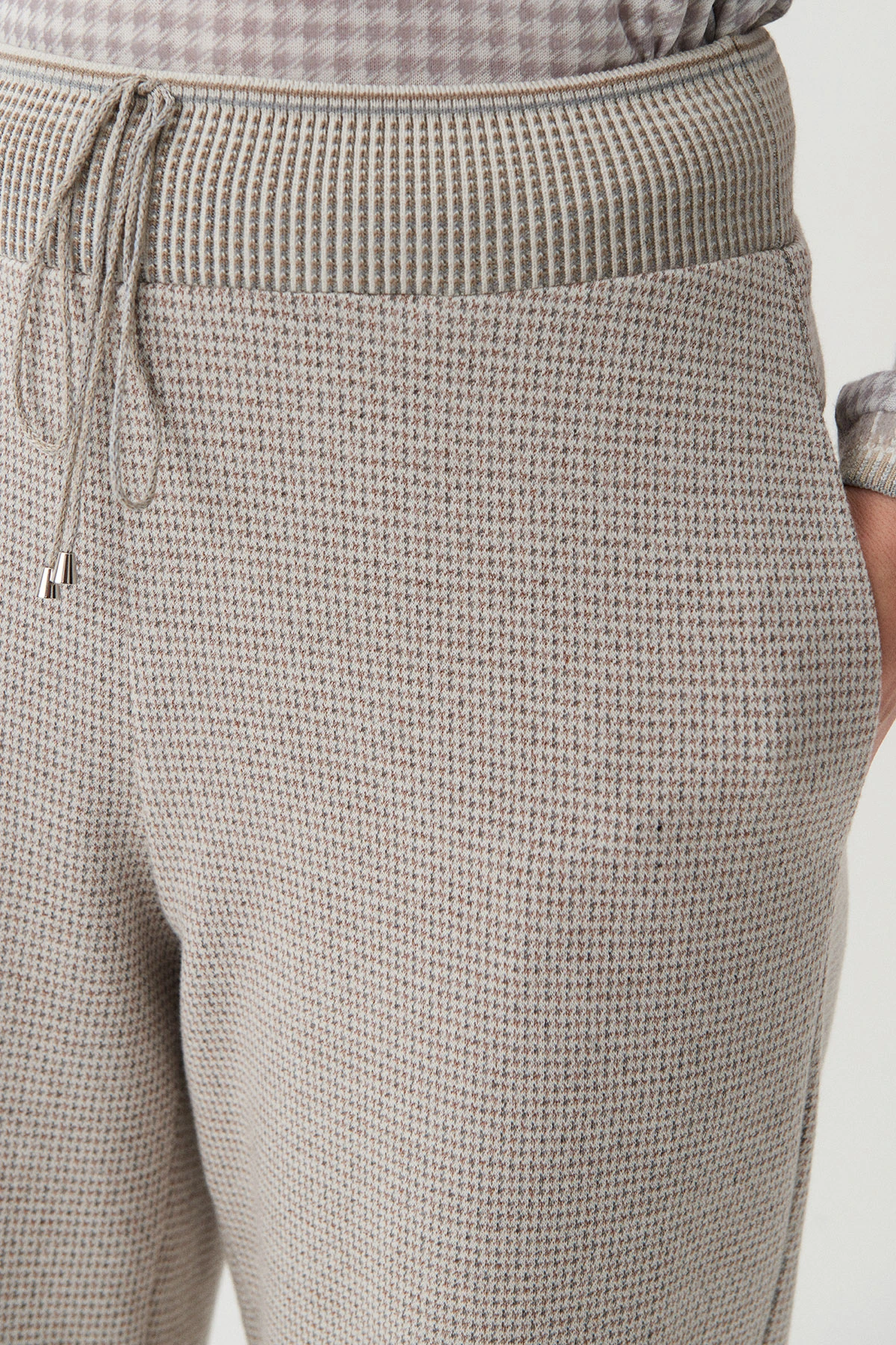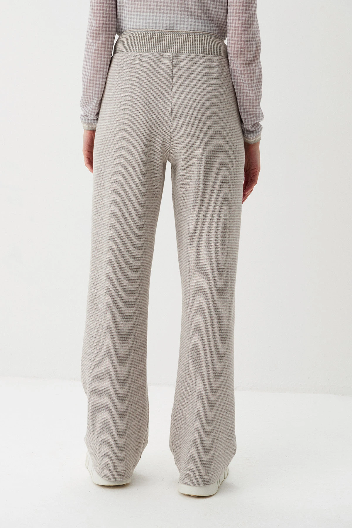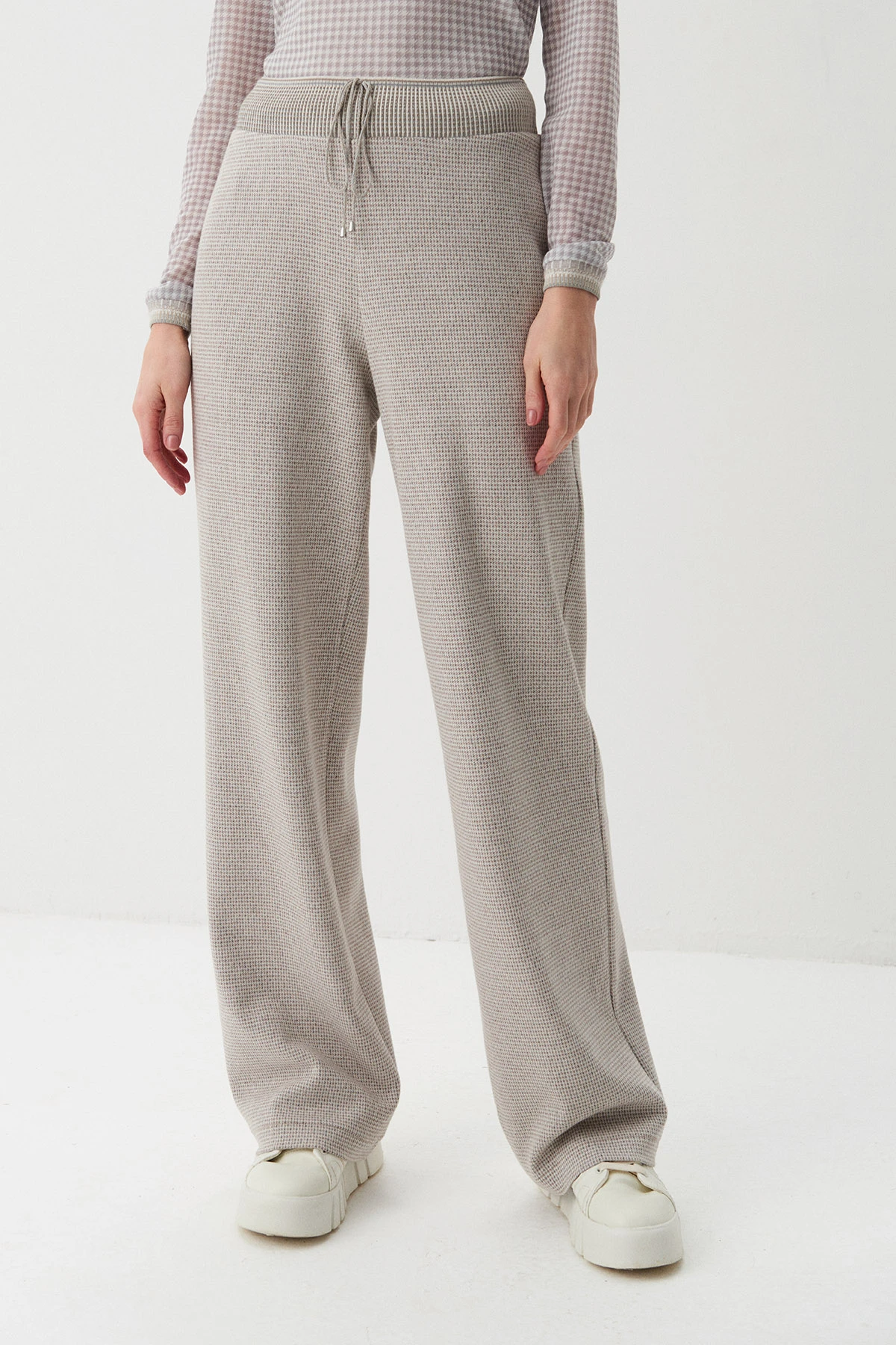 Ткань:Брюки из трикотажного полотна с добавлением хлопка и вискозы. Ритмичный характер модели создаётся благодаря мелкомасштабному рисунку «гусиная лапка» в серо-песочных тонах.