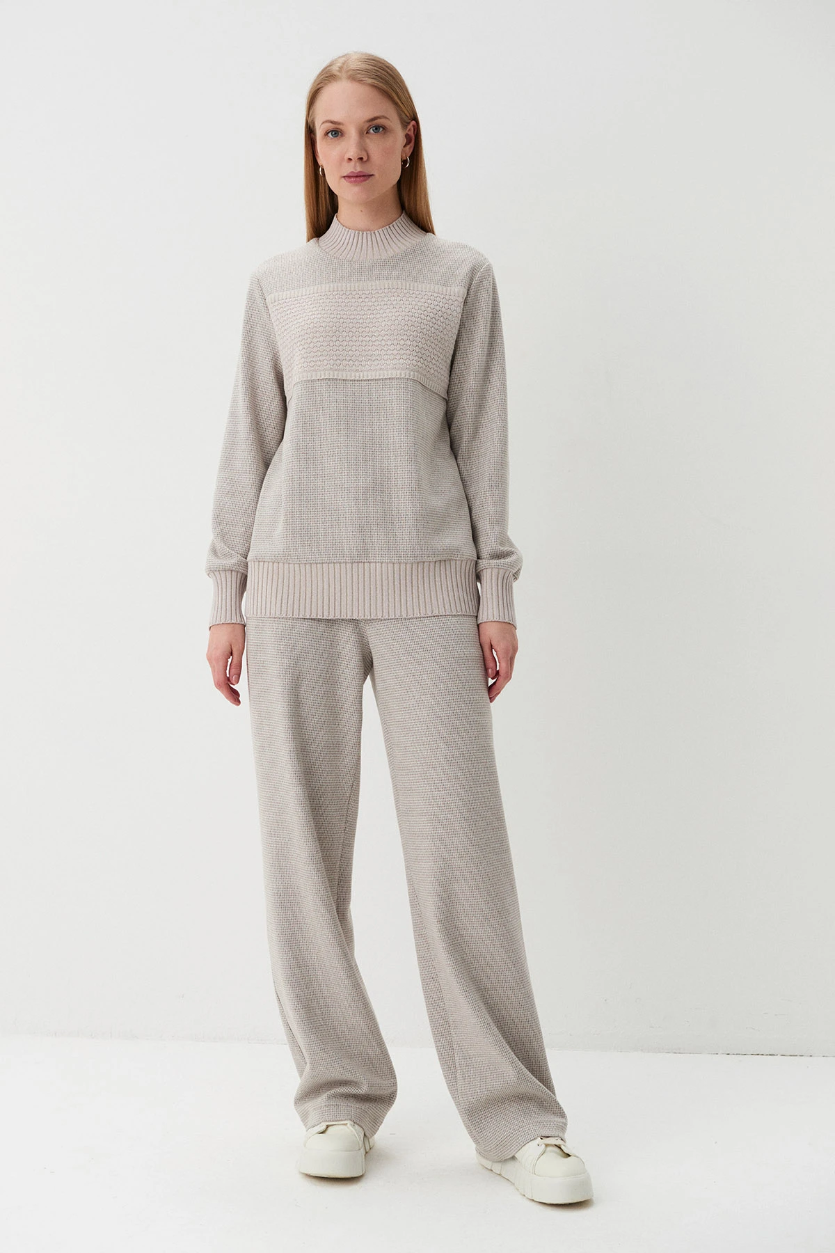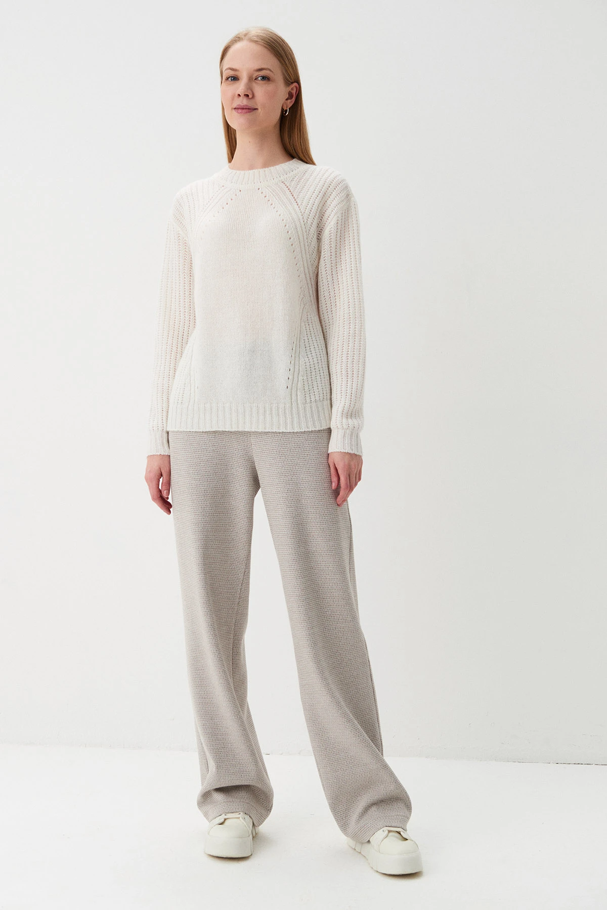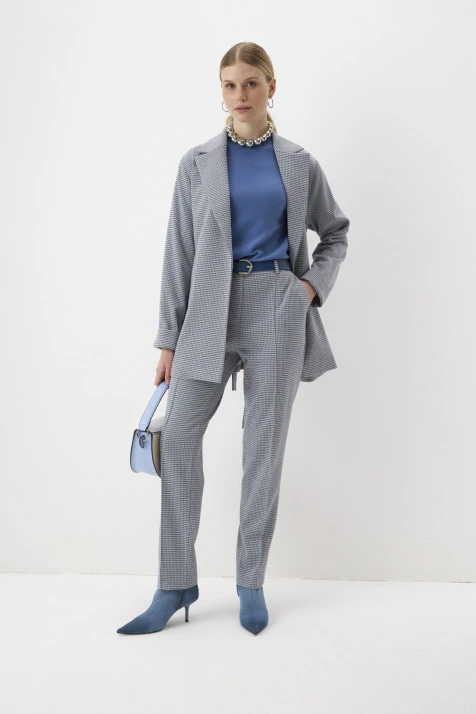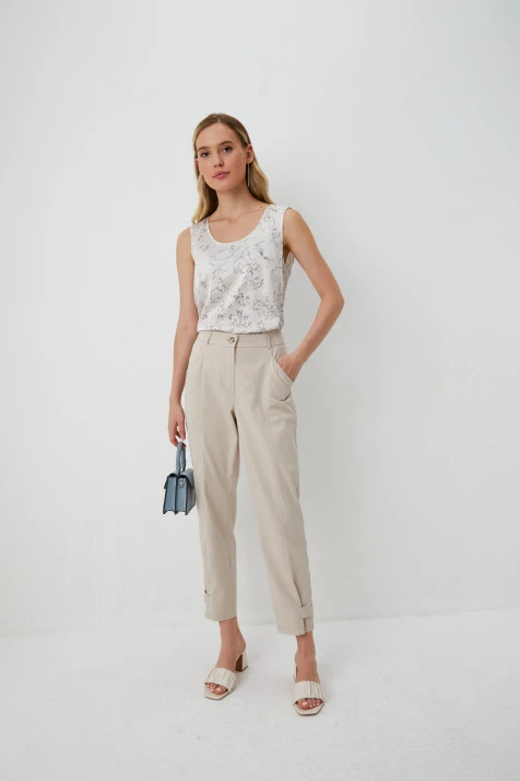 Ткань:Брюки из трикотажного полотна с добавлением хлопка и вискозы. Ритмичный характер модели создаётся благодаря мелкомасштабному рисунку «гусиная лапка» в серо-песочных тонах.
