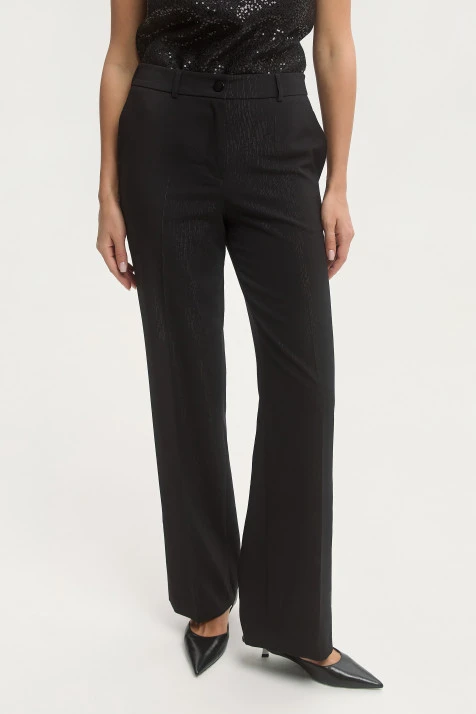 Крой:Широкие прямые брюки на трикотажном поясе. Карманы прорезные в боковых швах.