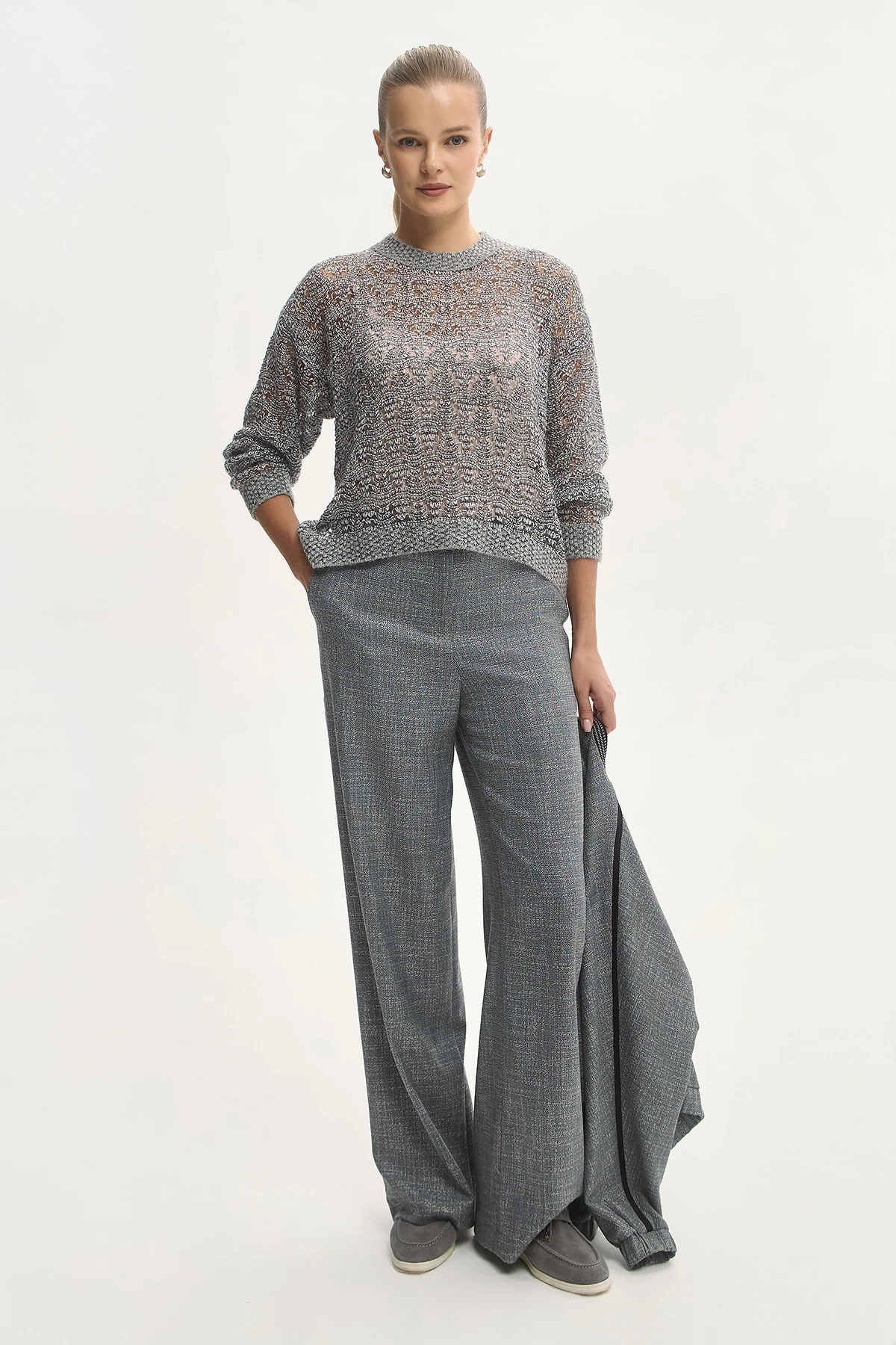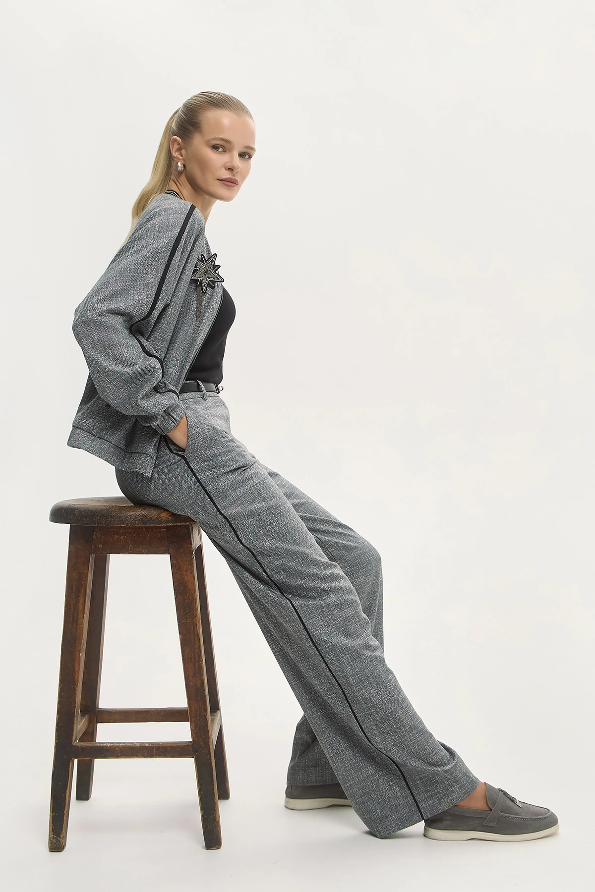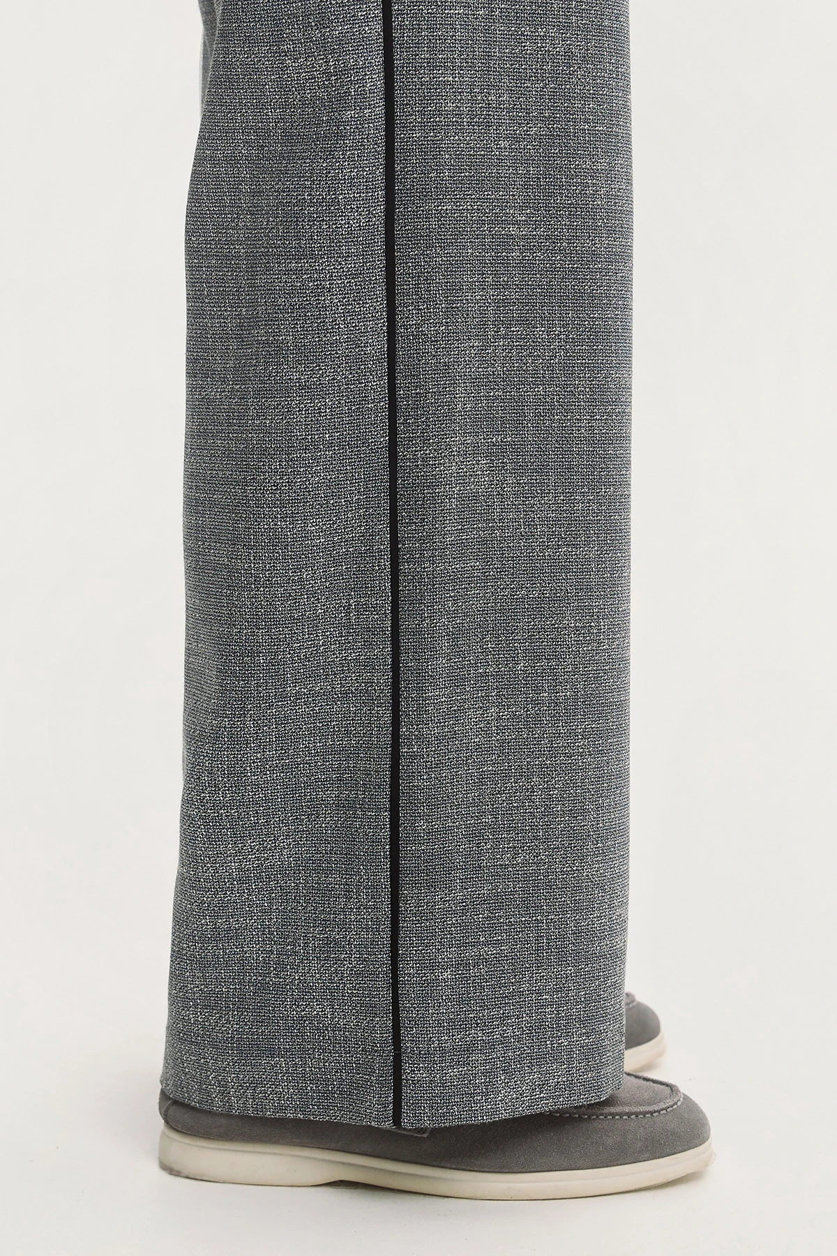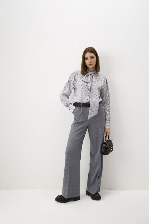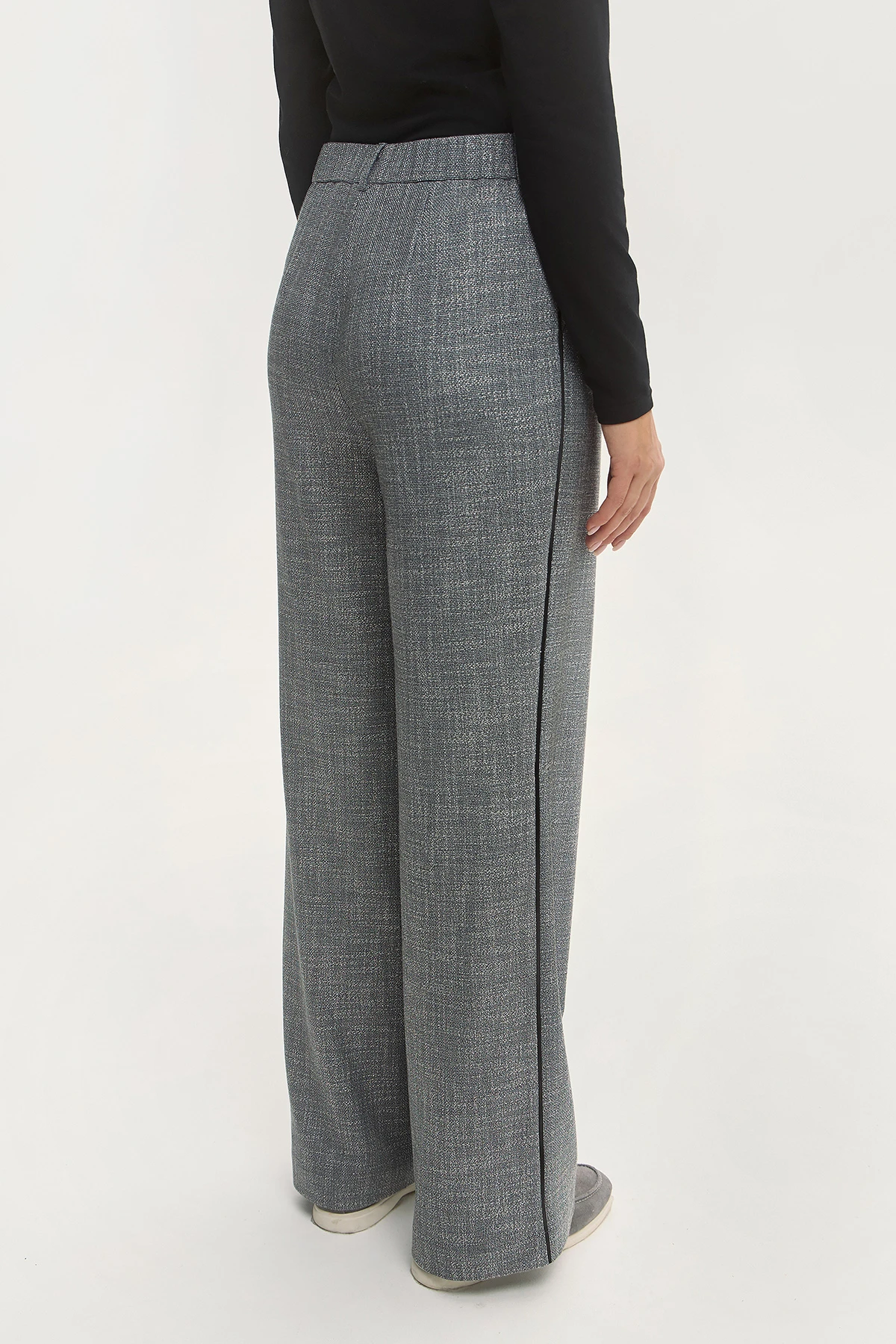 Брюки прямого кроя создают элегантный силуэт и удобны в повседневной носке. Фактурная костюмная ткань в сером оттенке с добавлением вискозы делает модель универсальной. Средняя посадка подчёркивает талию. Модель легко вписывается в образы в стиле soft office, кэжуал и smart casual. Модель дополнена комфортными карманами и шлёвками для ношения ремня.
