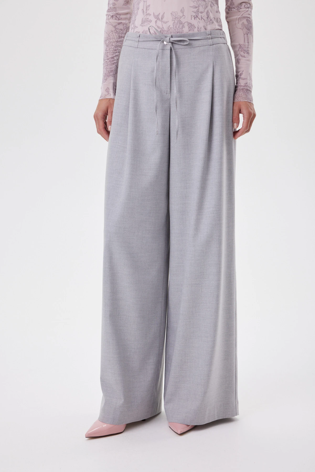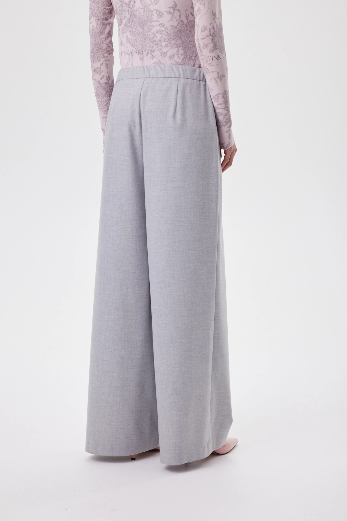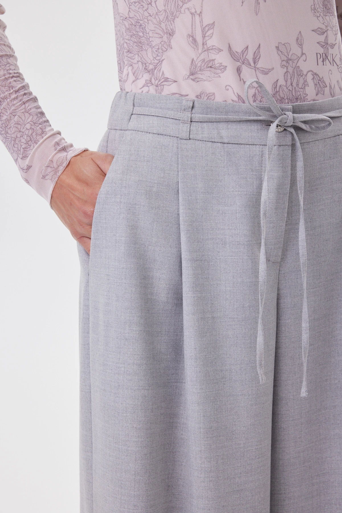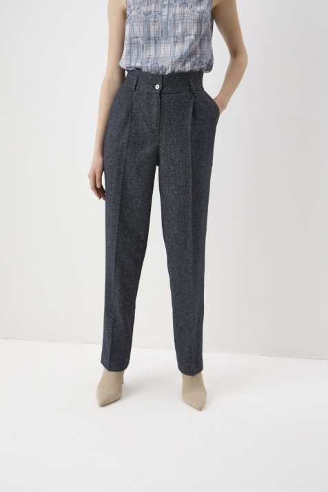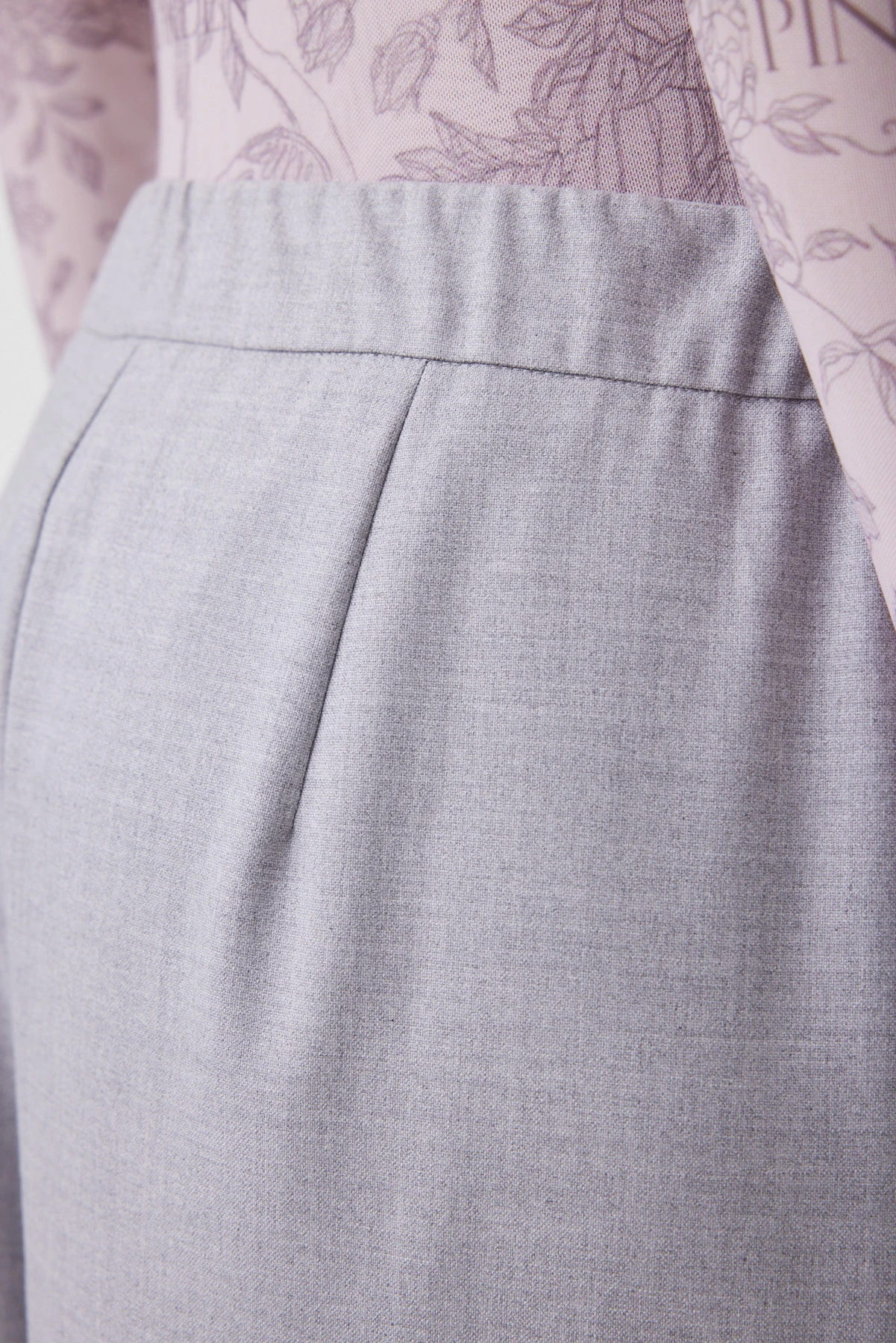 Брюки создают редкое ощущение уравновешенности: визуально собранные, но по ощущению лёгкие и расслабленные. Мягко расширяющийся силуэт напоминает классические палаццо. Эластичная вставка в поясе подстраивается под талию, а декоративный шнур с сатиновым отливом добавляет аккуратную неформальность и позволяет варьировать посадку. Плотное полотно из вискозы и полиэстера не мнётся, не пиллингуется и держит форму весь день, давая лёгкое «кашемировое» свечение. Вытачки спереди мягко вытягивают силуэт и подчёркивают талию — модель одинаково гармонична как с заправленной рубашкой, так и с объёмным верхом.