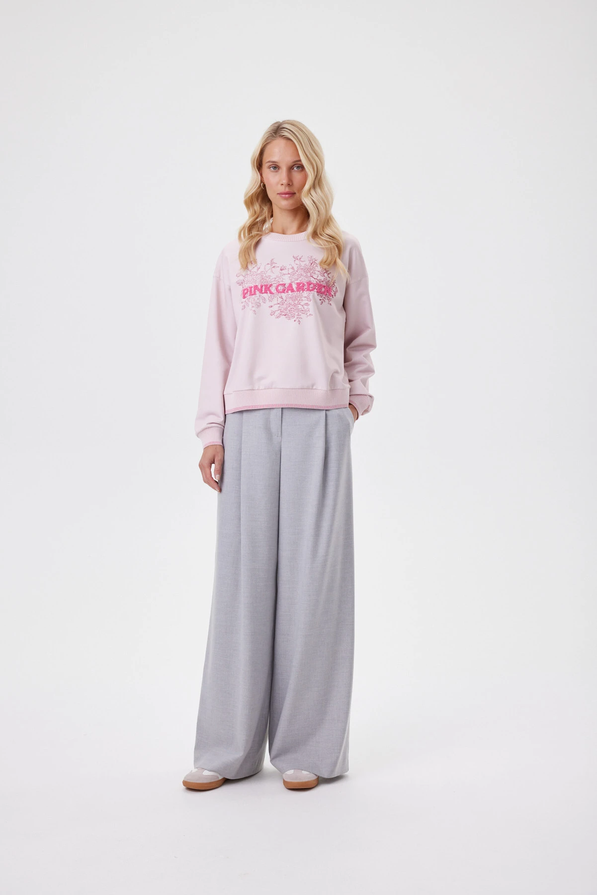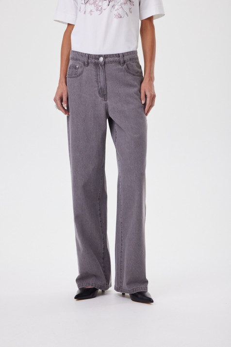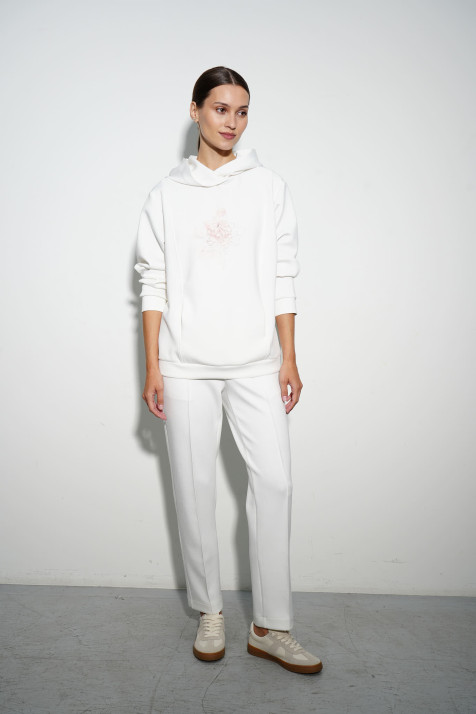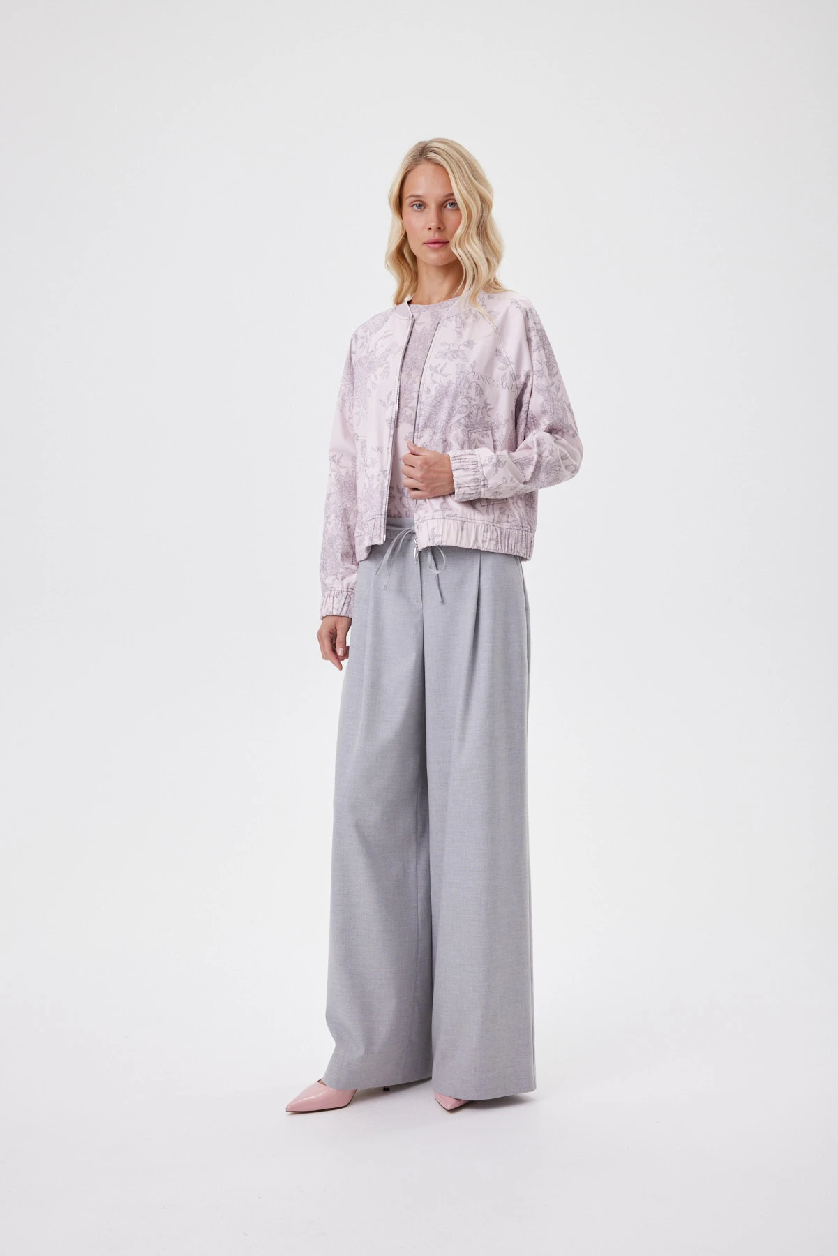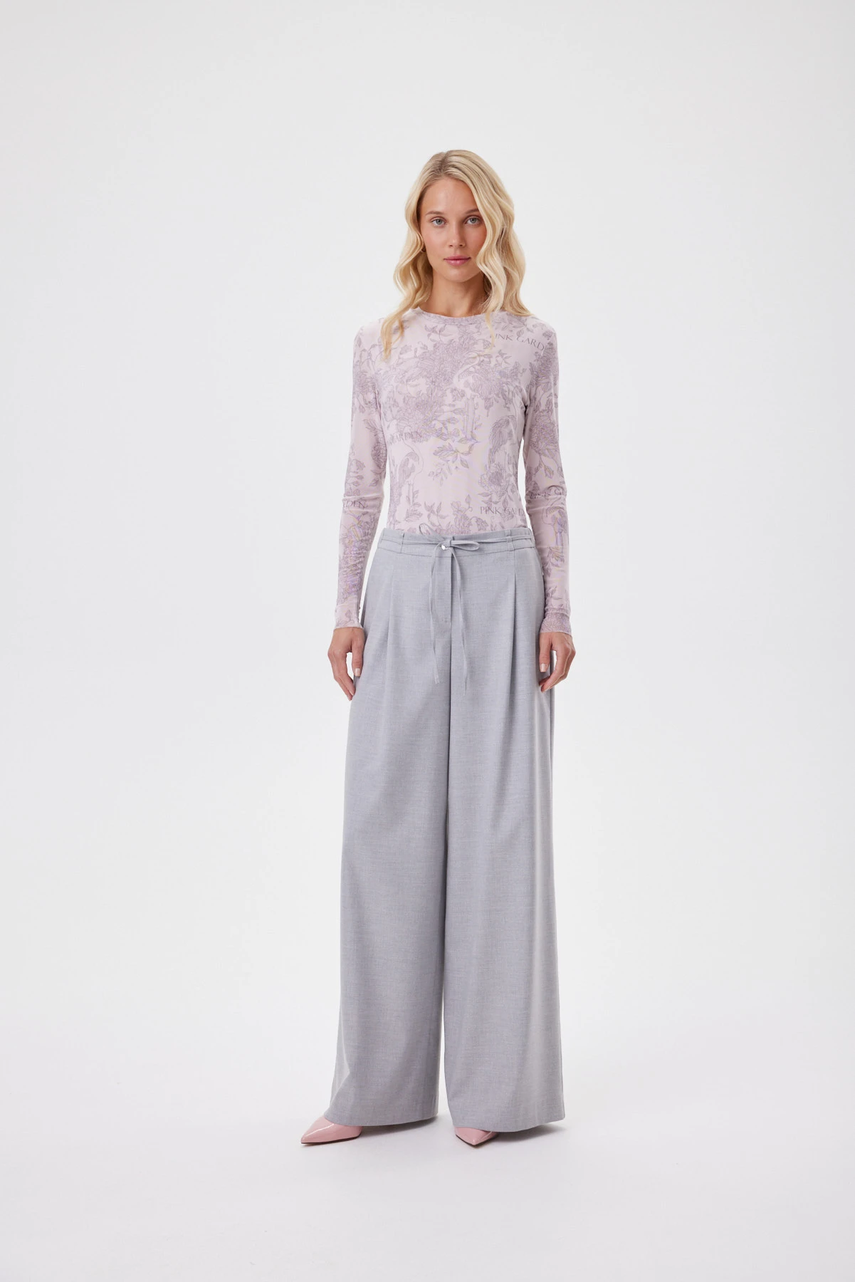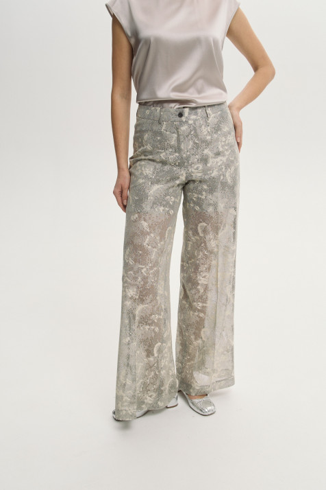 Брюки создают редкое ощущение уравновешенности: визуально собранные, но по ощущению лёгкие и расслабленные. Мягко расширяющийся силуэт напоминает классические палаццо. Эластичная вставка в поясе подстраивается под талию, а декоративный шнур с сатиновым отливом добавляет аккуратную неформальность и позволяет варьировать посадку. Плотное полотно из вискозы и полиэстера не мнётся, не пиллингуется и держит форму весь день, давая лёгкое «кашемировое» свечение. Вытачки спереди мягко вытягивают силуэт и подчёркивают талию — модель одинаково гармонична как с заправленной рубашкой, так и с объёмным верхом.